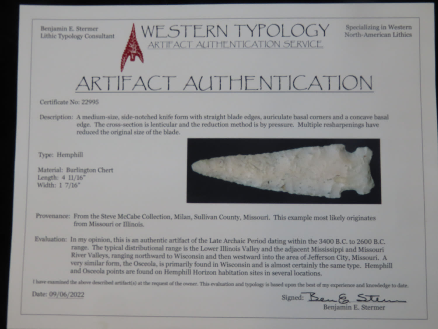 4 11/16" Hemphill Stermer COA EX Steve McCabe Coleection Found in Sullivan Co Missouri