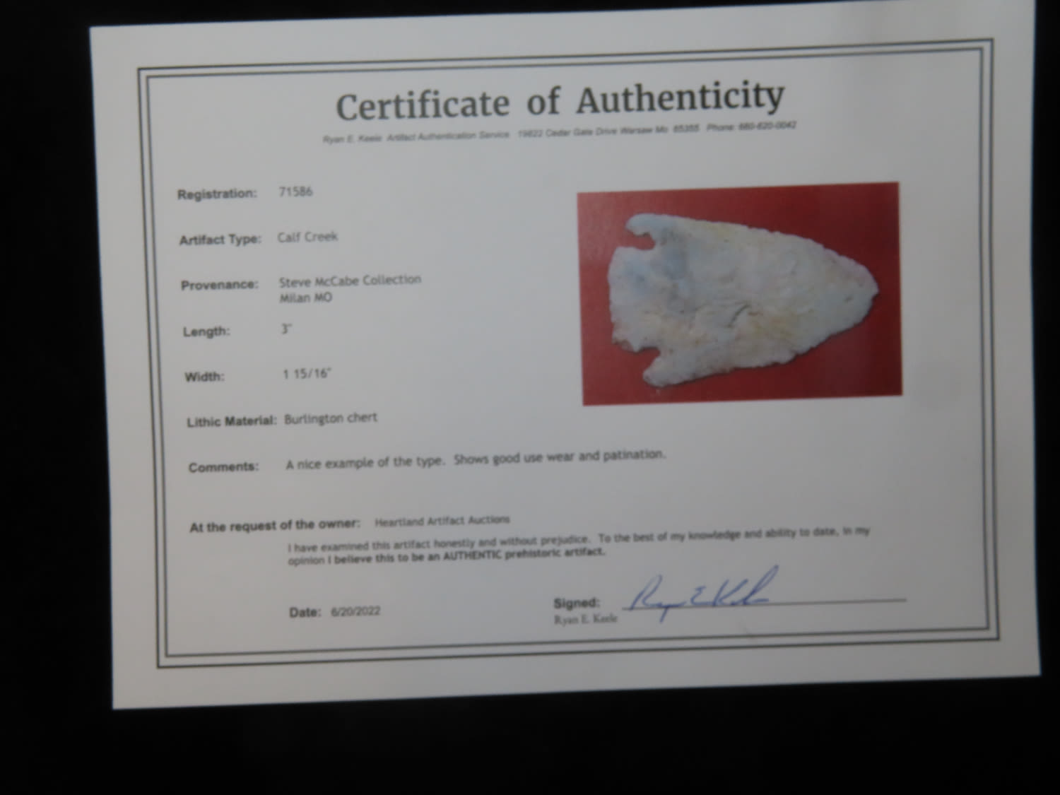 3" Calf Creek Keele COA Ex Steve McCabe Collection found in Sullivan Co. Missouri