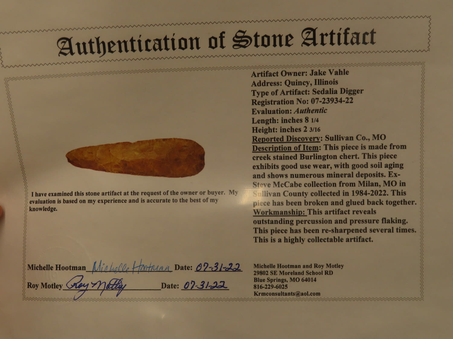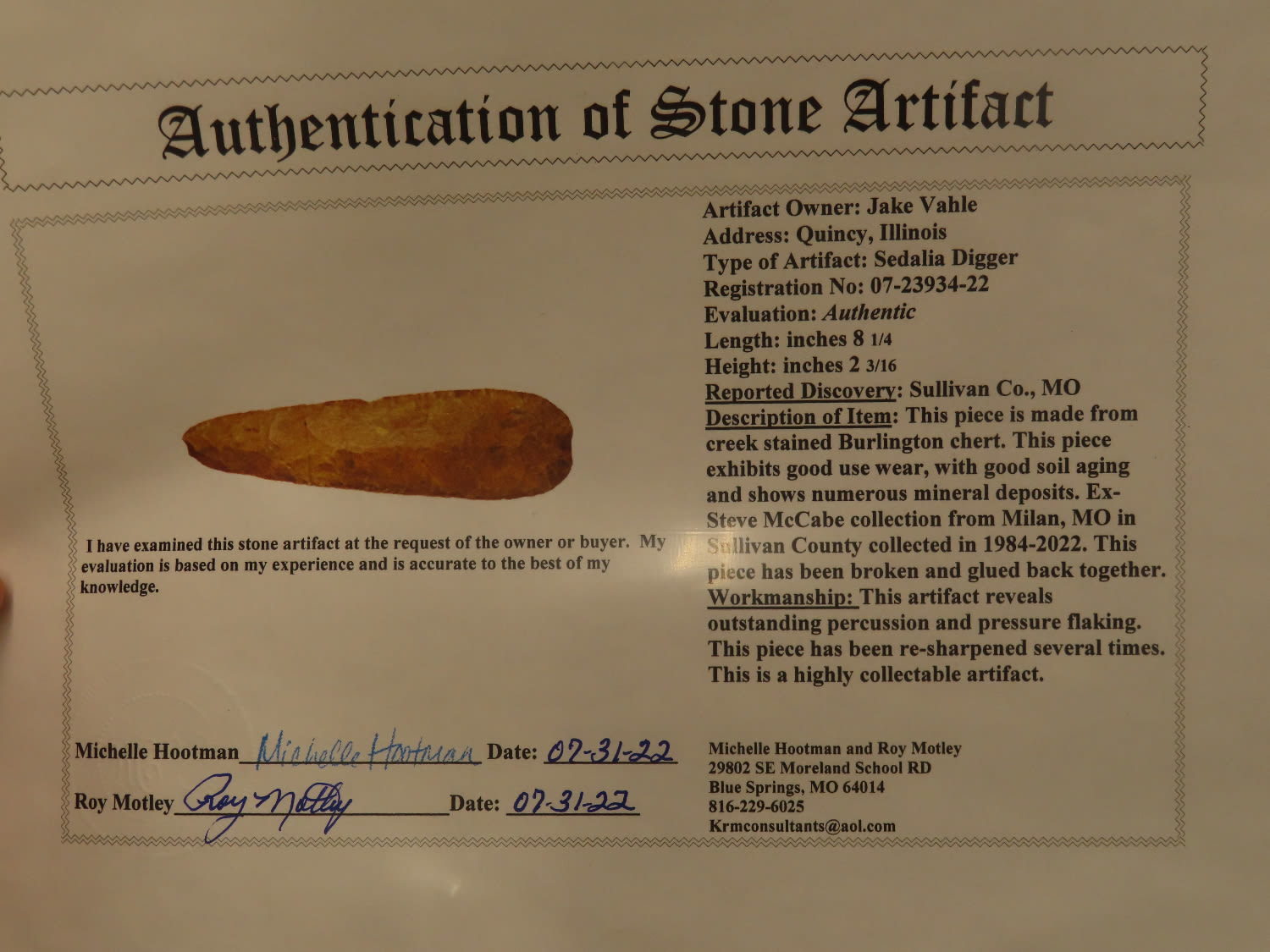 8.1/4" Sedalia Digger, Motley COA, Glued at the mid section. Ex Steve McCabe Collection