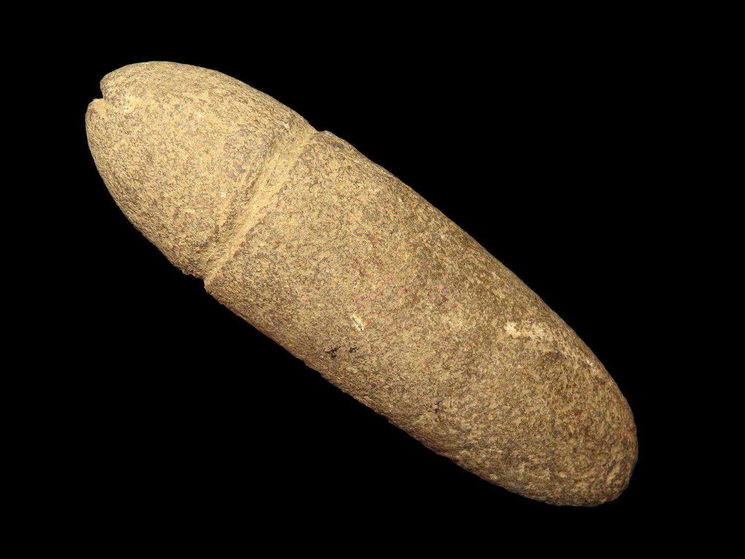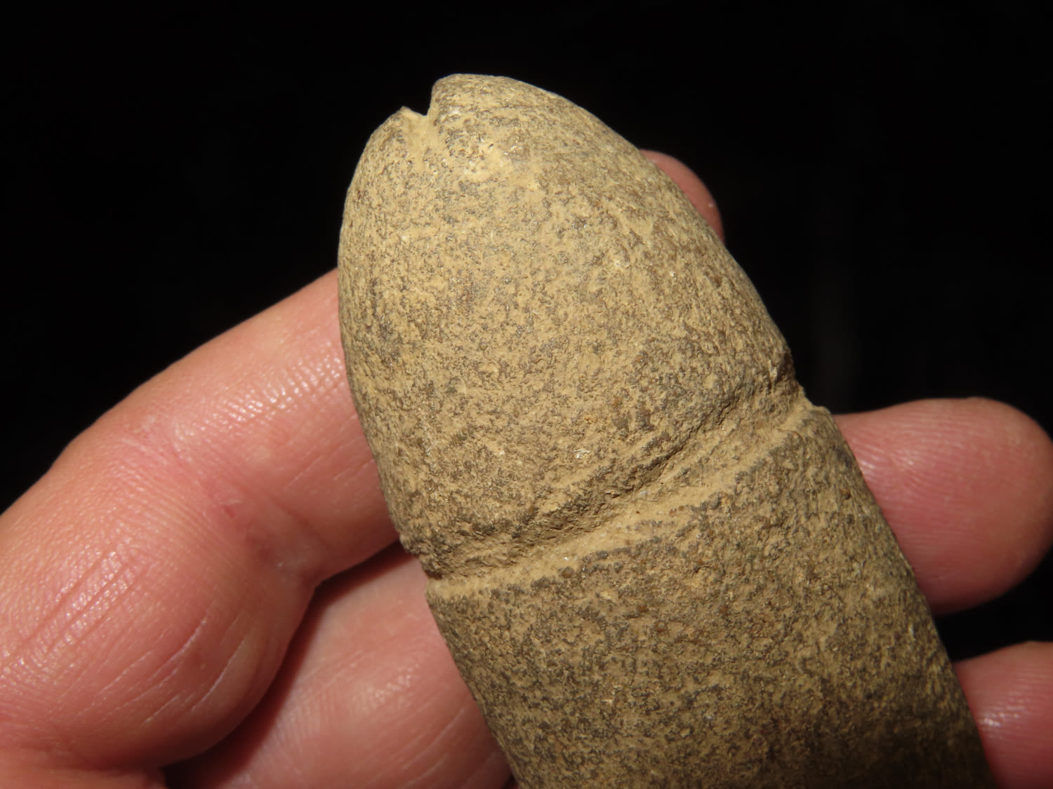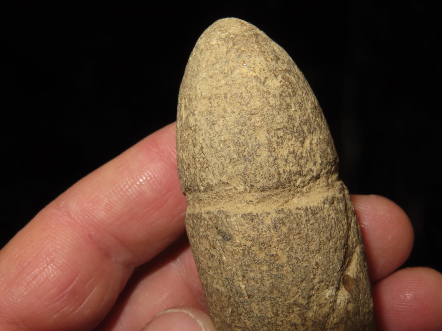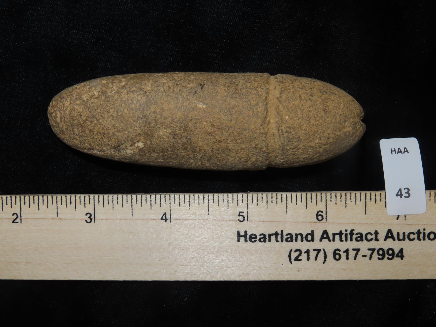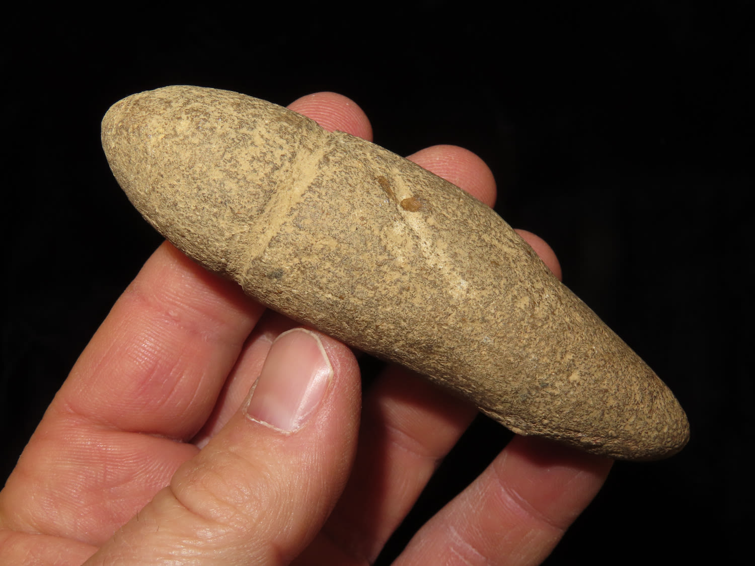 4" Plummet made from light stone with center groove and grove over the top. Found in Kentucky