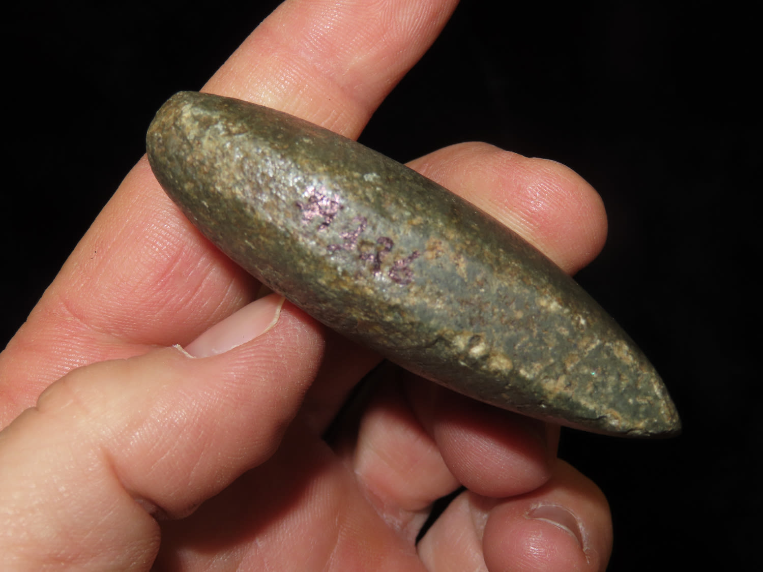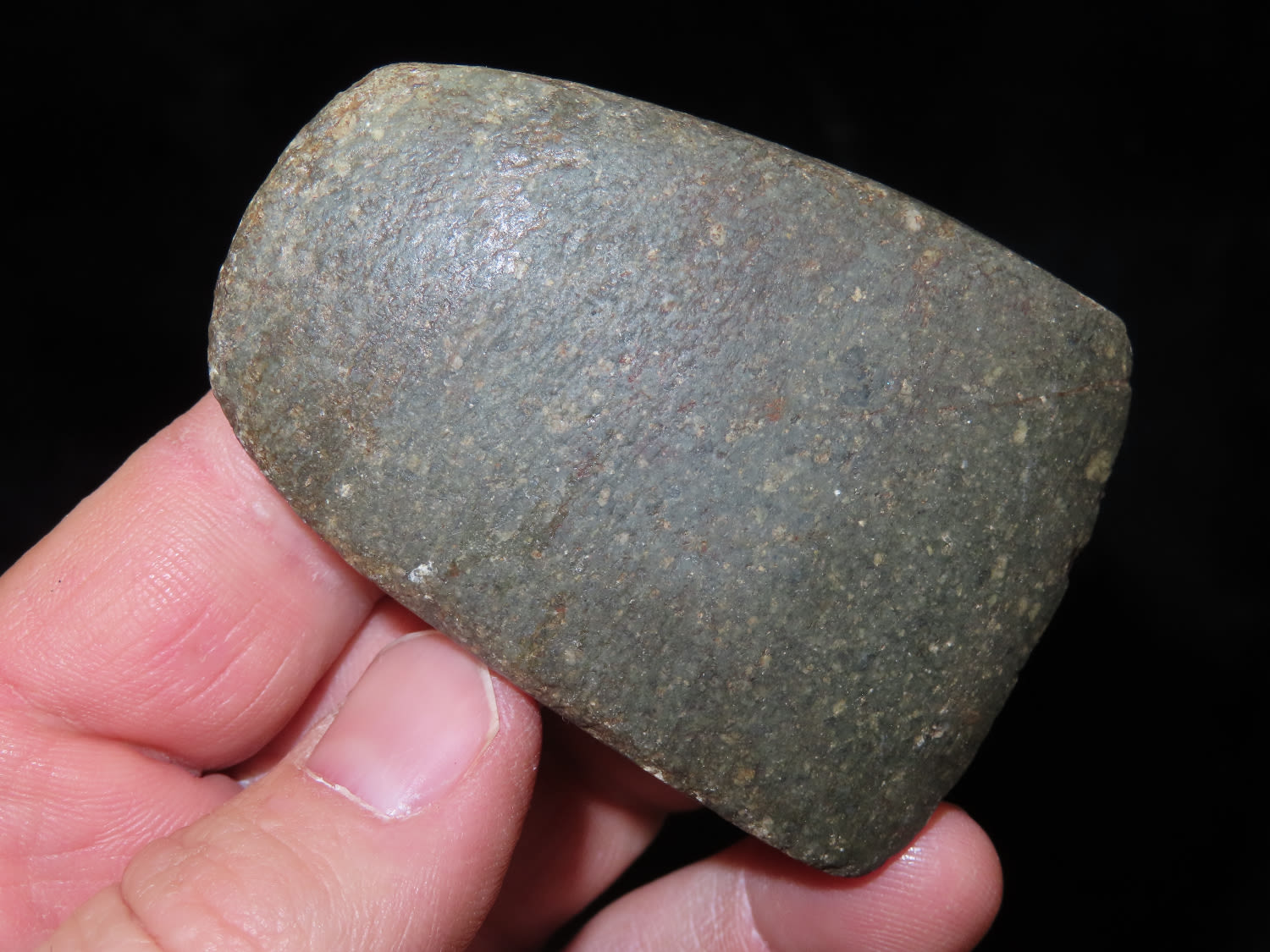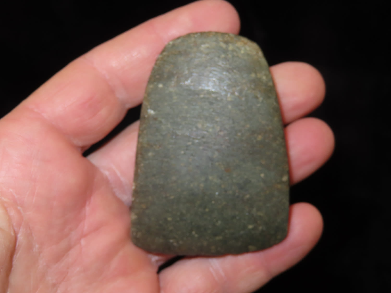 2.9/16" Square Sided Miniature Celt, Nice colored green stone with yellow specks, marked #326