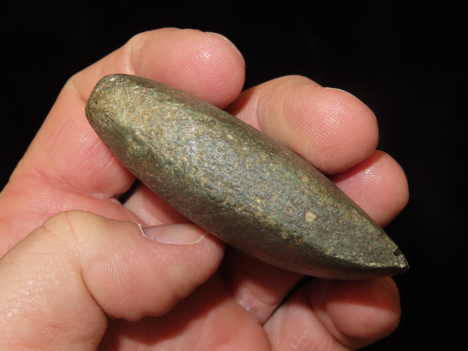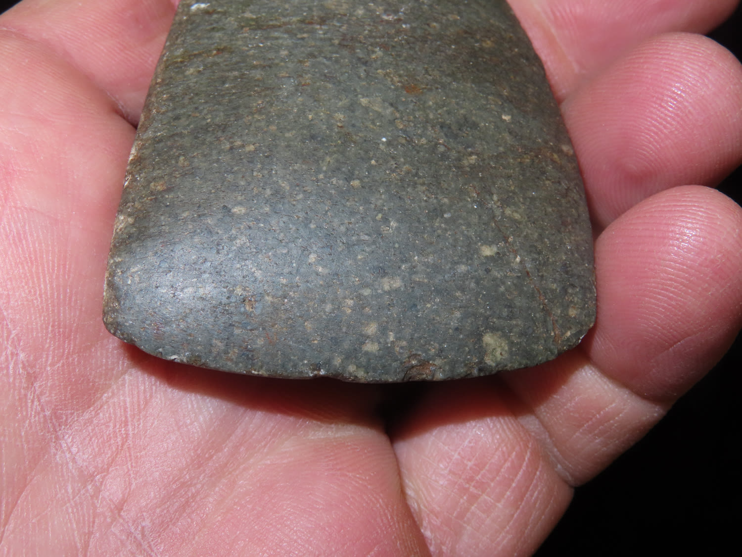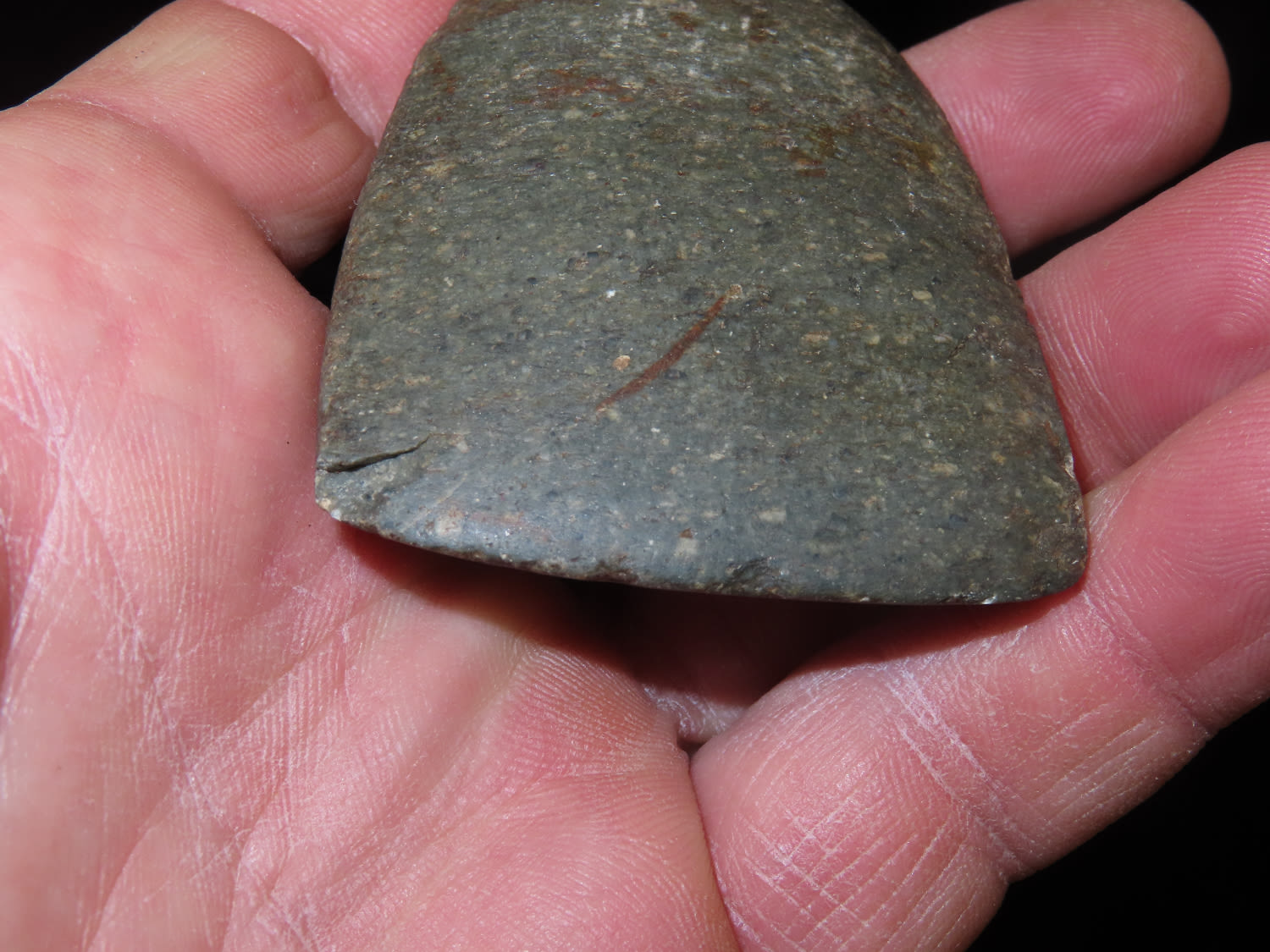 2.9/16" Square Sided Miniature Celt, Nice colored green stone with yellow specks, marked #326