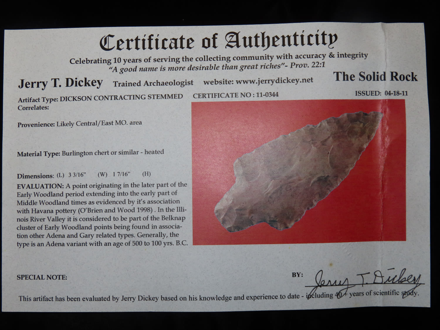 3.3/16" Dickson, Dickey COA, IL / MO This collection was the property of the Leonard & Vivian Nelson Estate. They were life long farmers in the Dekalb County Illinois area with ancestral roots in the Dekalb area for generations beginning in the mid 1800’s.