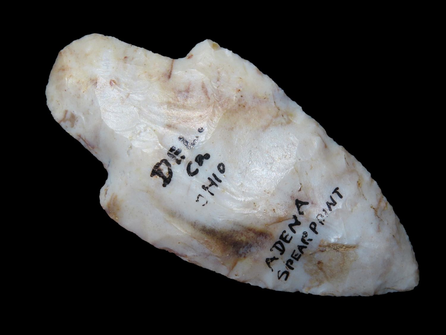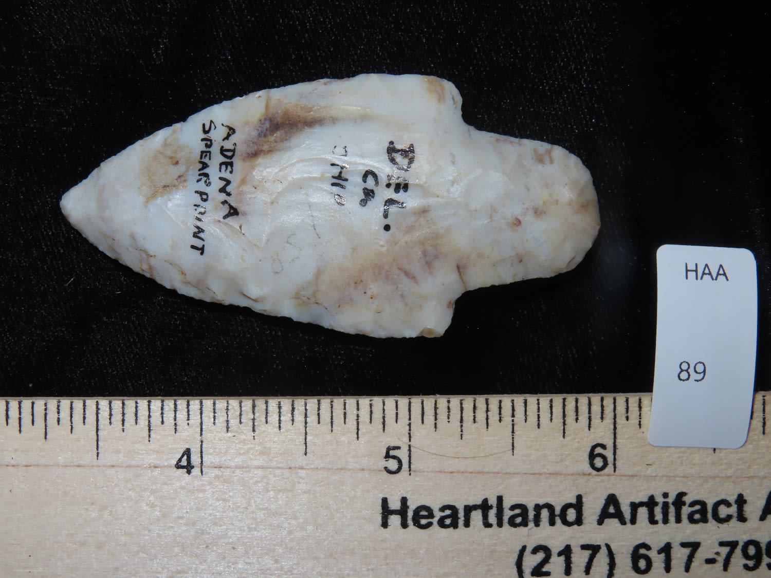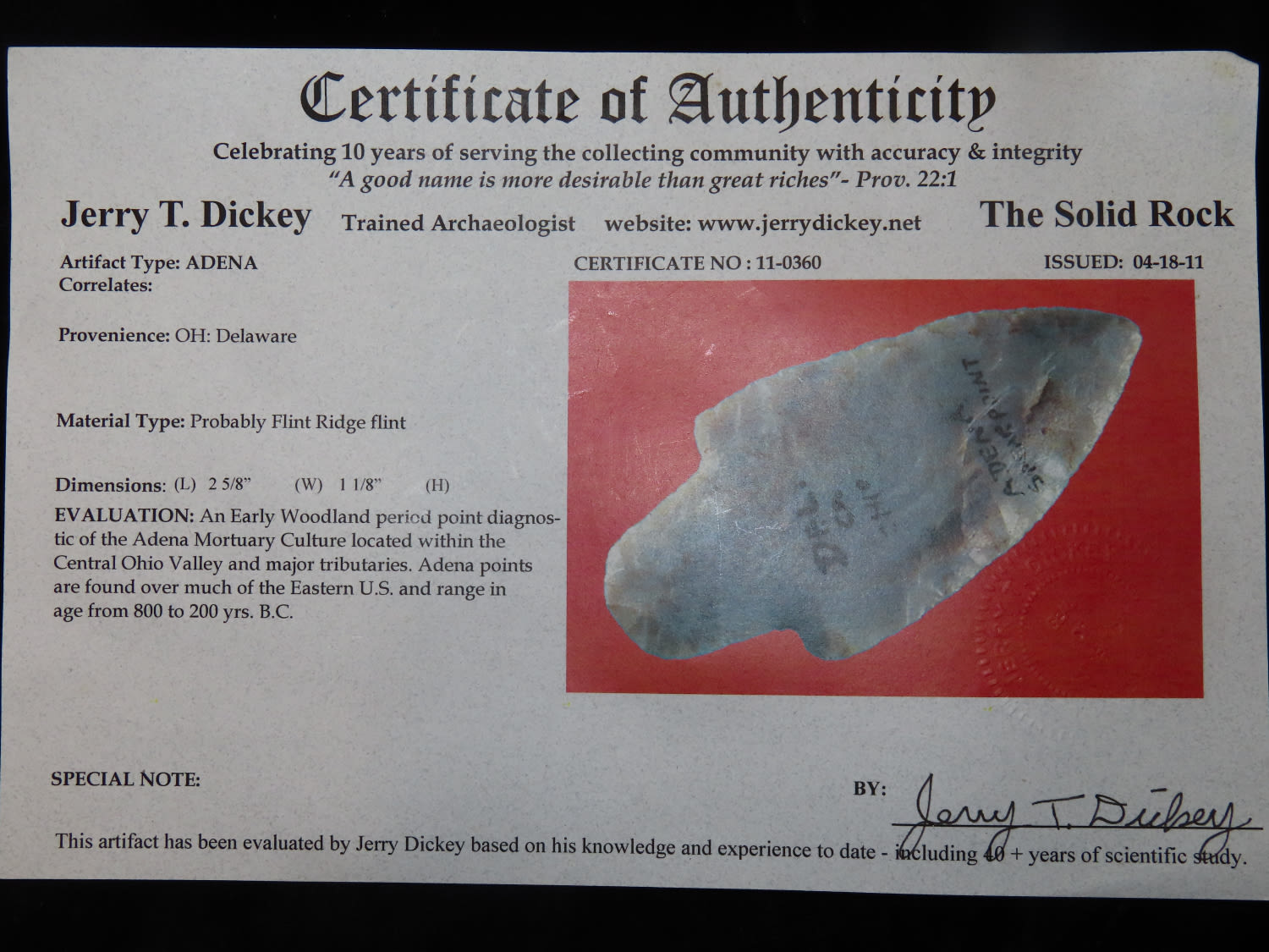 2.5/8" Flint Ridge Adena, Dickey COA, Delaware Co Ohio, This collection was the property of the Leonard & Vivian Nelson Estate. They were life long farmers in the Dekalb County Illinois area with ancestral roots in the Dekalb area for generations beginning in the mid 1800’s.