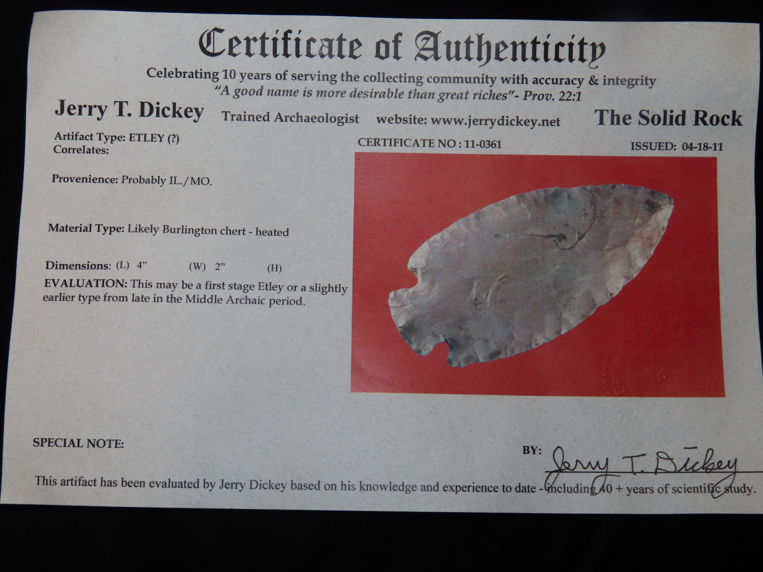 4" Etley, Dickey COA, IL / MO, This collection was the property of the Leonard & Vivian Nelson Estate. They were life long farmers in the Dekalb County Illinois area with ancestral roots in the Dekalb area for generations beginning in the mid 1800’s.