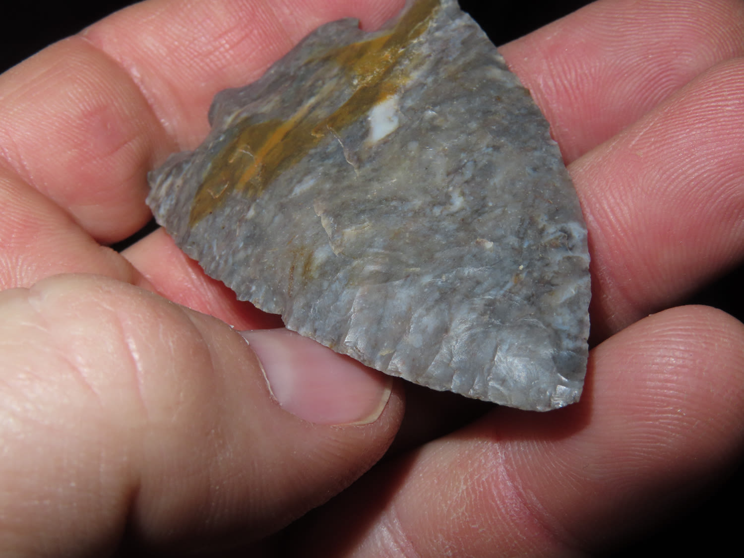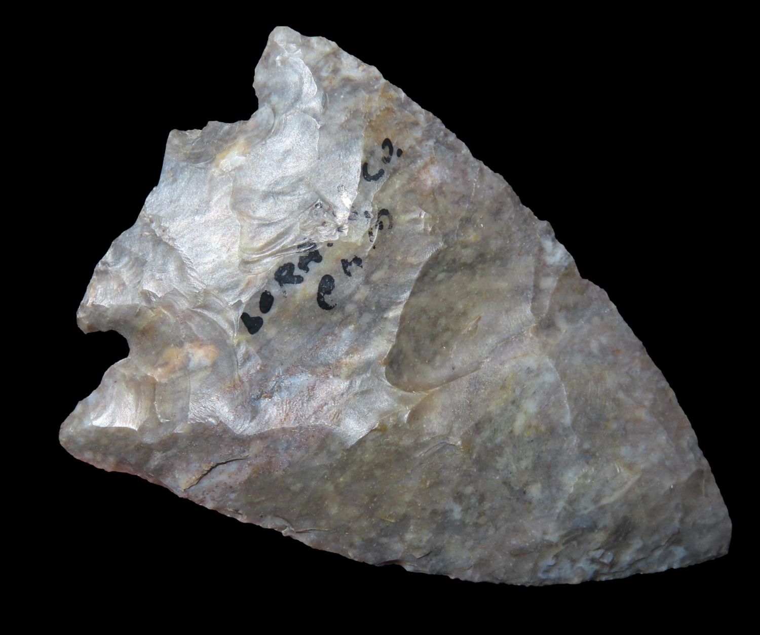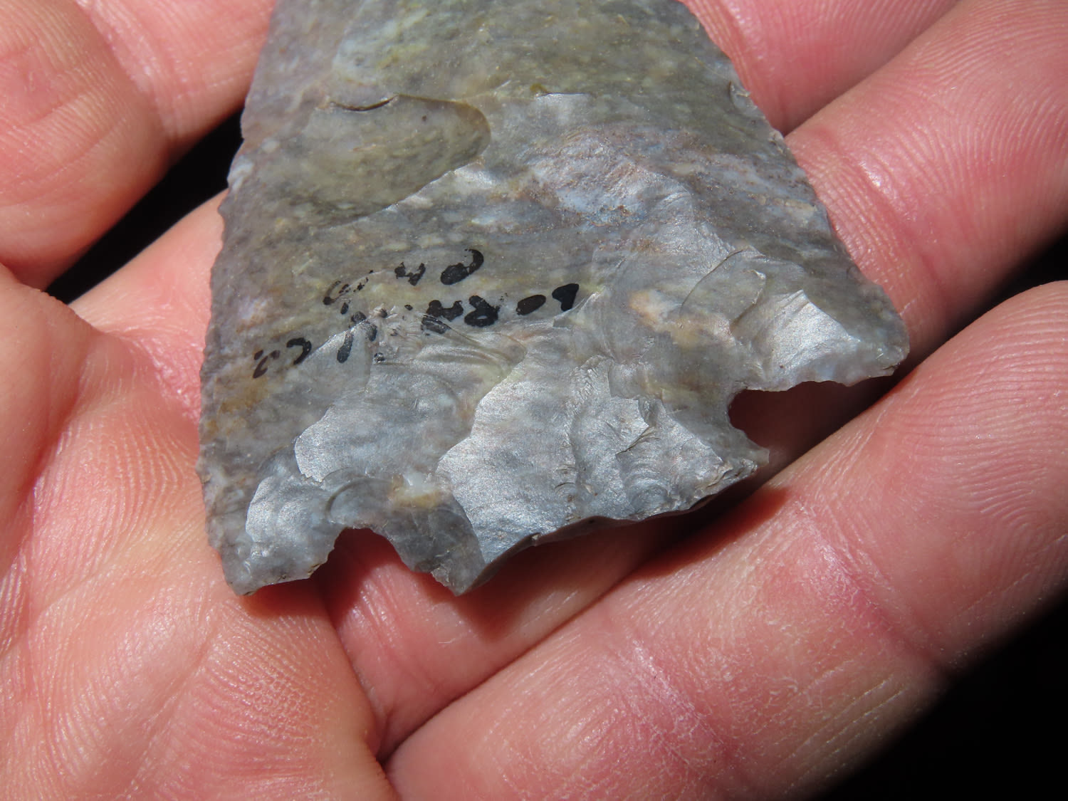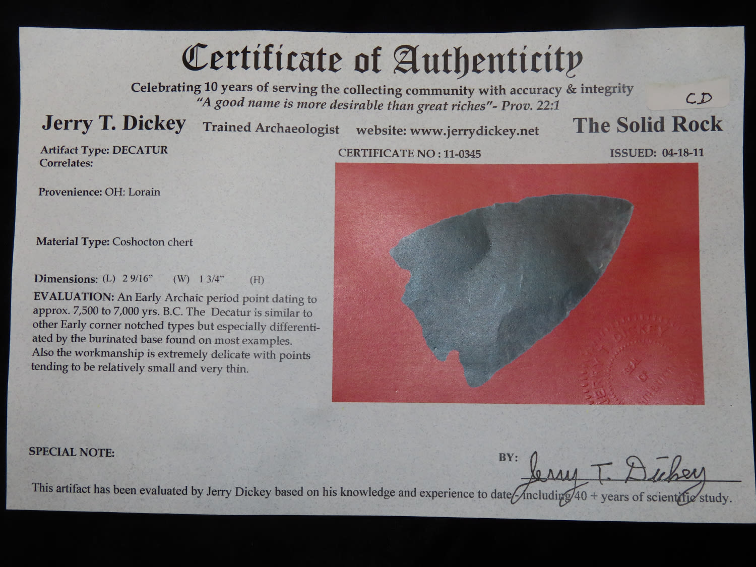 2.9/16" Decatur. Fractured base, Dickey COA, Lorain Co Ohio. This collection was the property of the Leonard & Vivian Nelson Estate. They were life long farmers in the Dekalb County Illinois area with ancestral roots in the Dekalb area for generations beginning in the mid 1800’s.