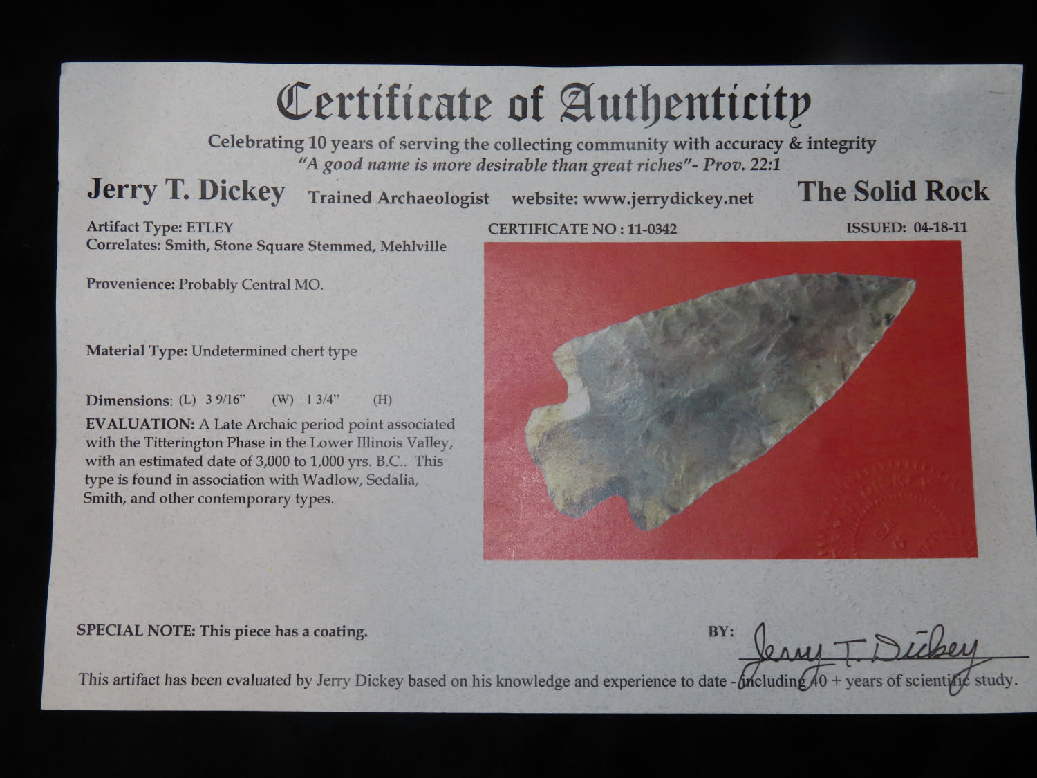 3.9/16" Etley, Dickey COA, Central MO, This collection was the property of the Leonard & Vivian Nelson Estate. They were life long farmers in the Dekalb County Illinois area with ancestral roots in the Dekalb area for generations beginning in the mid 1800’s.