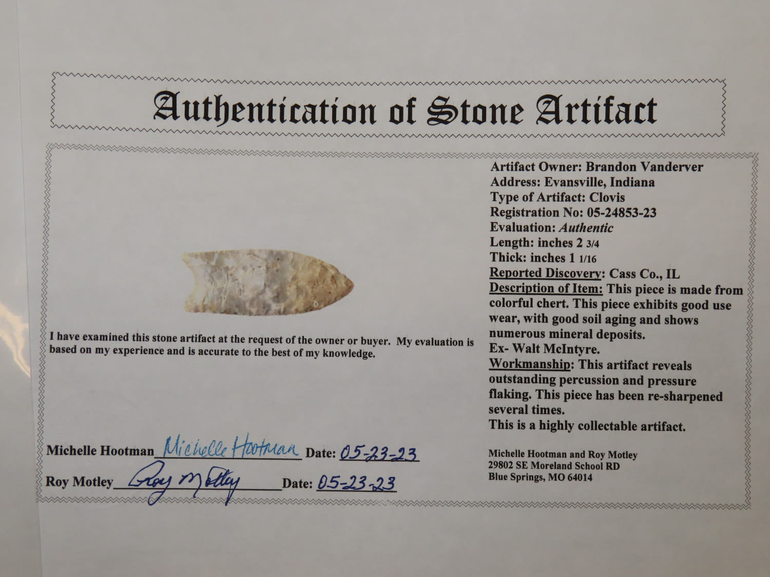 2 3/4″ Clovis, Motley COA, found in Cass Co Illinois, Ex Walt McItyre Collection