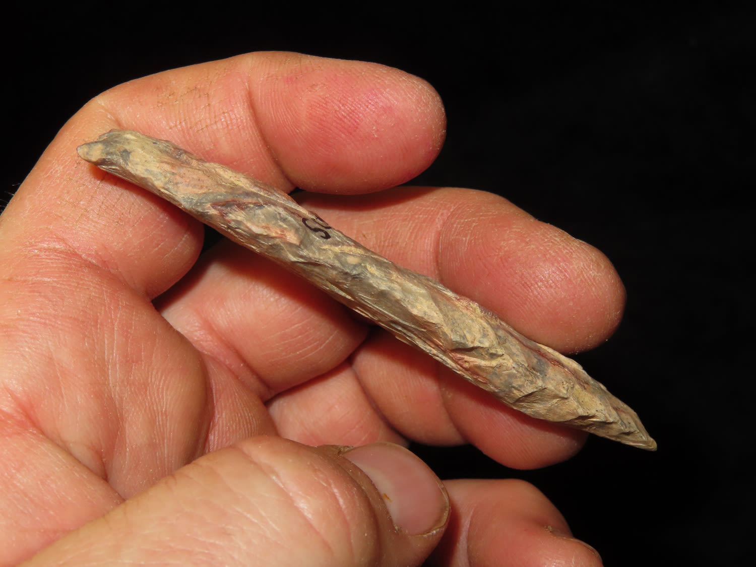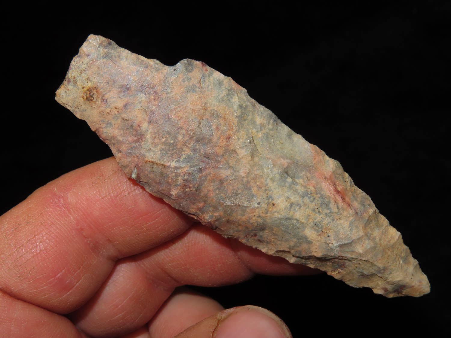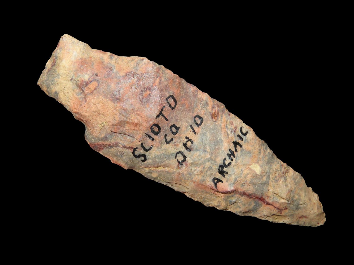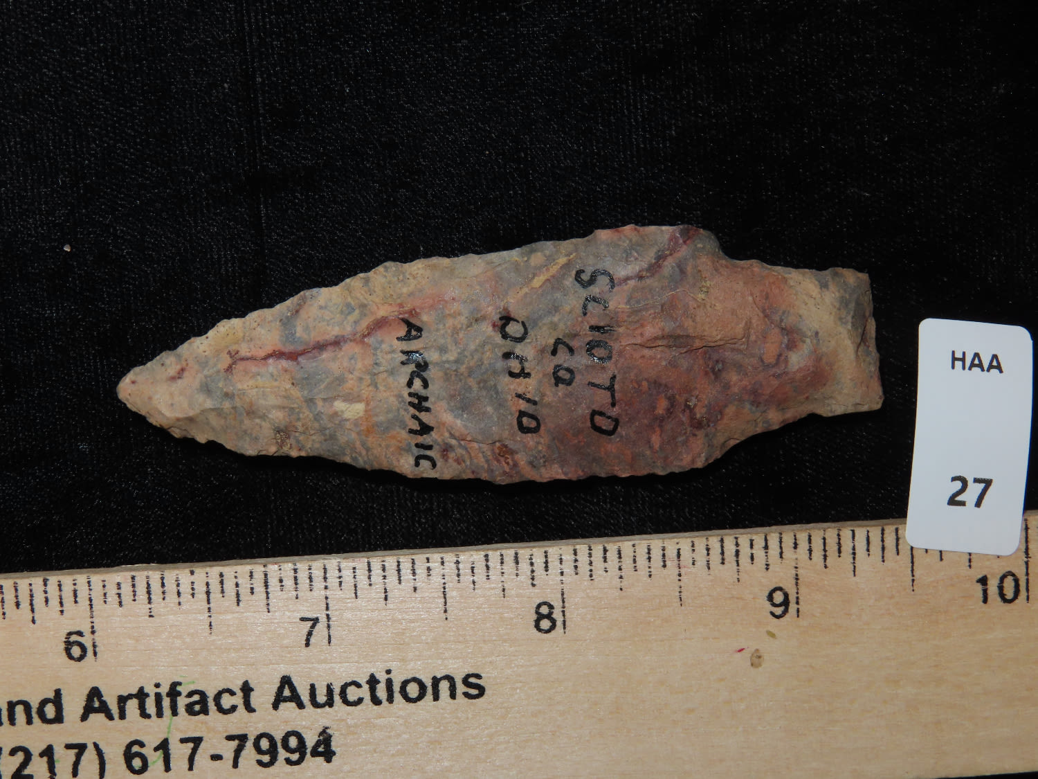 3.1/4″ Flint Ridge Adena, Scioto Co Ohio, Ex Bill Kacer Family Collection-Majority of his relics were found by family, or purchased from Stan Copeland in the 60’s. The Kacer Family owned a landscaping business in Northern Illinois near Deerfiled for several generations