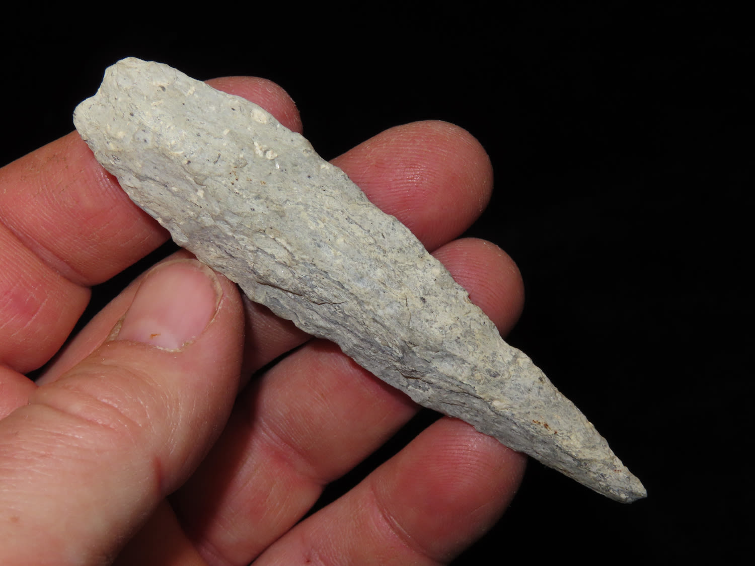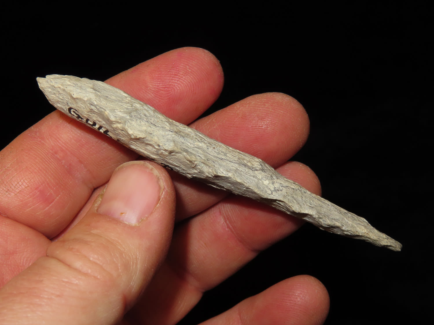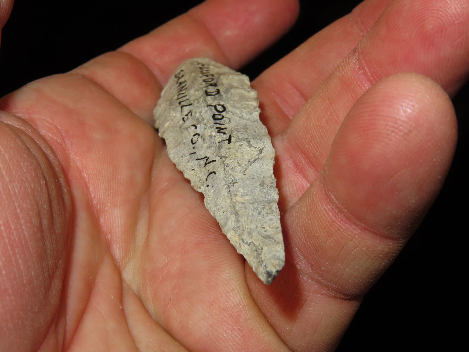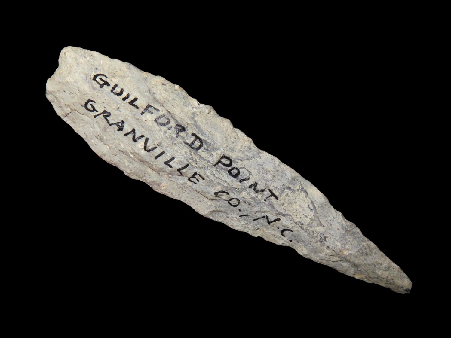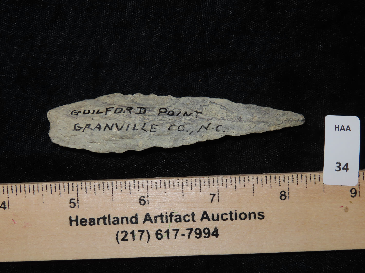 3.5/8″ Guilford Point, Grandville Co N.C. , Ex Bill Kacer Family Collection-Majority of his relics were found by family, or purchased from Stan Copeland in the 60’s. The Kacer Family owned a landscaping business in Northern Illinois near Deerfiled for several generations.