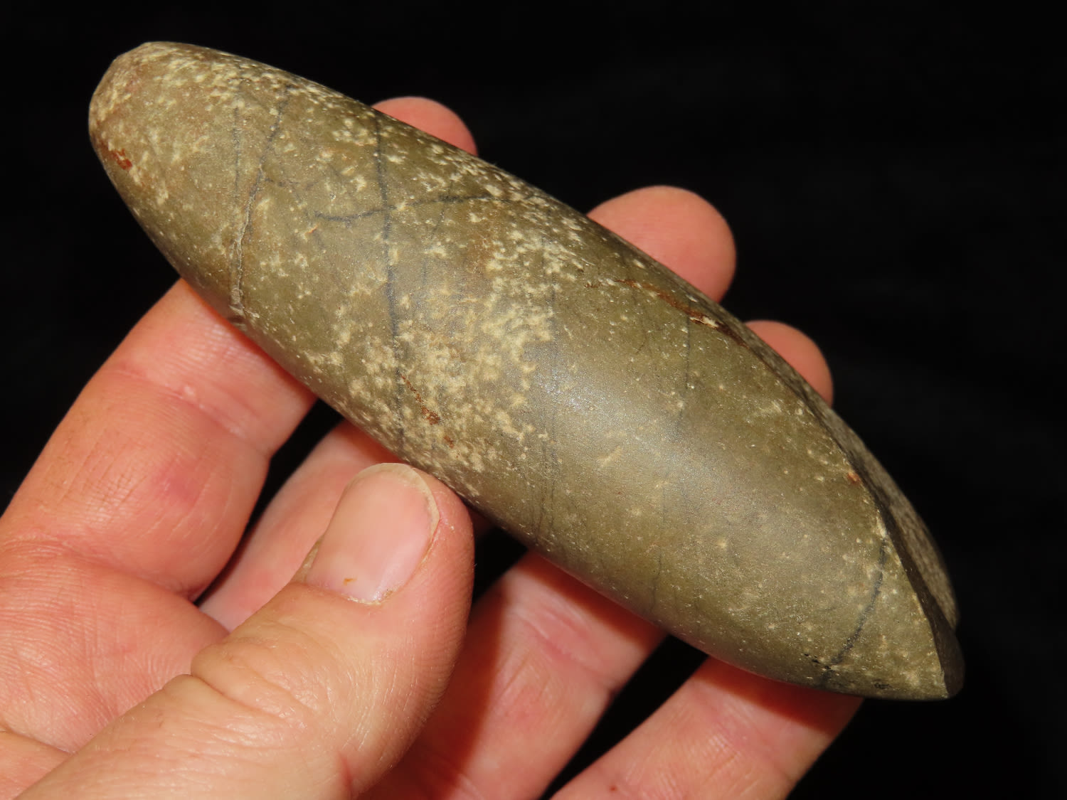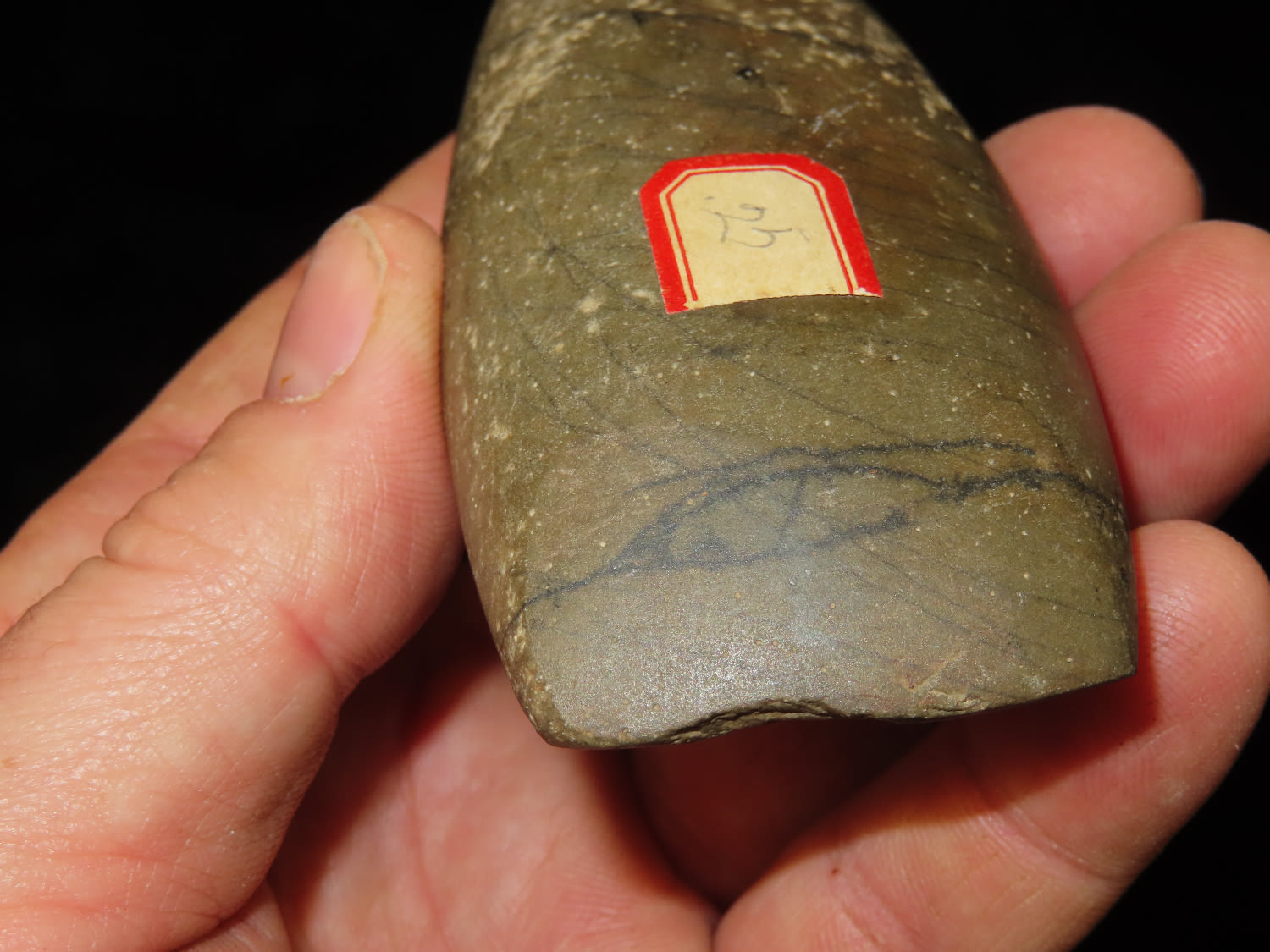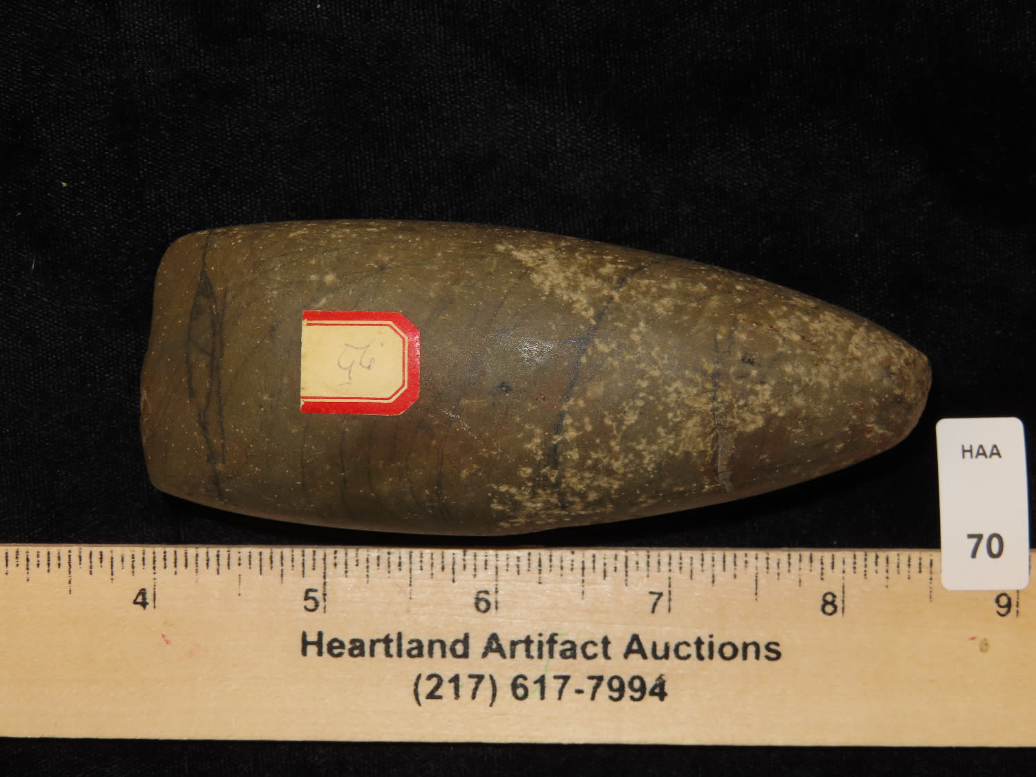 4.3/8″ Slate Celt, Ex Bill Kacer Family Collection-Majority of his relics were found by family, or purchased from Stan Copeland in the 60’s. The Kacer Family owned a landscaping business in Northern Illinois near Deerfiled for several generations.