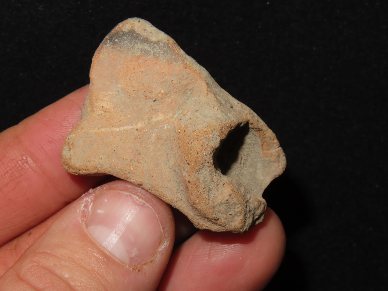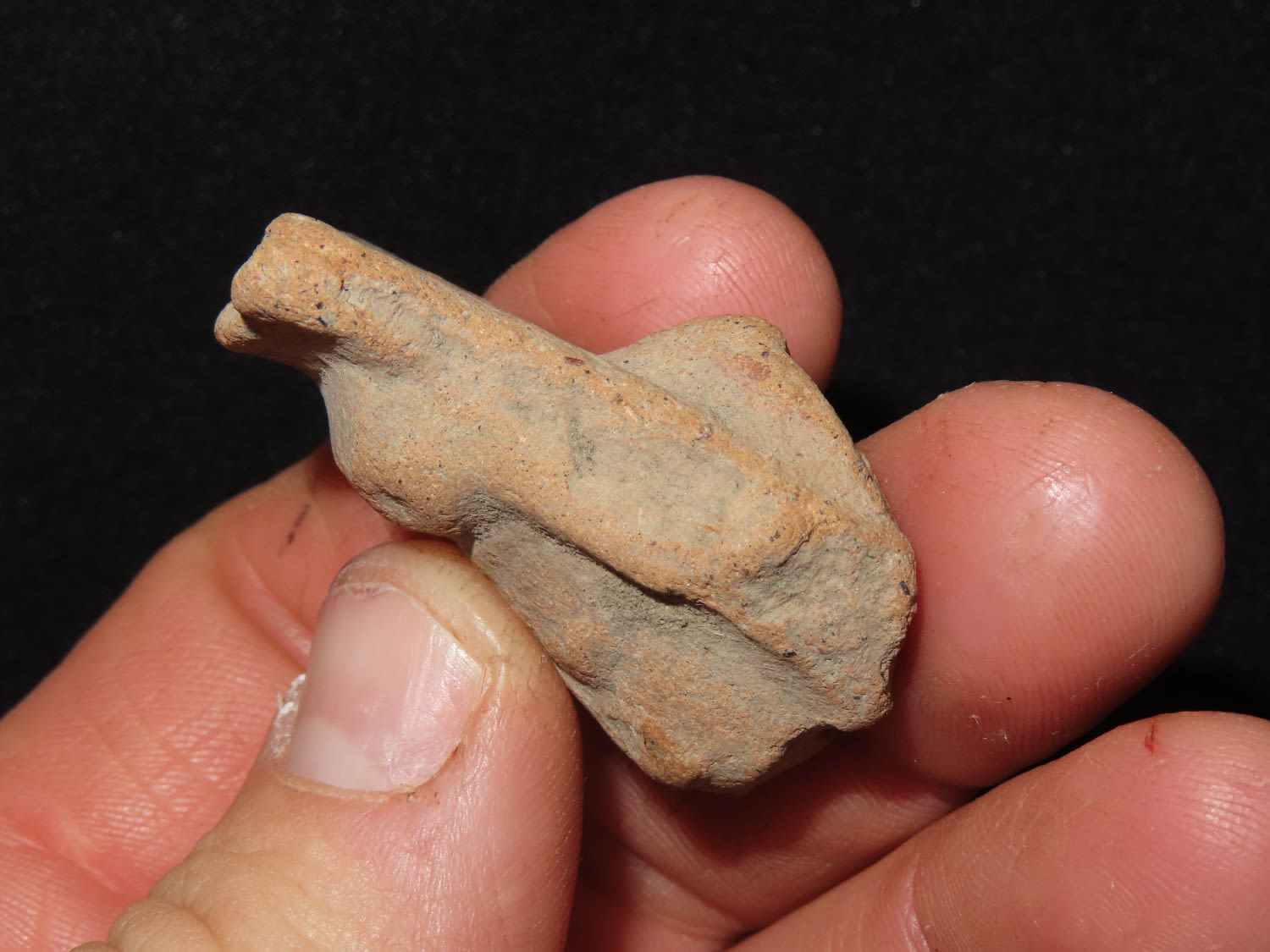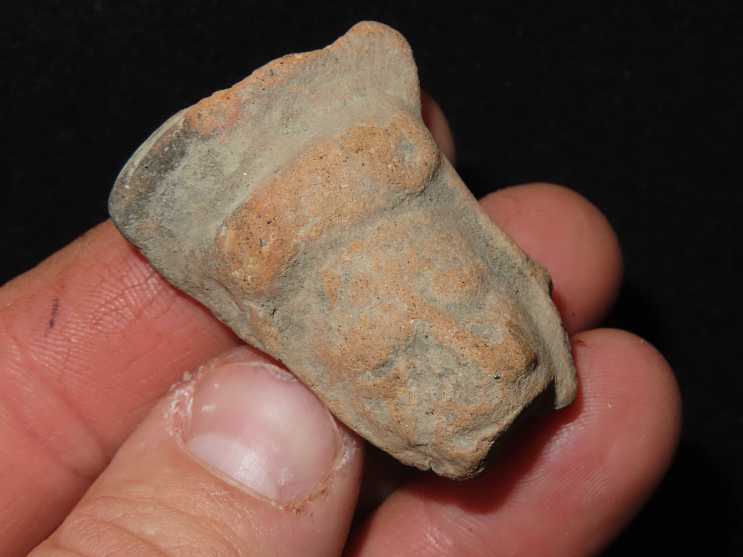 1.1/2″ Pottery Head Effigy, Pre Columbian, South American, Ex Bill Kacer Family Collection-Majority of his relics were found by family, or purchased from Stan Copeland in the 60’s. The Kacer Family owned a landscaping business in Northern Illinois near Deerfiled for several generations.