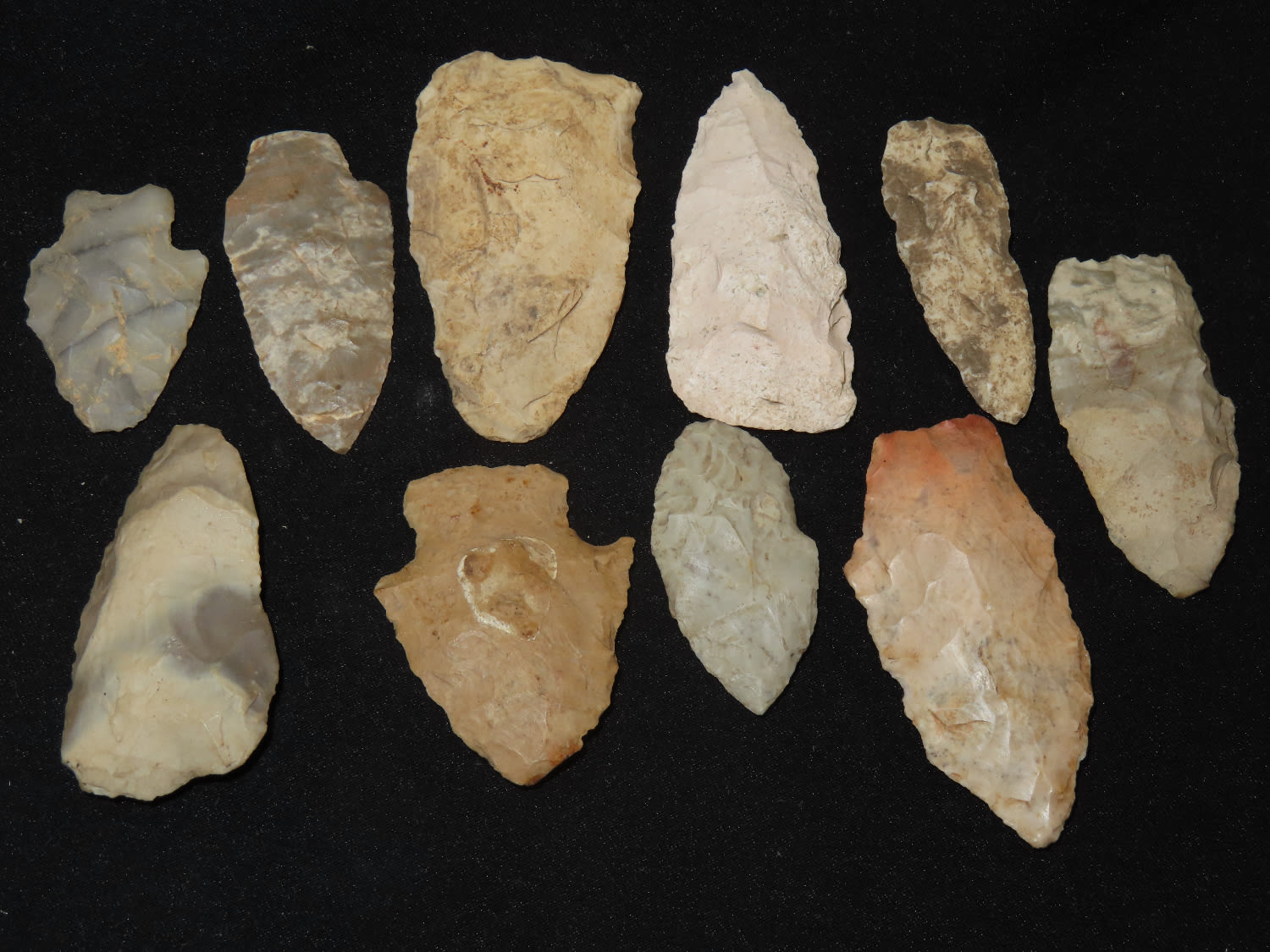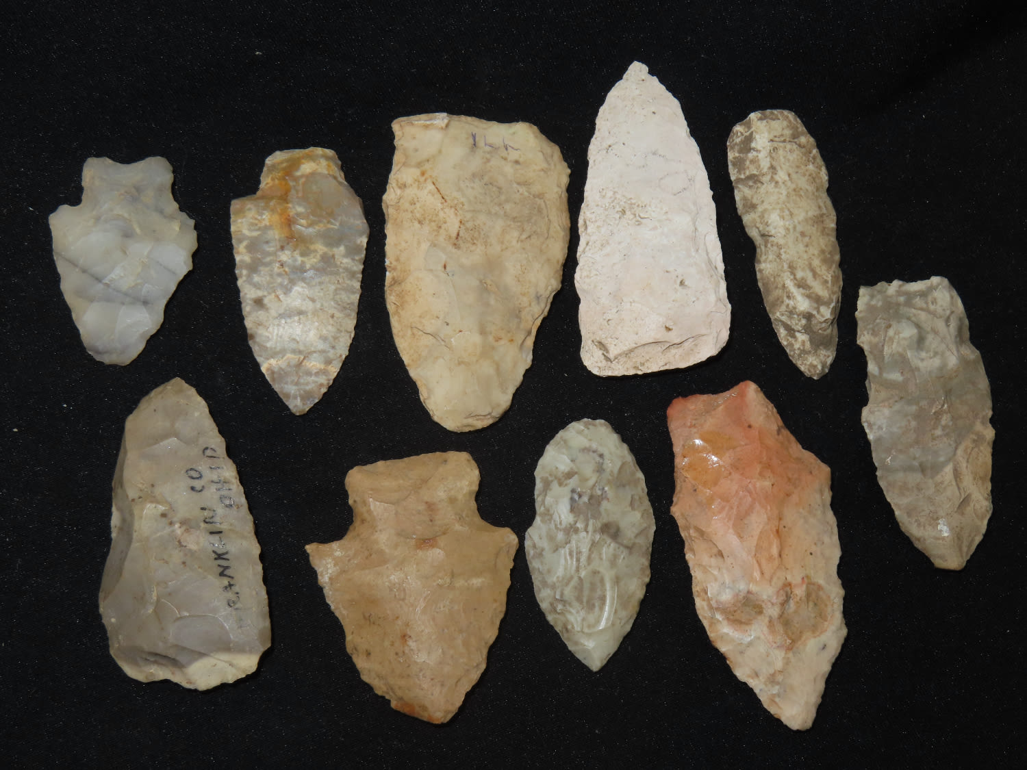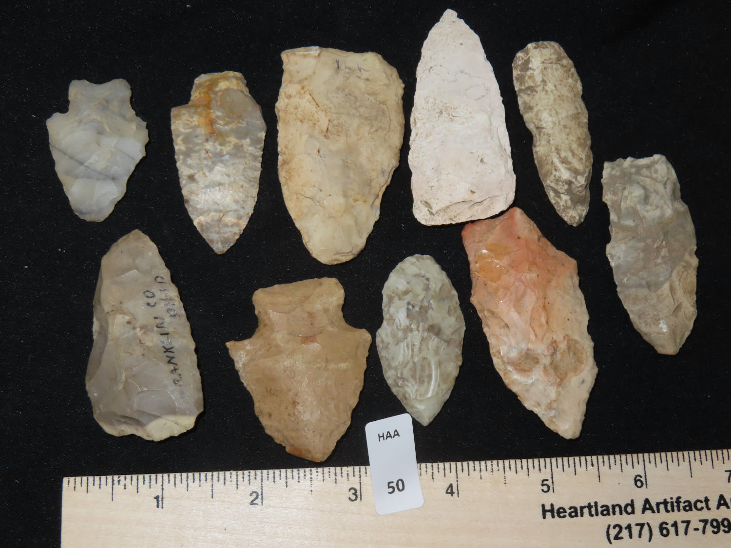 Grouping of Arrowheads, Ex Bill Kacer Family Collection-Majority of his relics were found by family, or purchased from Stan Copeland in the 60’s. The Kacer Family owned a landscaping business in Northern Illinois near Deerfiled for several generations.