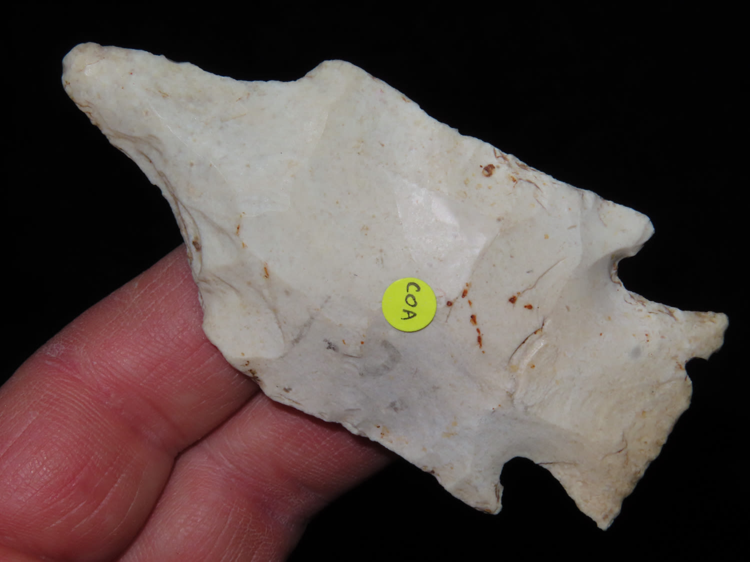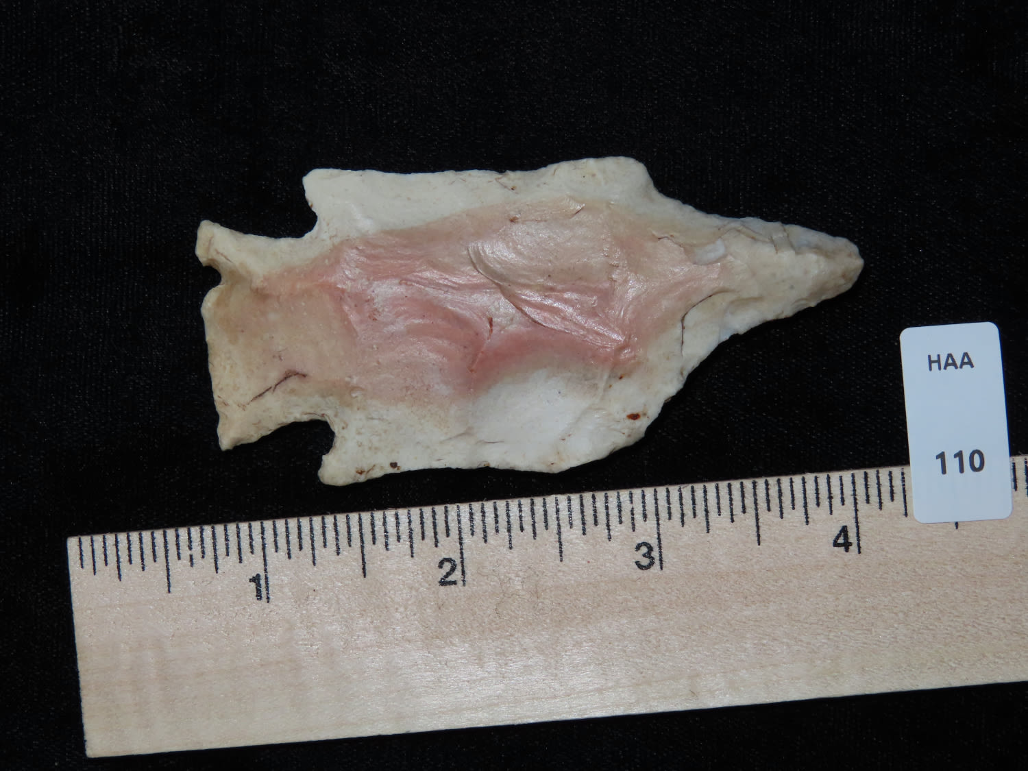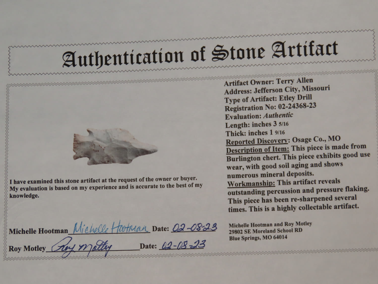 3 5/16″ COLORFUL ETLEY DRILL, MOTLEY COA, FOUND IN OSAGE COUNTY MISSOURI, BEAUTIFUL EXAMPLE, INDIAN ARROWHEAD, ARTIFACT