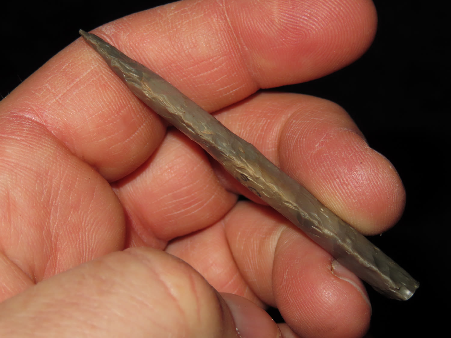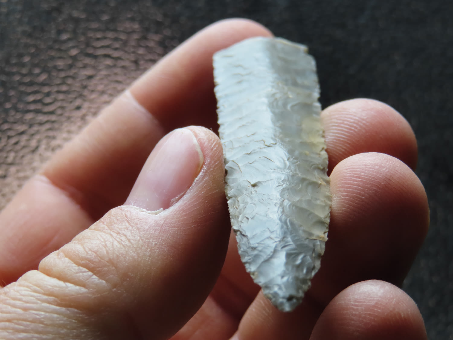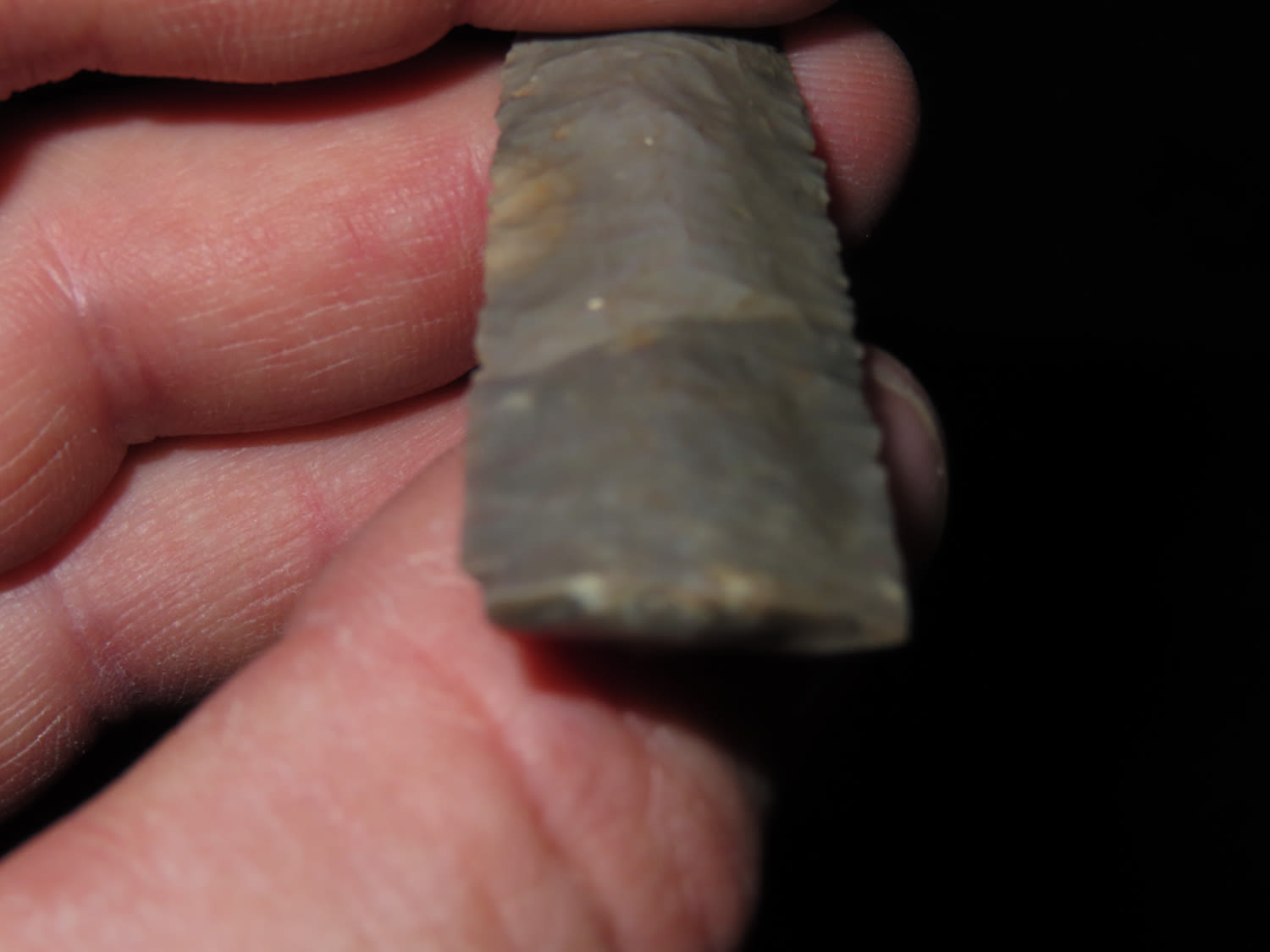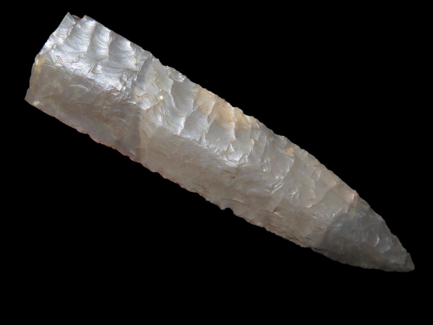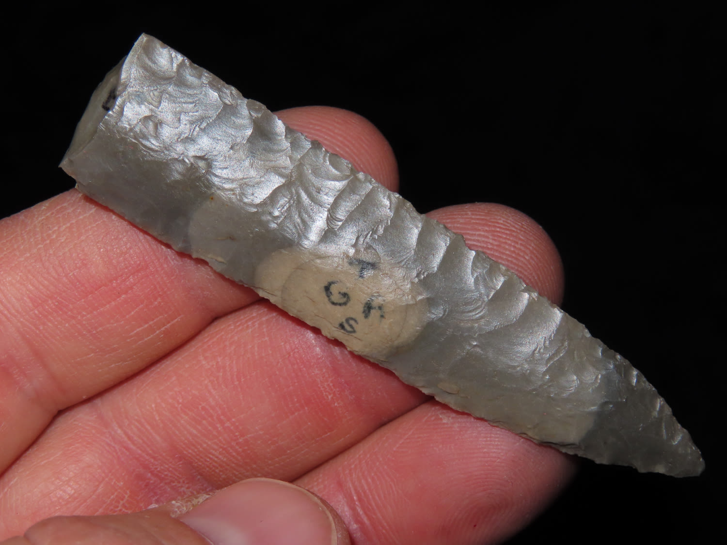 2 7/8″ CODY COMPLEX EDEN FROM OKLAHOMA, BASE ANCIENTLY SNAPPED, HEAVILY GROUND ON LAST 1/2″ OF BASAL EDGE, IMPECCABLE FLAKING