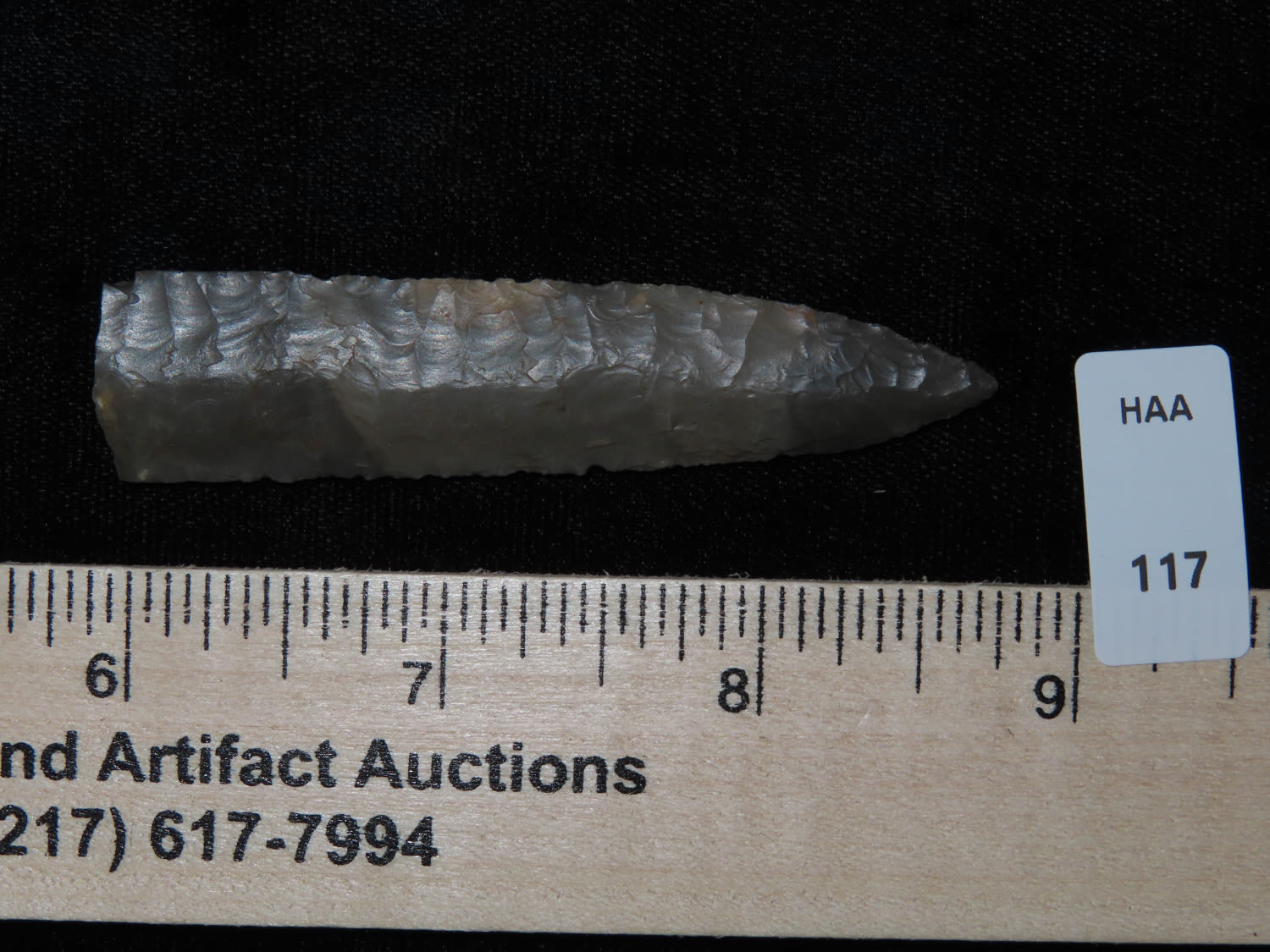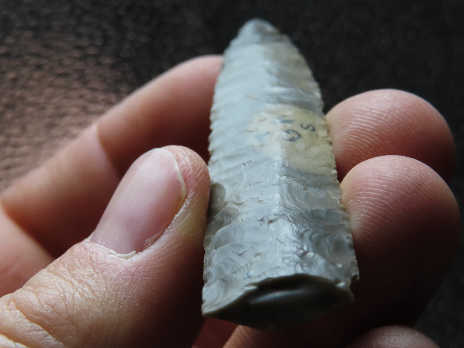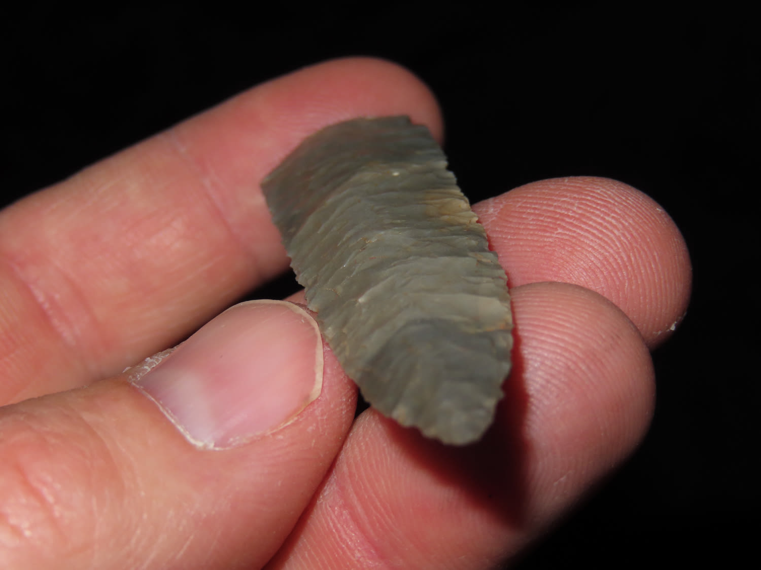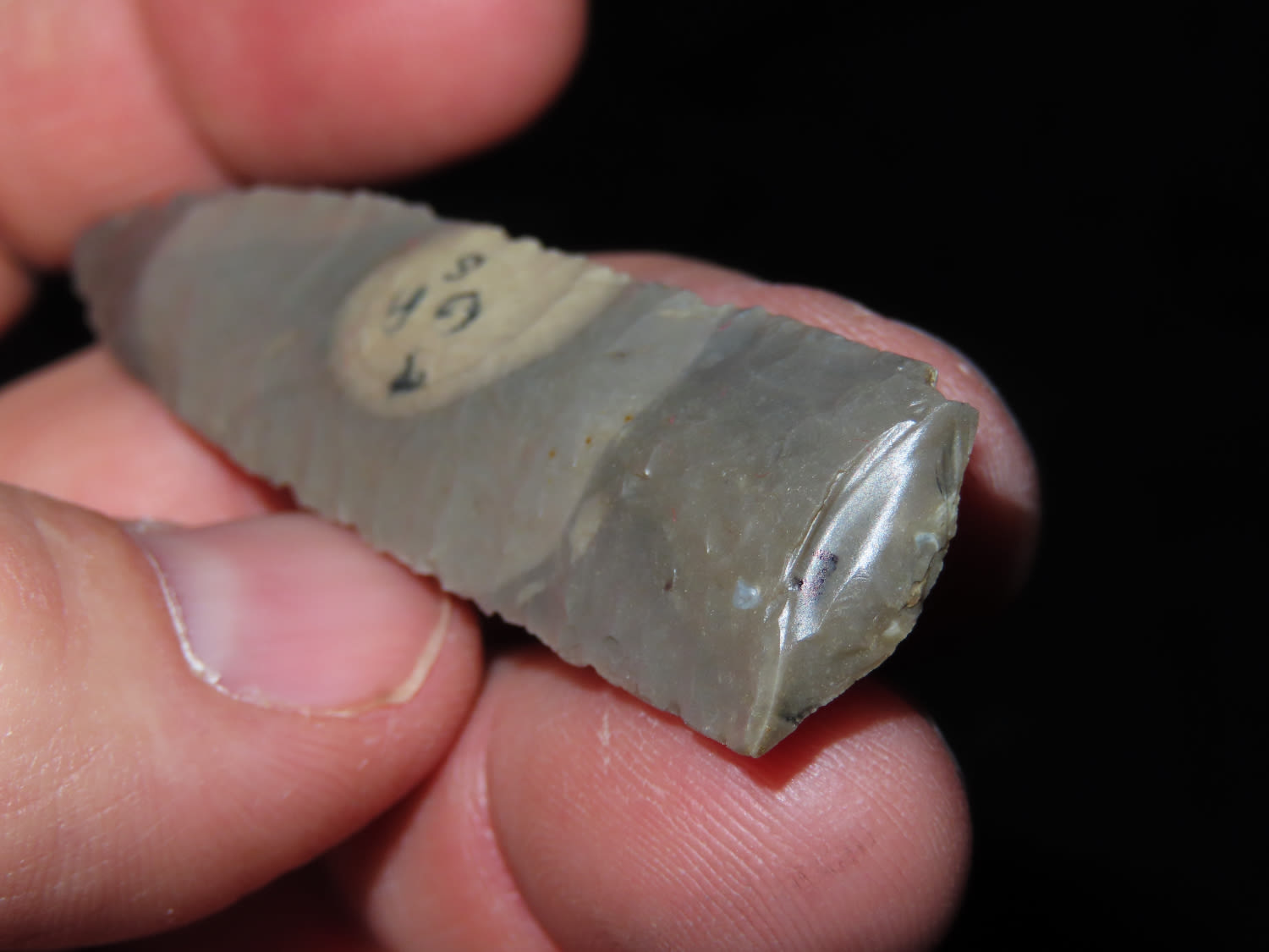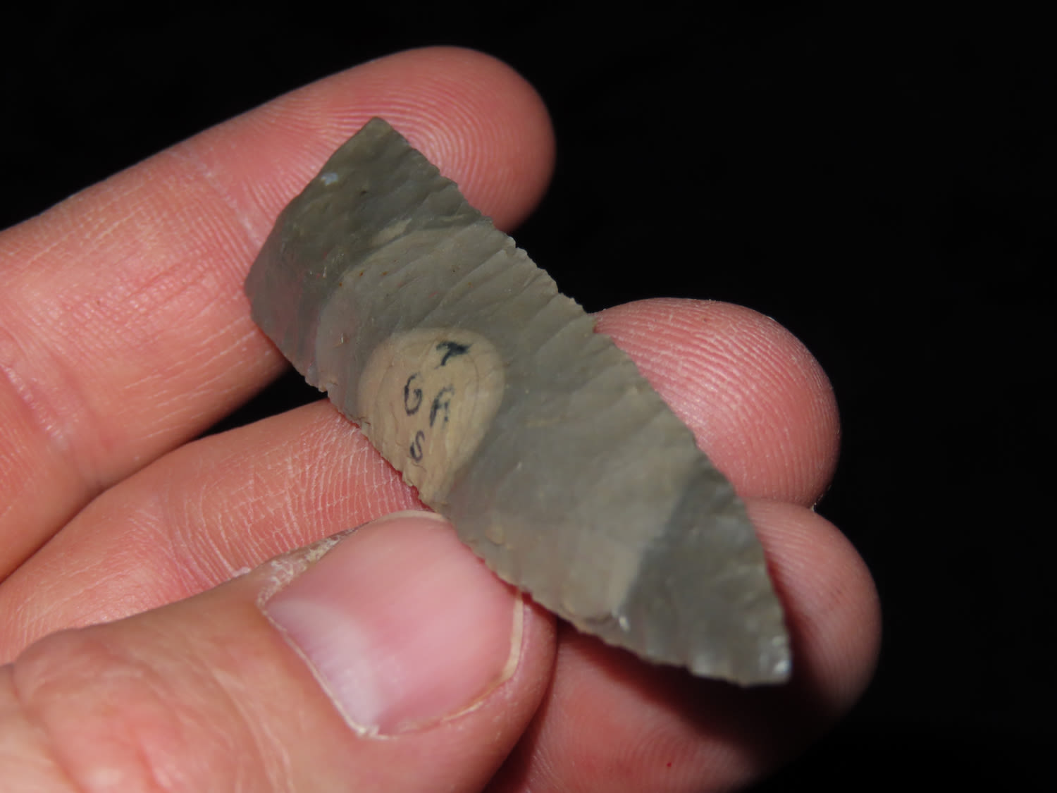 2 7/8″ CODY COMPLEX EDEN FROM OKLAHOMA, BASE ANCIENTLY SNAPPED, HEAVILY GROUND ON LAST 1/2″ OF BASAL EDGE, IMPECCABLE FLAKING