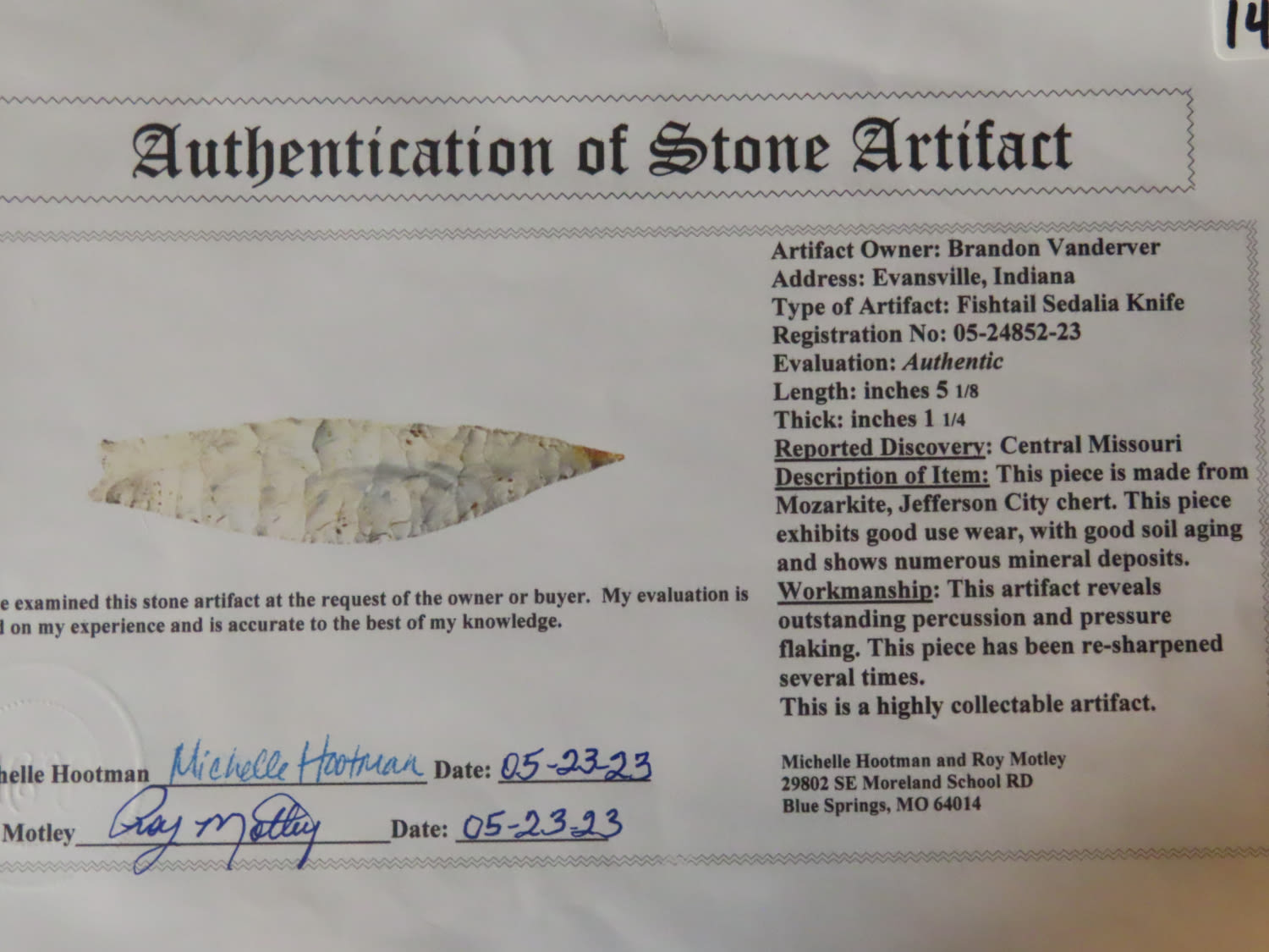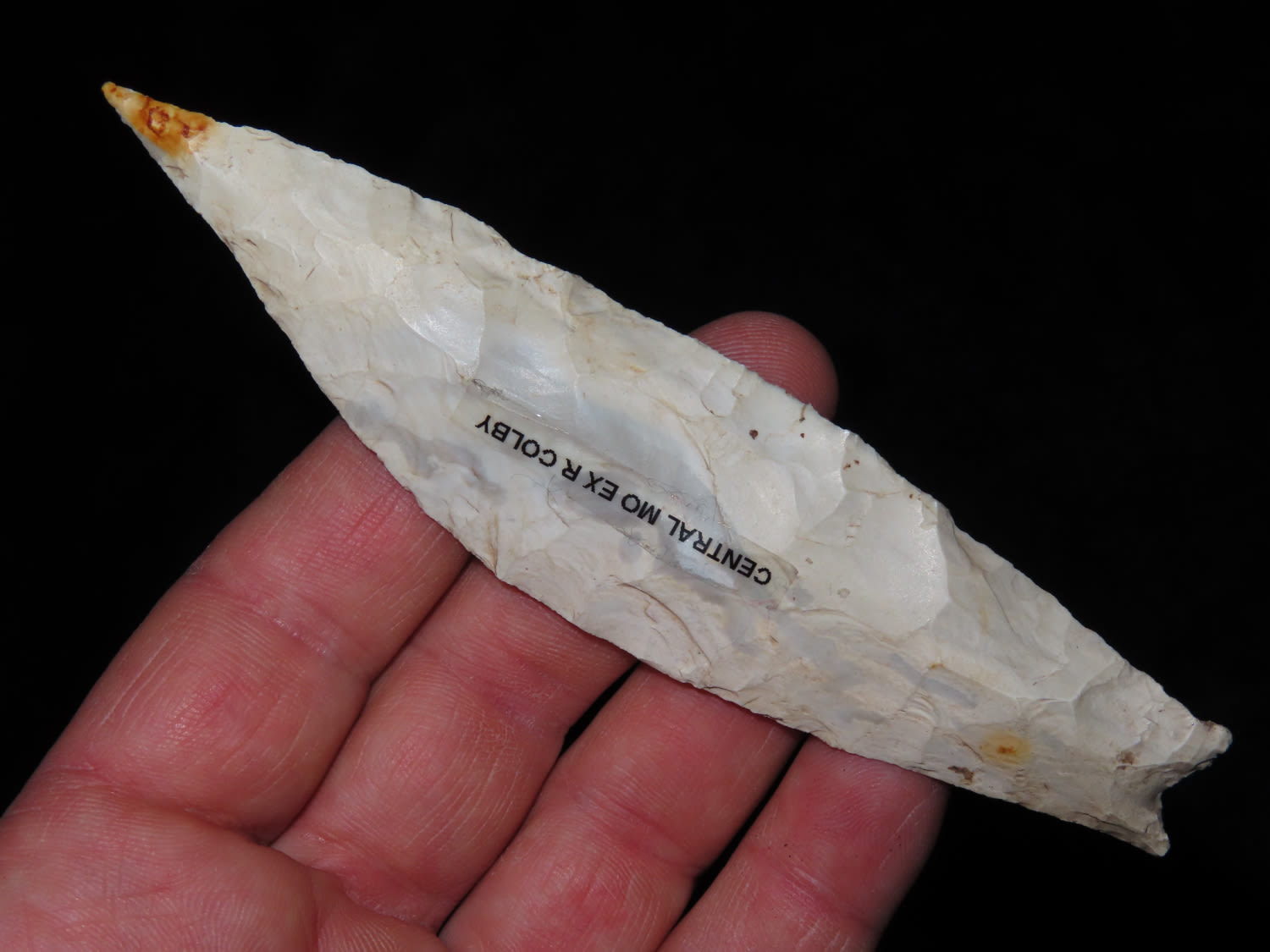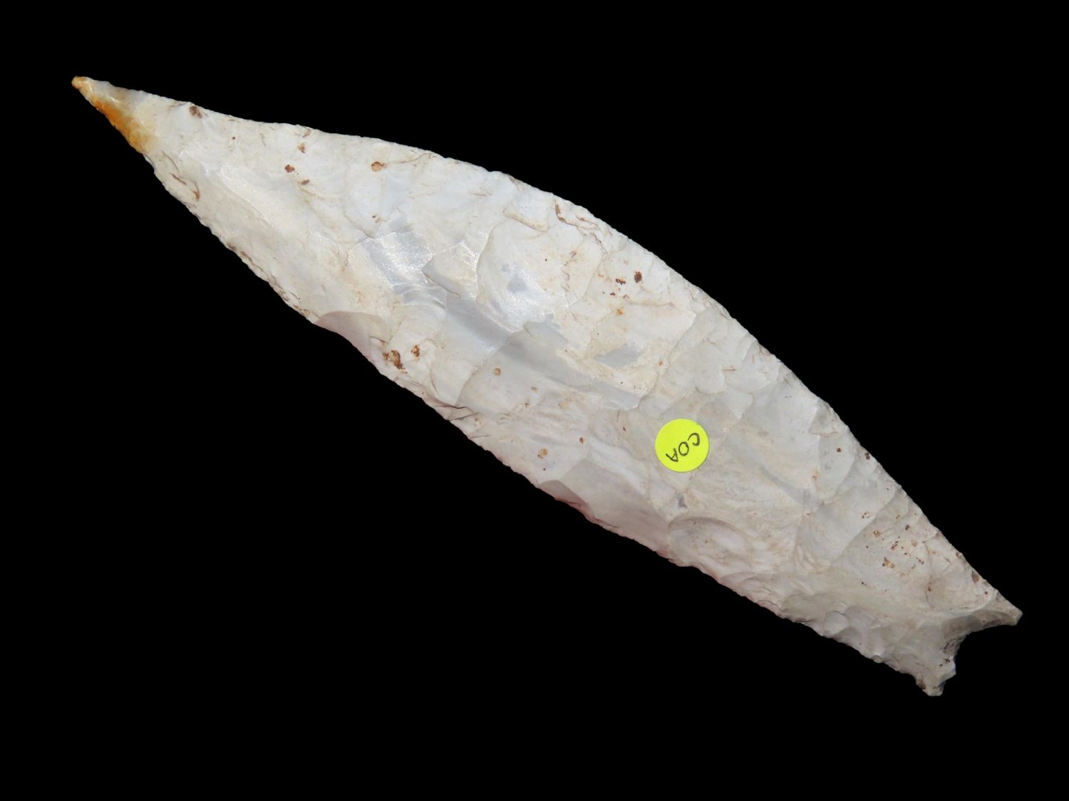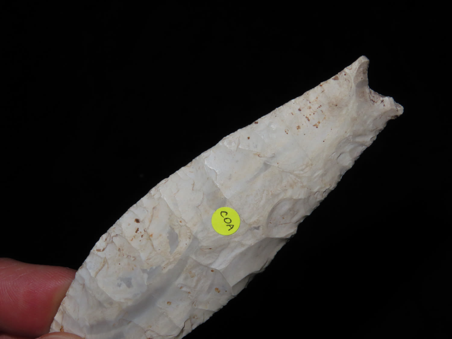 5 1/8″ NEEDLE TIPPED FISHTAIL SEDALIA, MOTLEY COA, EXCELLENT FLAKING, LONG DELICATE NEEDLE TIP, INDIAN ARROWHEAD, ARTIFACT