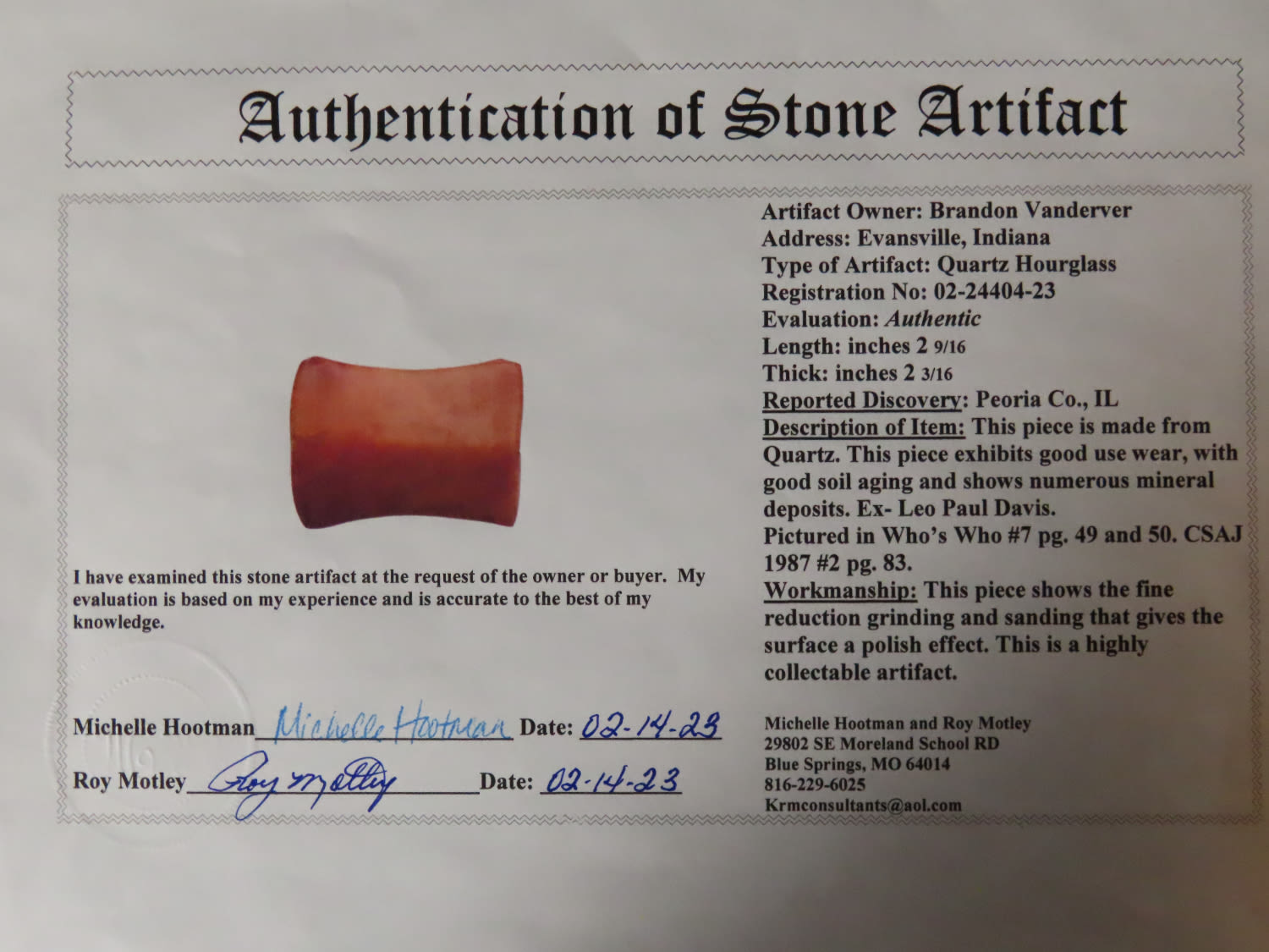 PHENOMENAL FERRINGENOUS QUARTZ HOURGLASS BANNERSTONE, FOUND IN PEORIA ILLINOIS, JERRY DICKEY, ROY MOTLEY, & TOM DAVIS COA’S, EX LEO PAUL DAVIS, PICTURED IN WHO’S WHO #7 PAGE 49, CENRAL STATES ARCH JOURNAL 1987 #2 P-83, INCREDIBLE POLISH & OUTSTANDING COLOR!