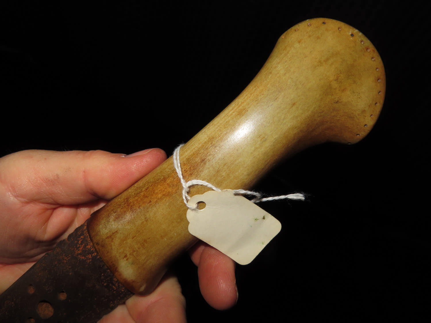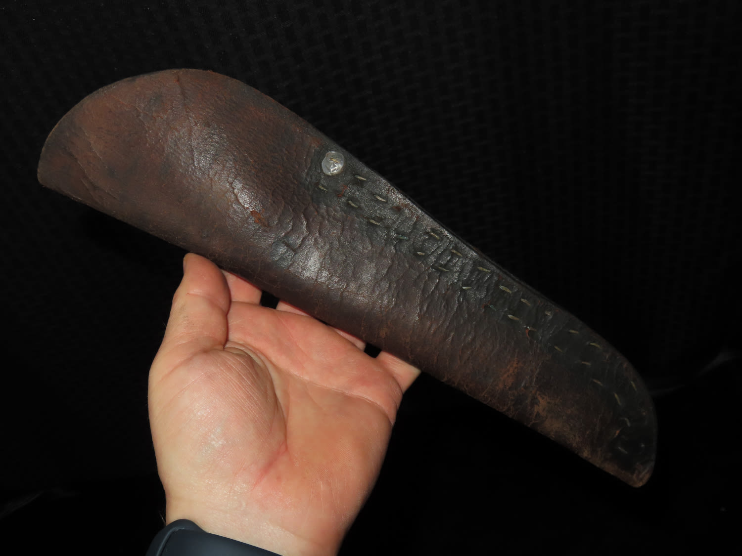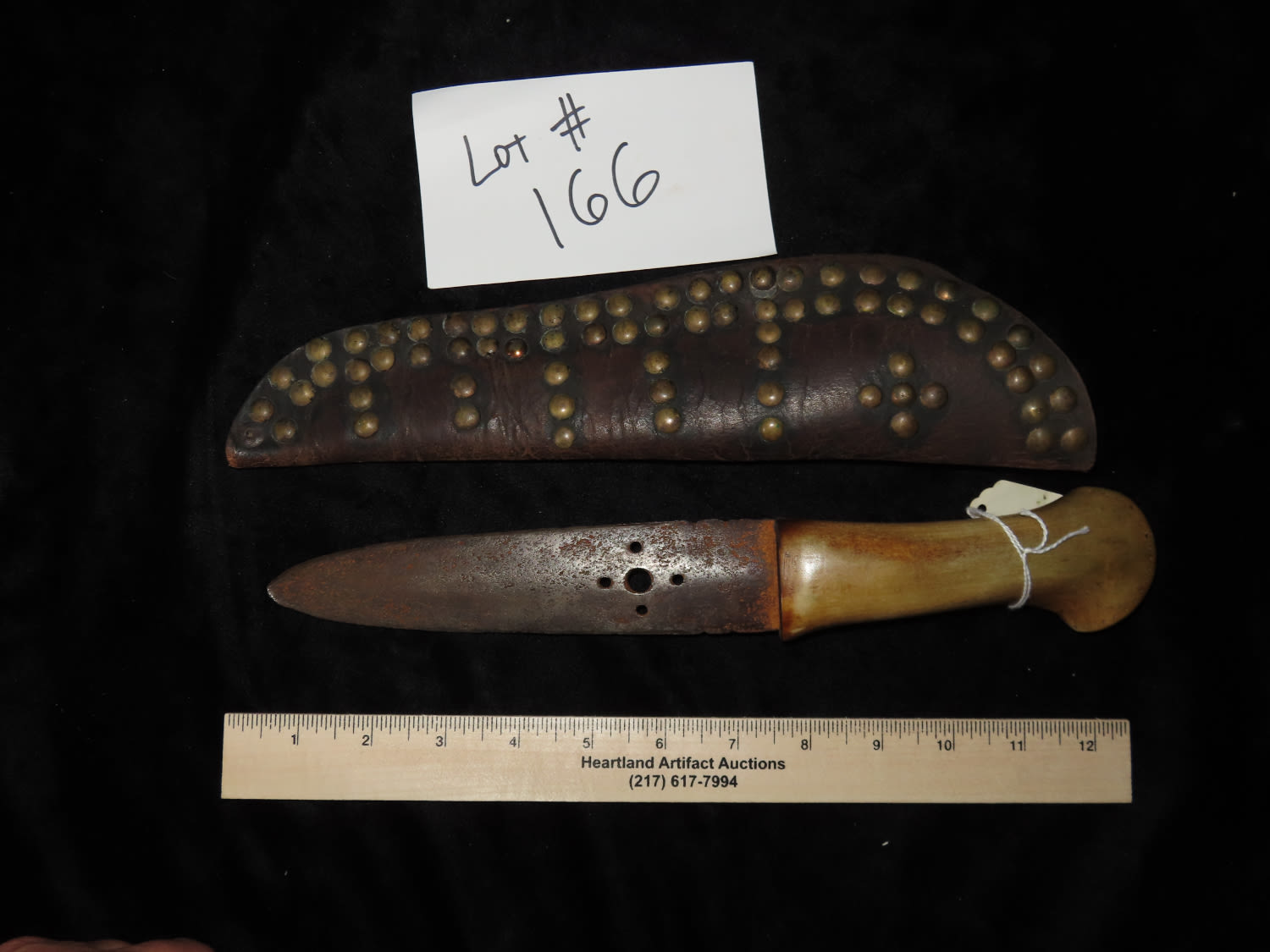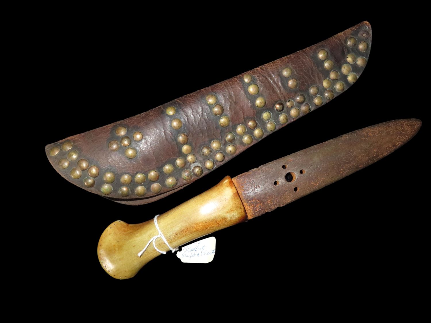 1800’S BLACKFOOT BUFFALO KNIFE WITH TACKED SHEATH, NICE EARLY HISTORIC NATIVE AMERICAN INDIAN DAG KNIFE, NICELY DECORATED HANDLE & BLADE