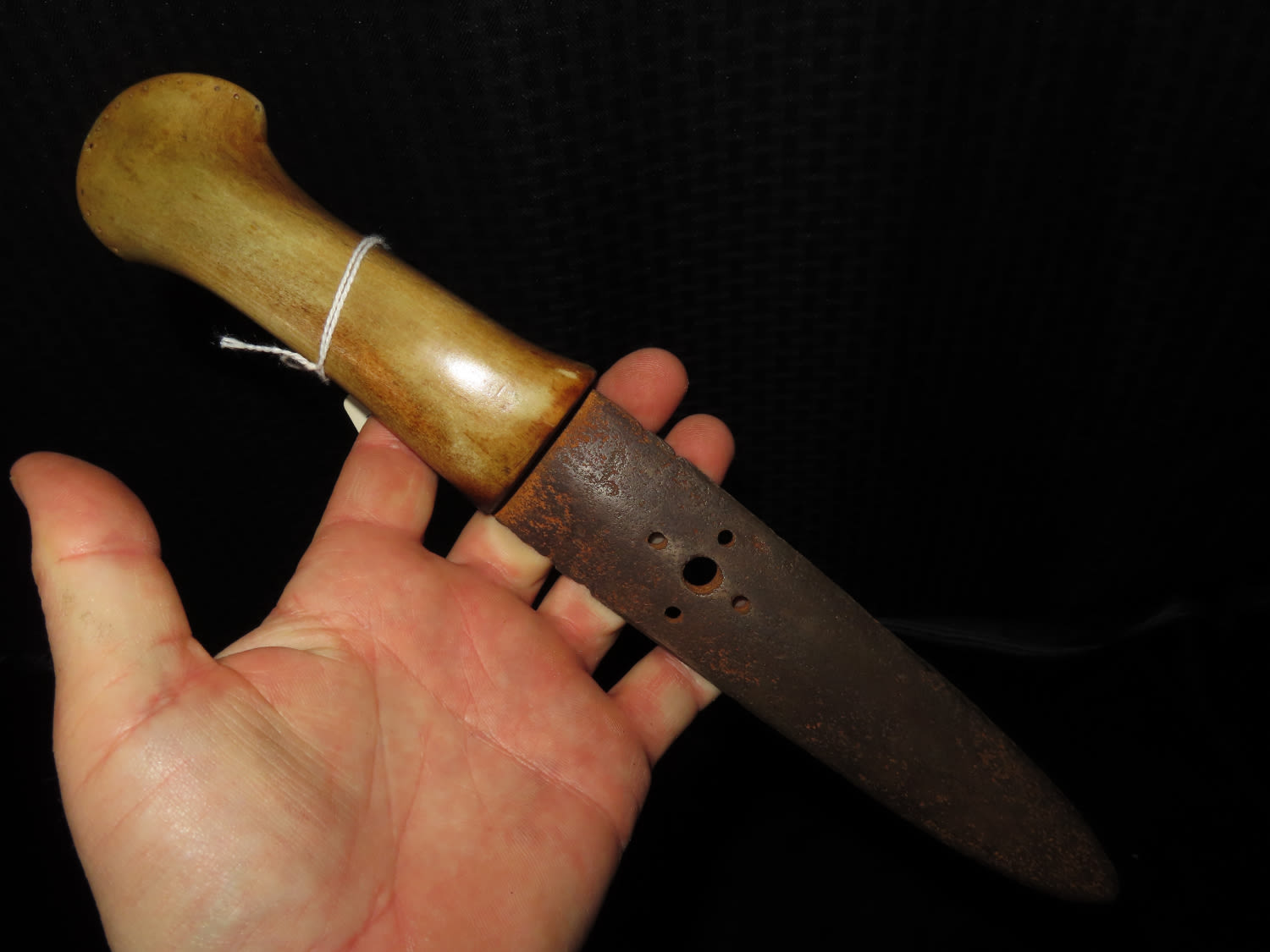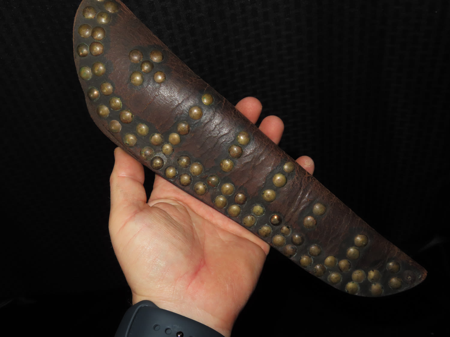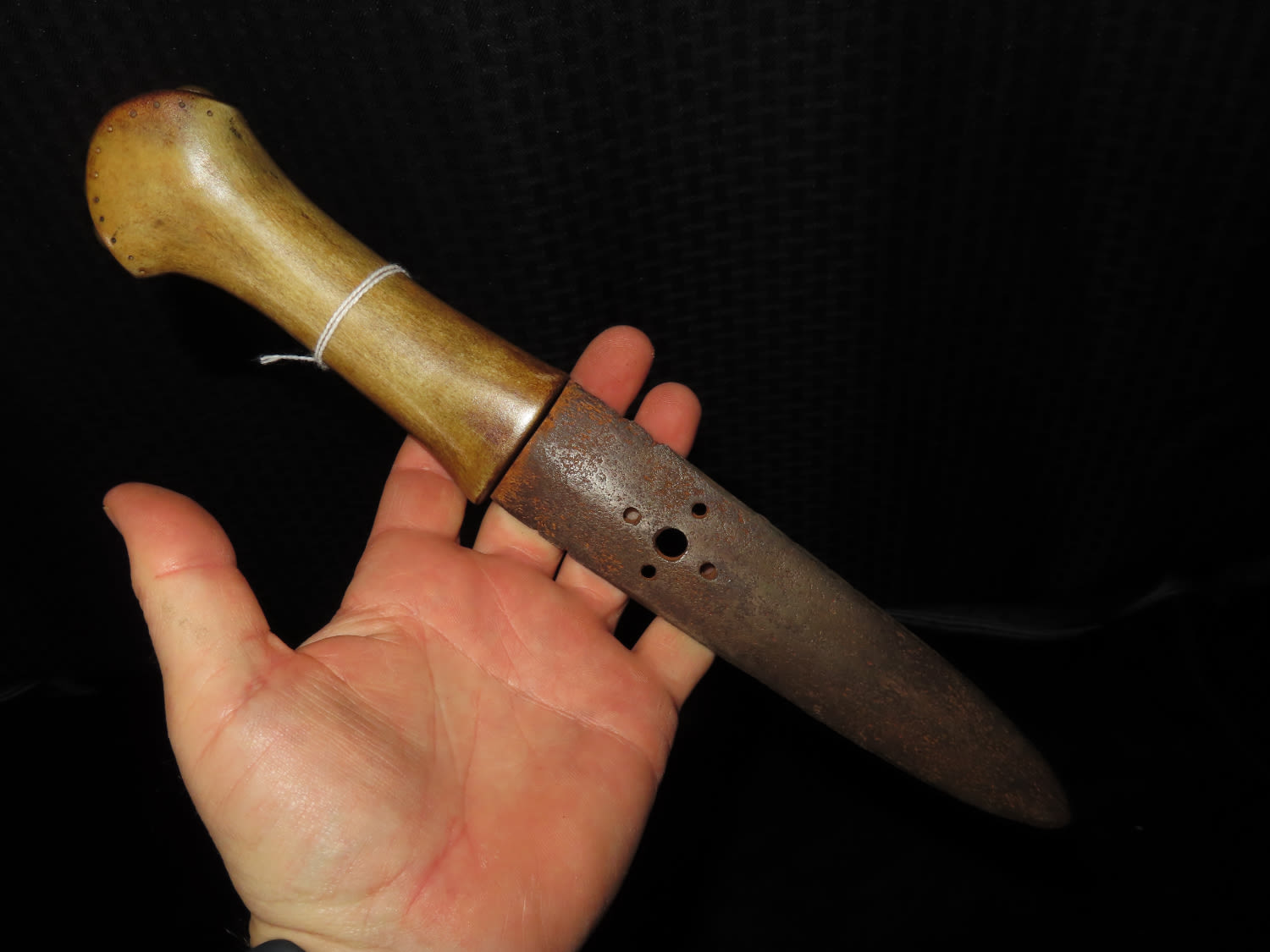 1800’S BLACKFOOT BUFFALO KNIFE WITH TACKED SHEATH, NICE EARLY HISTORIC NATIVE AMERICAN INDIAN DAG KNIFE, NICELY DECORATED HANDLE & BLADE