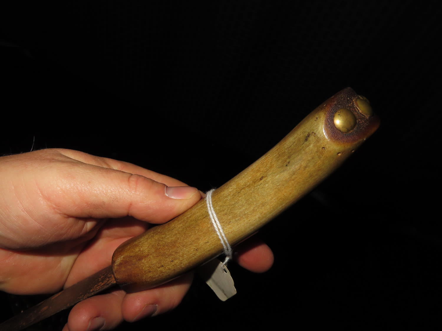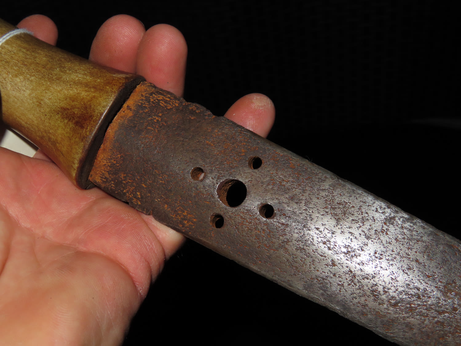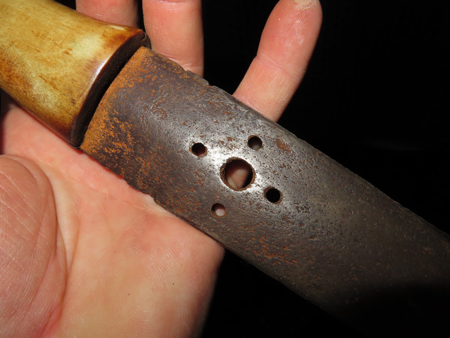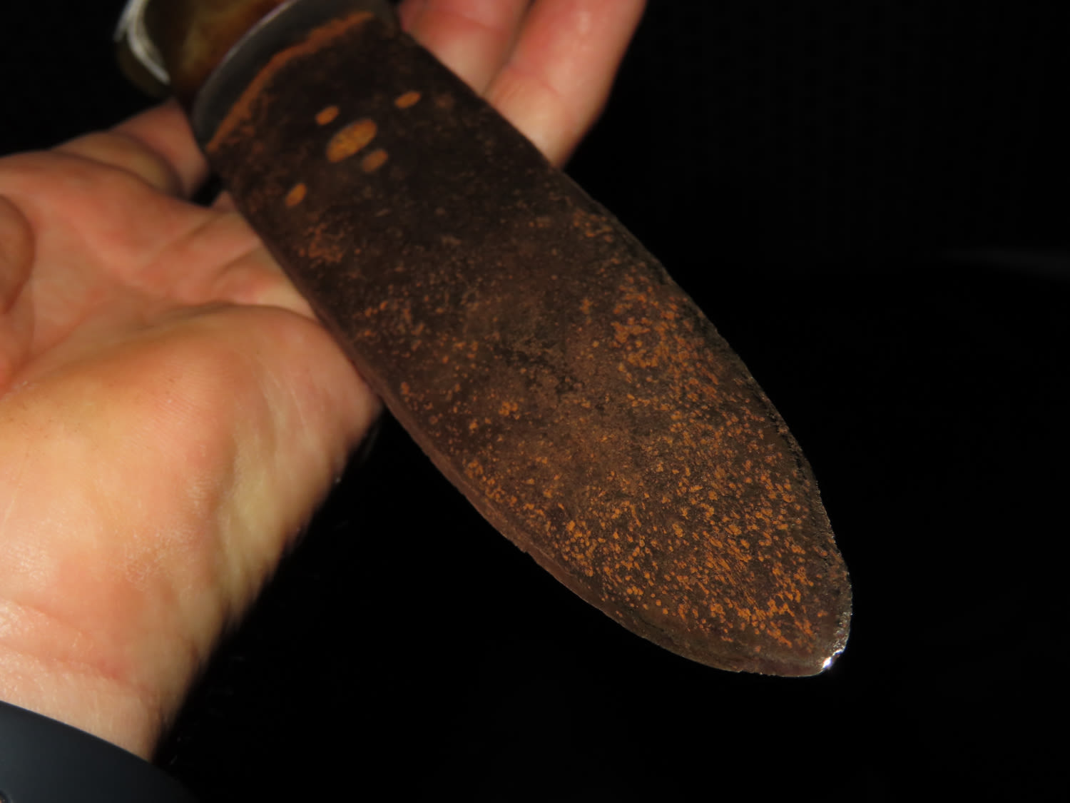 1800’S BLACKFOOT BUFFALO KNIFE WITH TACKED SHEATH, NICE EARLY HISTORIC NATIVE AMERICAN INDIAN DAG KNIFE, NICELY DECORATED HANDLE & BLADE