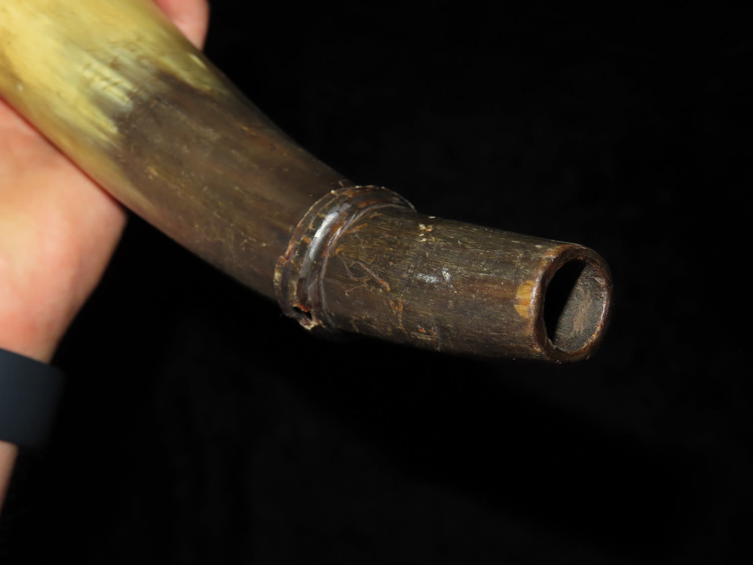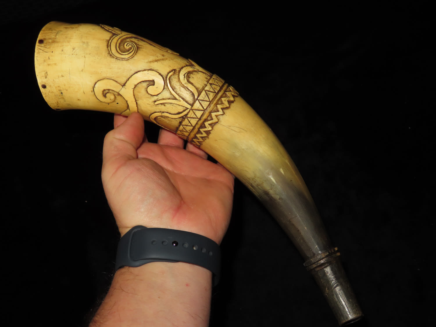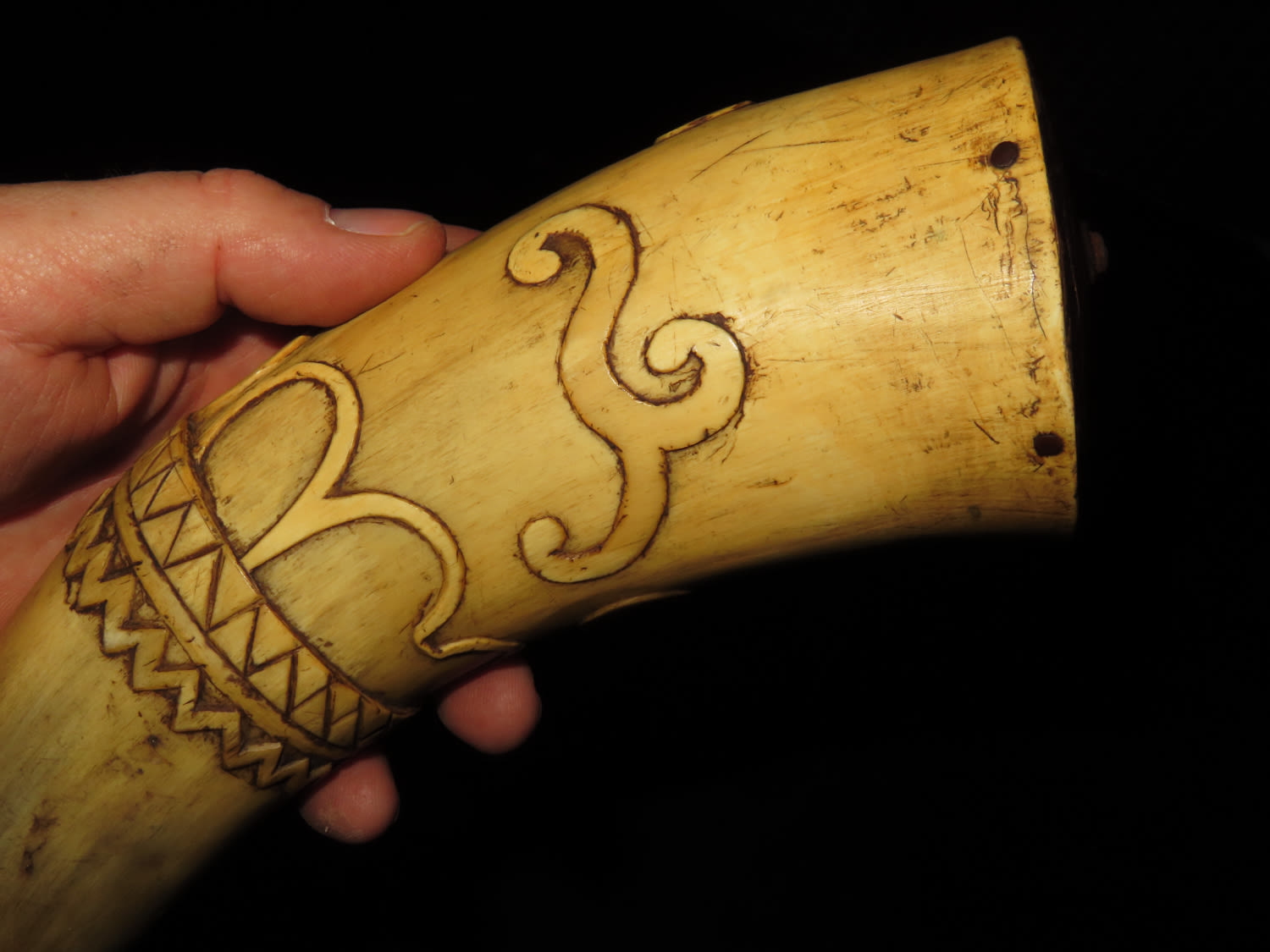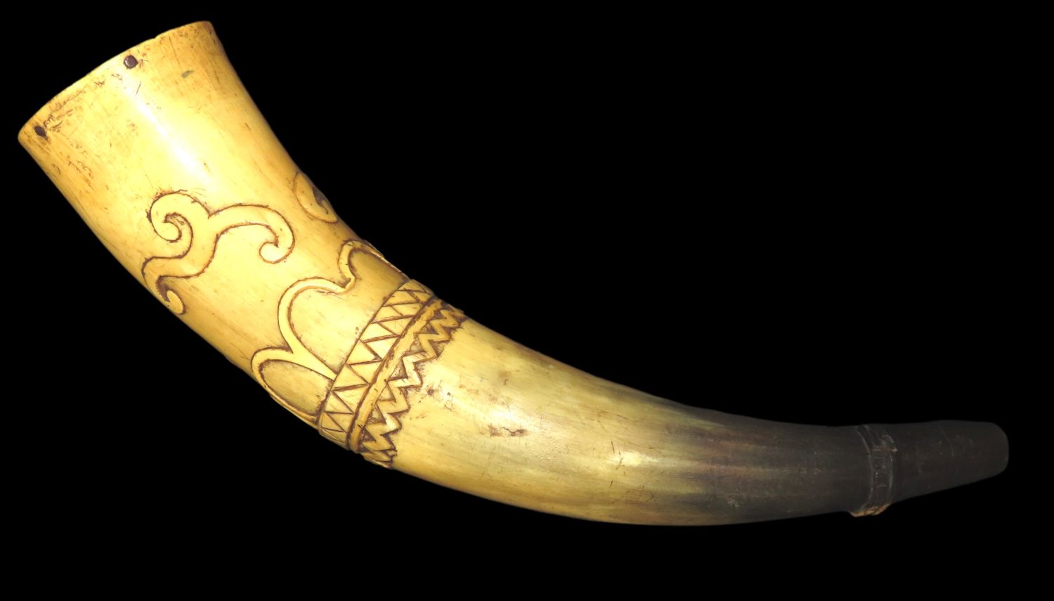 13″ LONG ENGRAVED 18TH CENTURY POWDER HORN, REVOLUTIONARY WAR PERIOD, BEAUTIFUL INTRICATE DESIGN CARVED IN RELIEF, GREAT OLD EXAMPLE