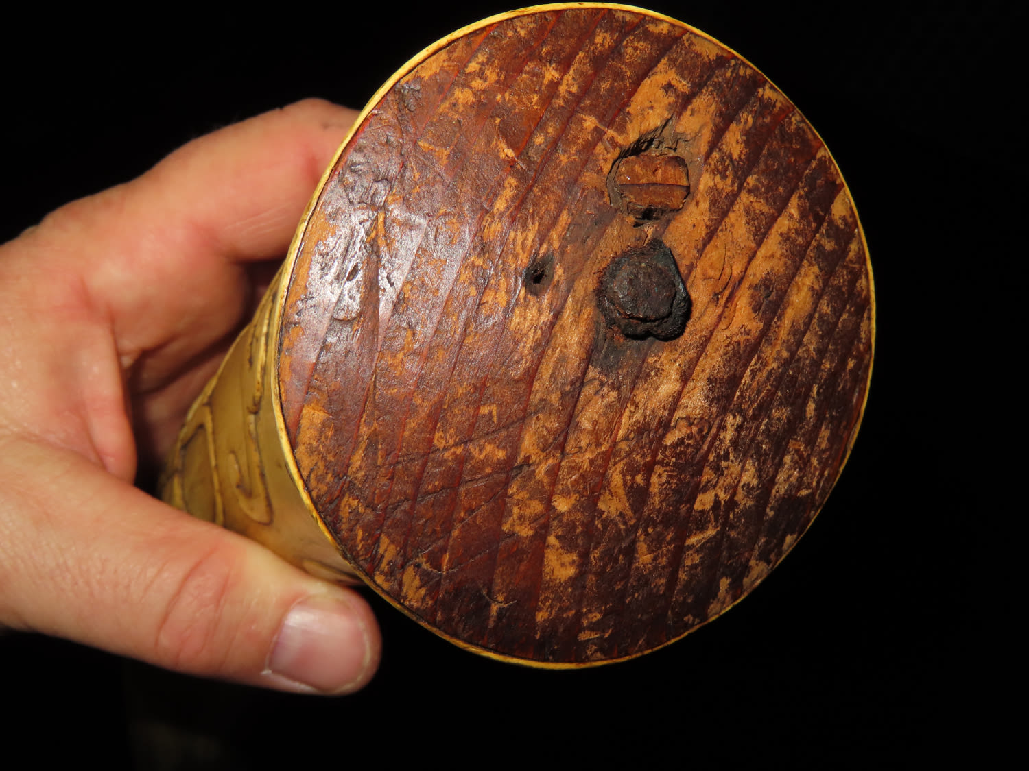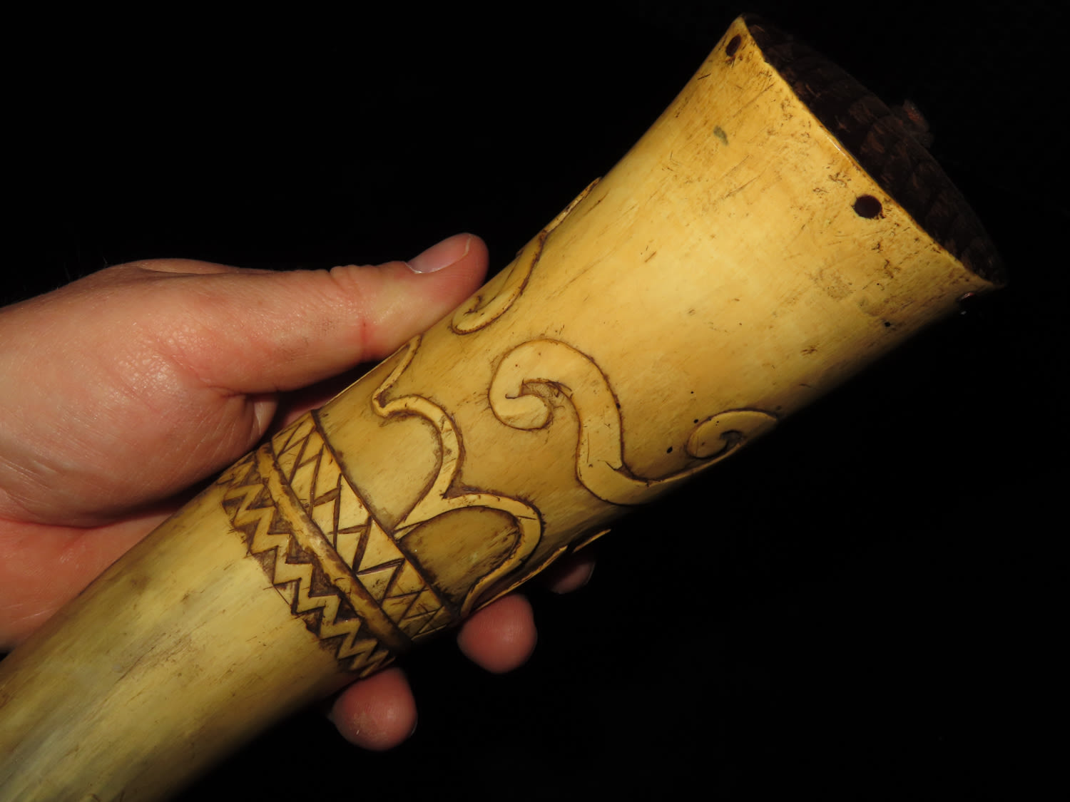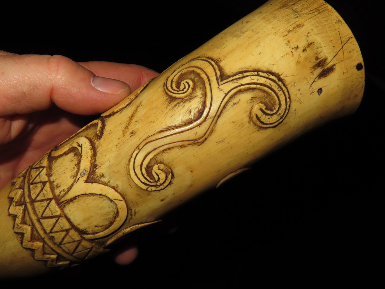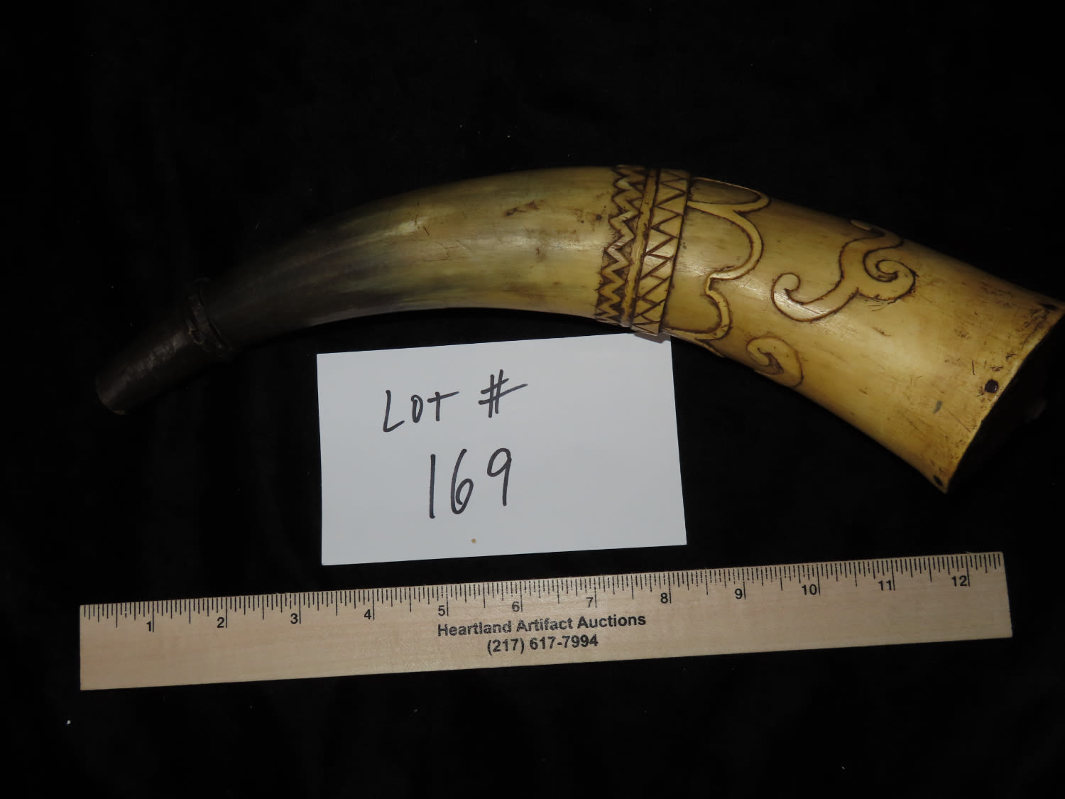 13″ LONG ENGRAVED 18TH CENTURY POWDER HORN, REVOLUTIONARY WAR PERIOD, BEAUTIFUL INTRICATE DESIGN CARVED IN RELIEF, GREAT OLD EXAMPLE