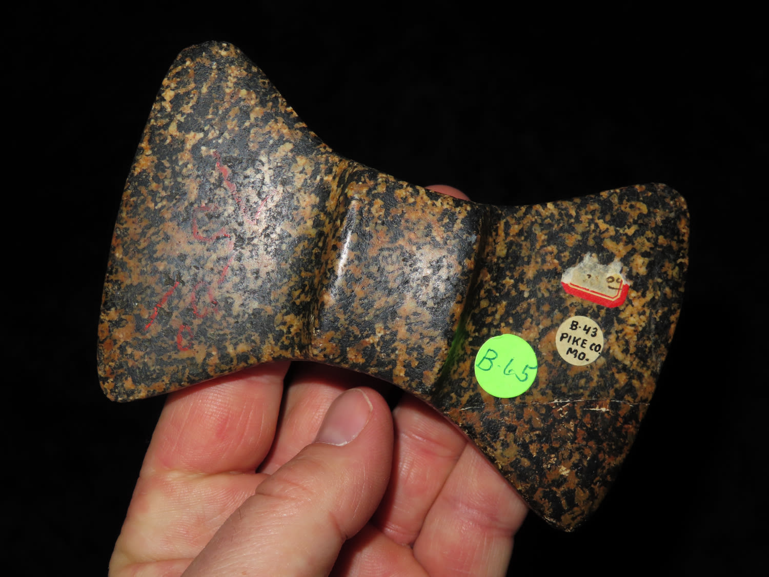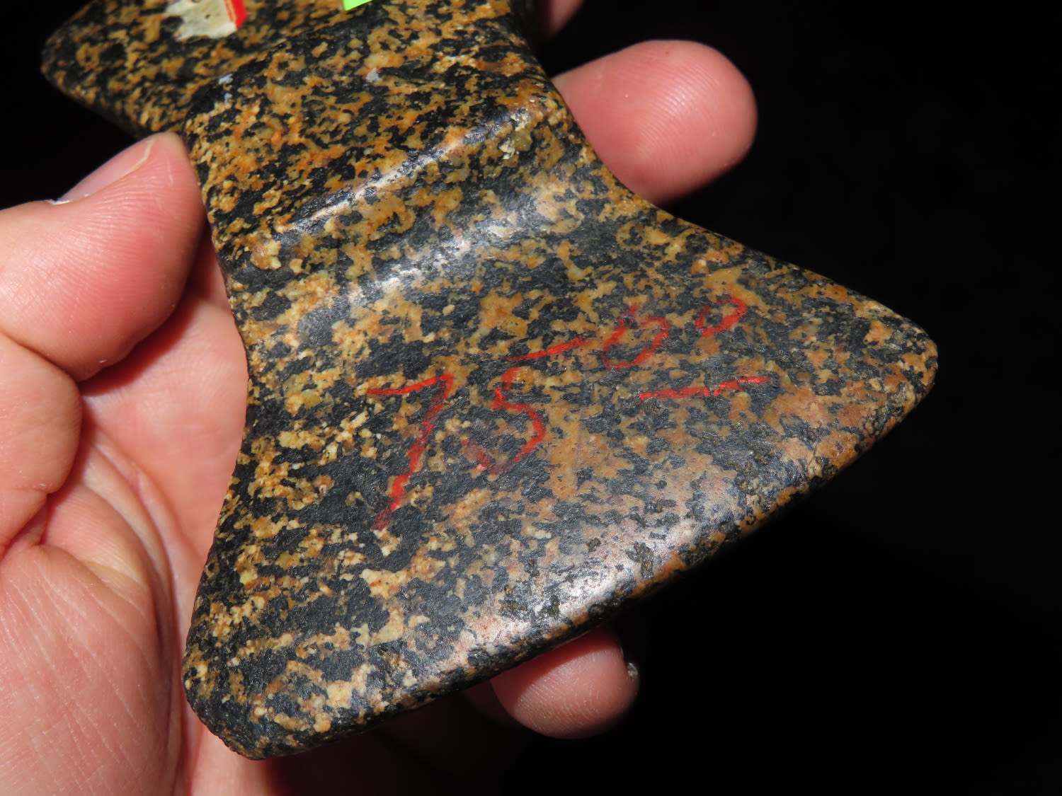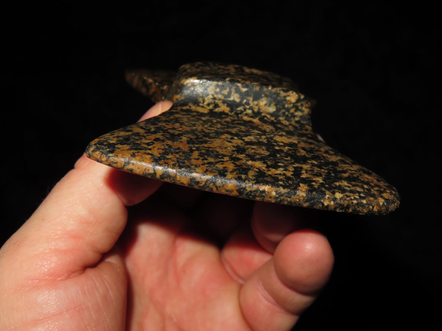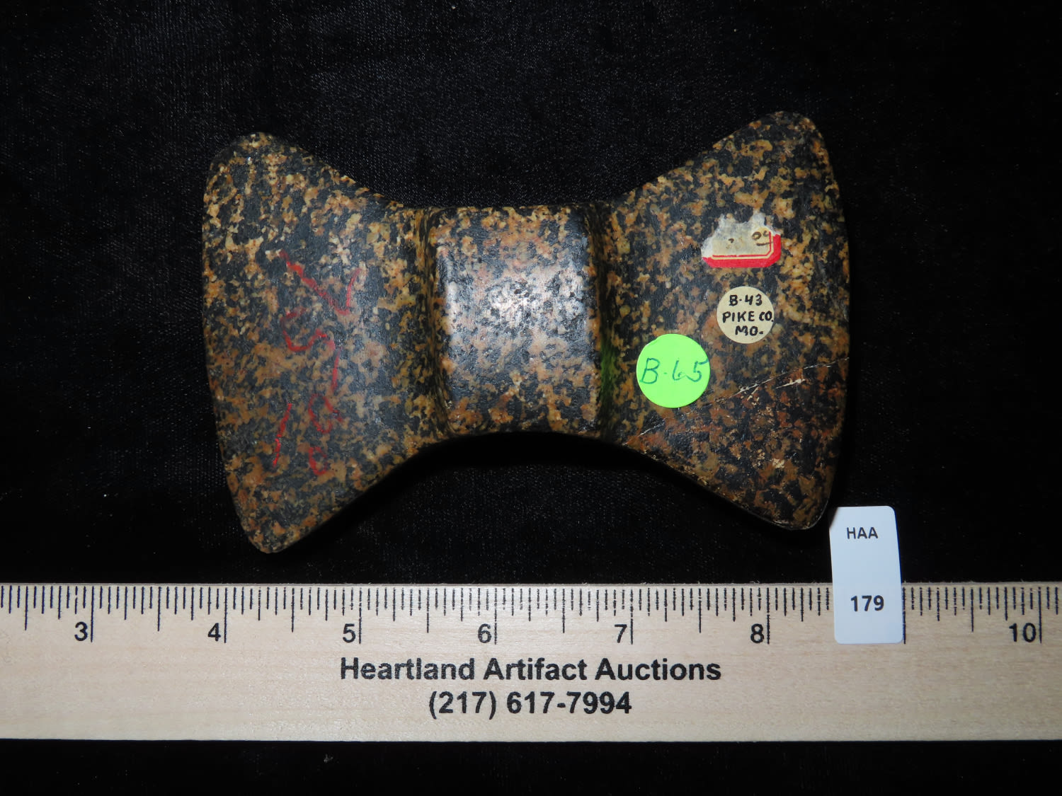OUTSTANDING WISCONSIN WING BANNER PREFORM, DICKEY & MOTLEY COA, EX KNOBLOCK, DR COPELAND, FLOYD RITTER. MINOR OLD RESTORATION TO ONE CORNER OF A WING. AMAZING FORM & INCREDIBLE POLISH. CANE DRILLING STARTED ON ONE END, DEEPLY FLUTED BARREL ON BOTH SIDES. PICTURED IN KNOBLOCK’S BANNERSTONES OF THE NORTH AMERICAN INDIAN PAGE 441; WHO’S WHO #1 P49; WHO’S WHO #6 P49; WHO’S WHO #8 P182, 184, & 186; LEGENDS 3 P148; 1968 REDSKINS VOL3 #3 P103; 1990 PREHISTORIC AMERICAN #4 P17; CSAJ 1992 #4 P182; CSAJ 2004 #4 P25. IMPECCABLE HISTORY & PEDIGREE!
