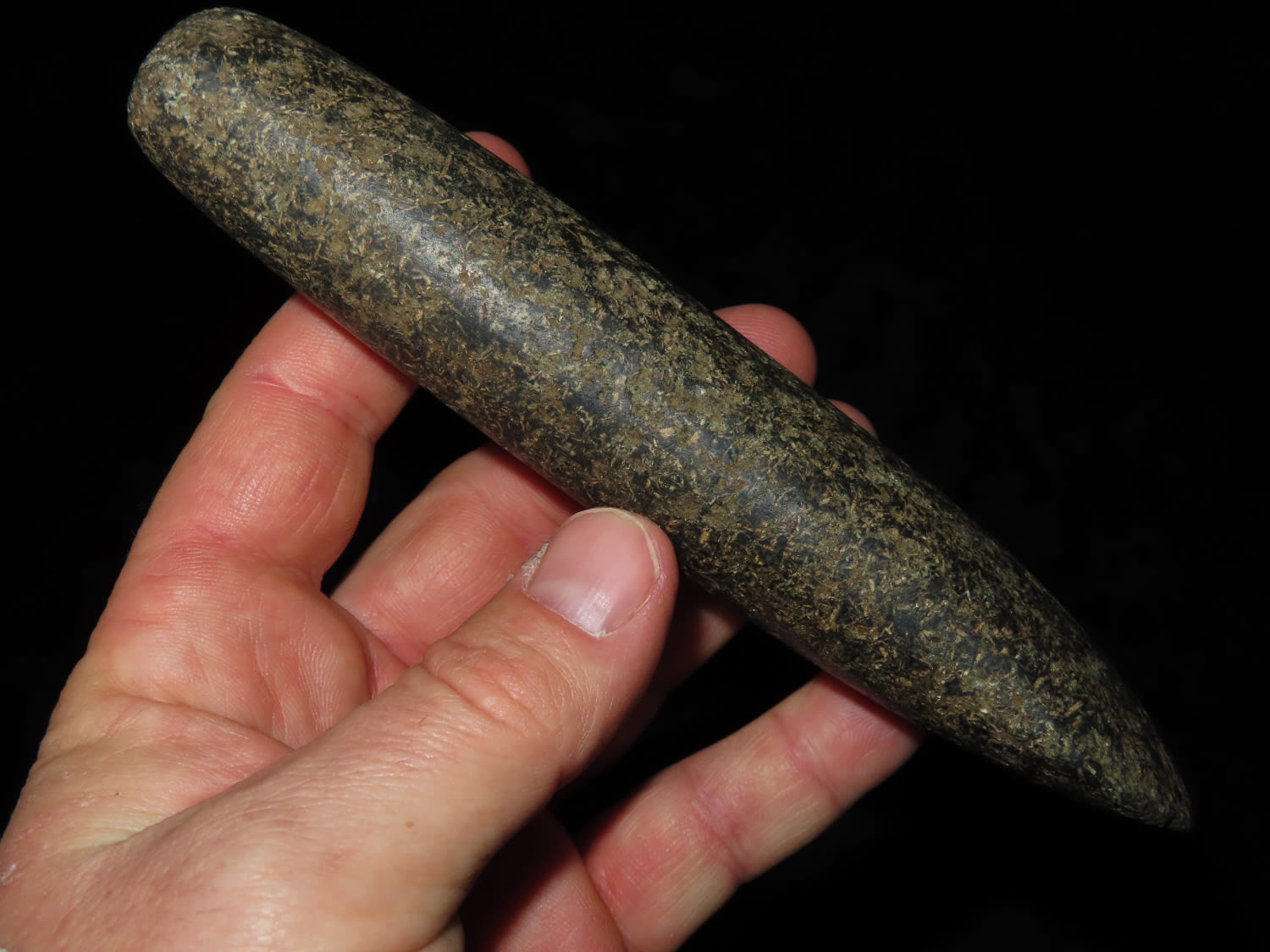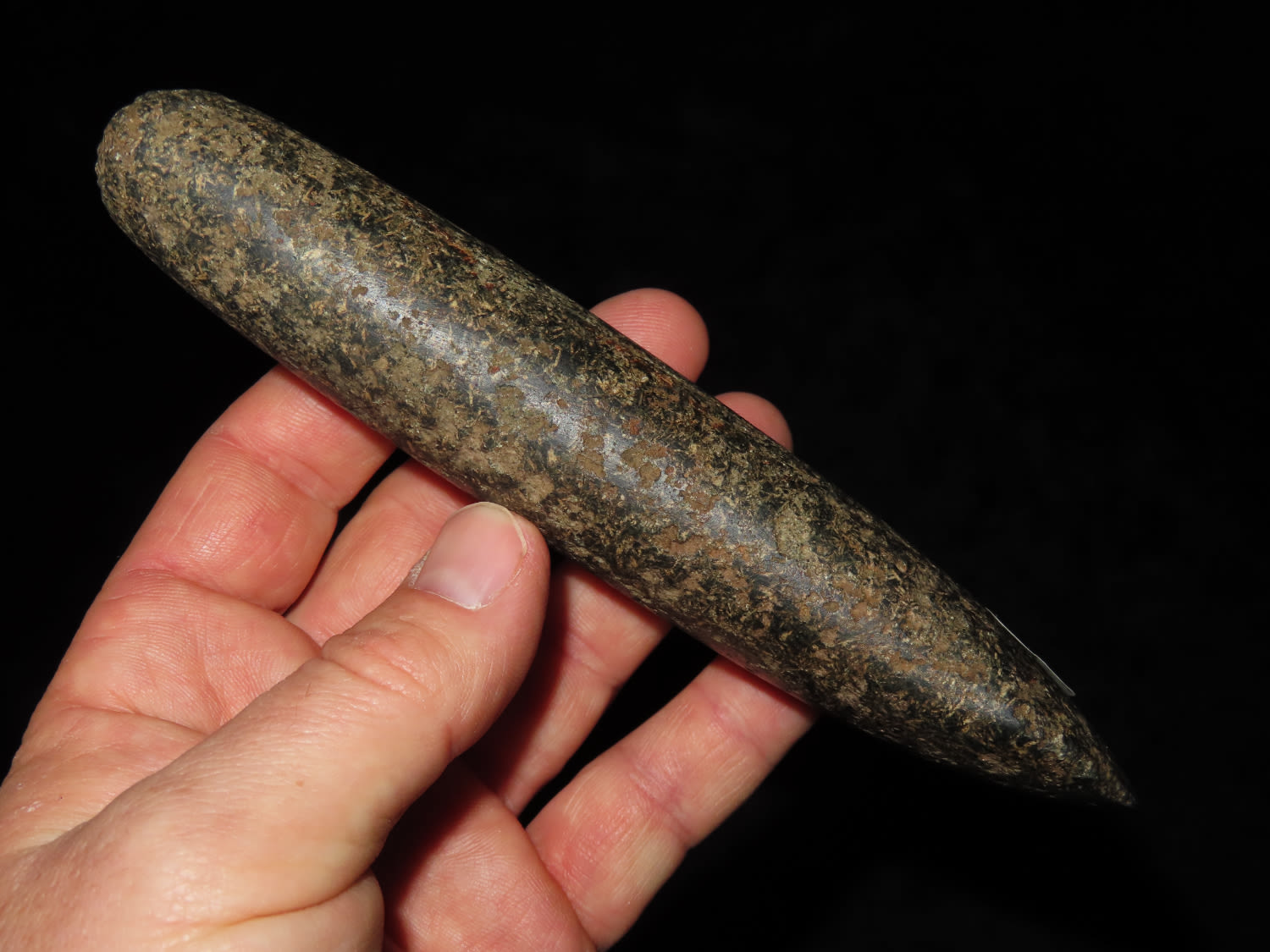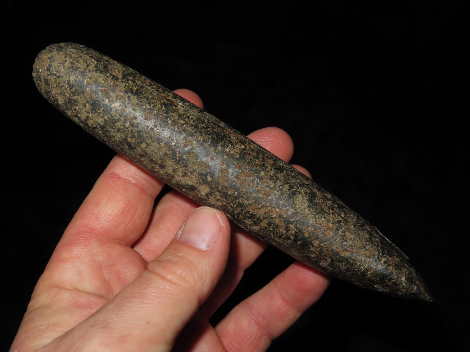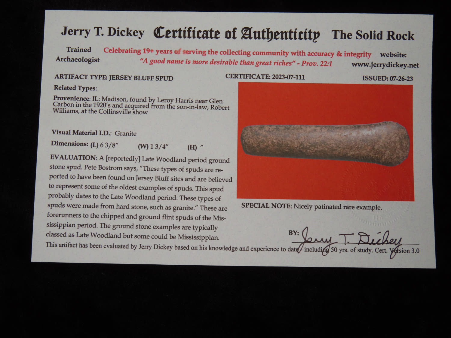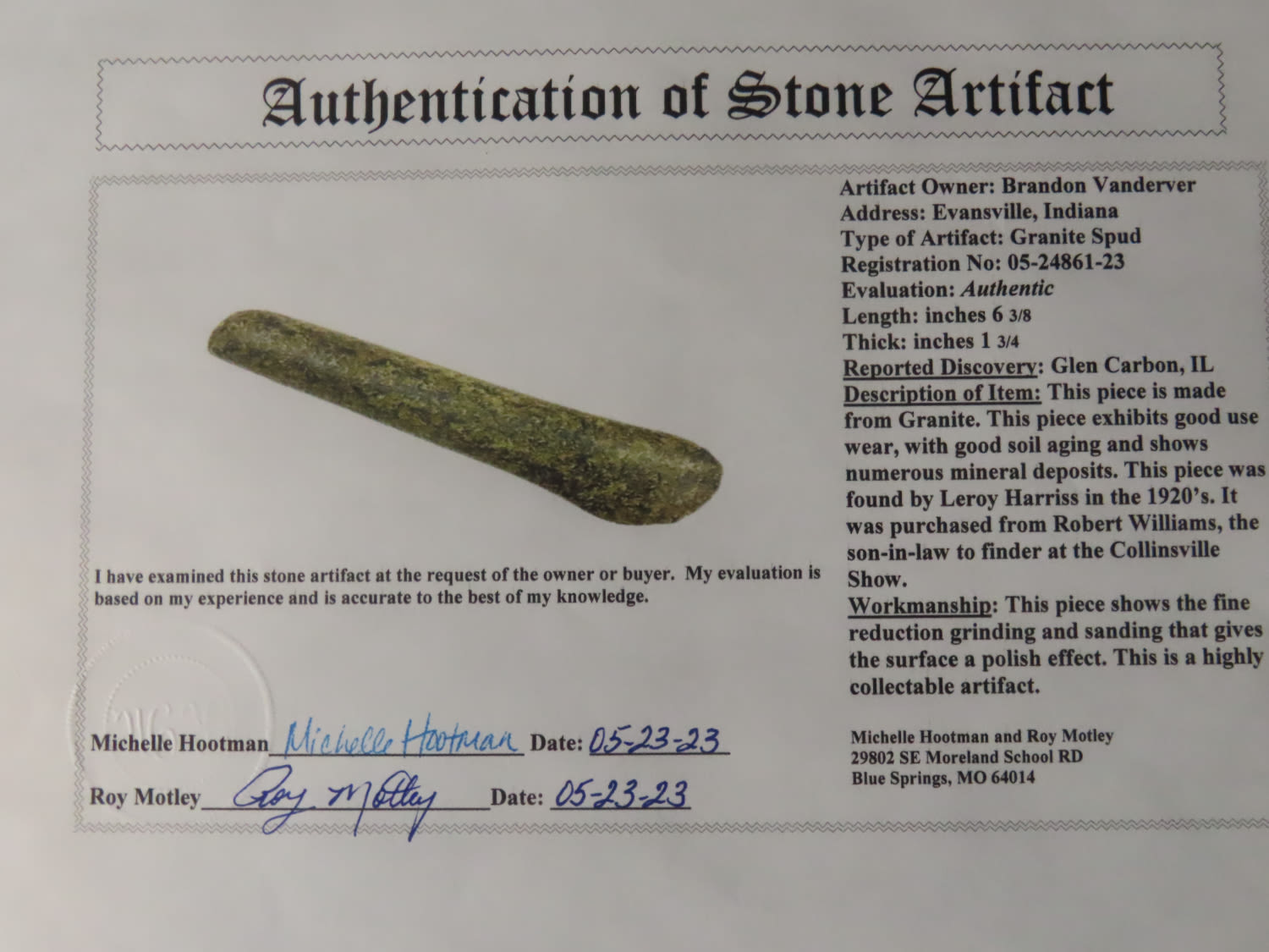 RARE 6 3/8″ HARDSTONE SPUD, DICKEY & MOTLEY COA, FOUND NEAR GLEN CARBON ILLINOIS IN MADISON COUNTY BY LEROY HARRIS IN THE 1920’S, WAS PURCHASED FROM HIS SON IN LAW (ROBERT WILLIAMS) AT THE COLLINSVILLE SHOW YEARS AGO. NICE WELL SHAPED AND HIGHLY POLISHED EXAMPLE.