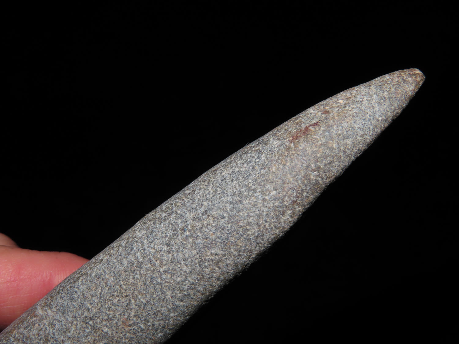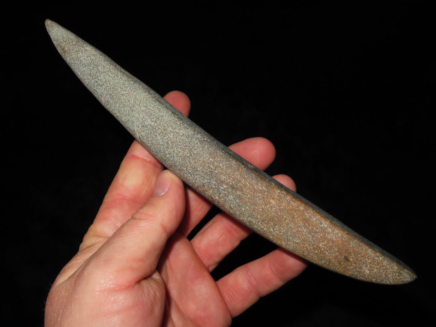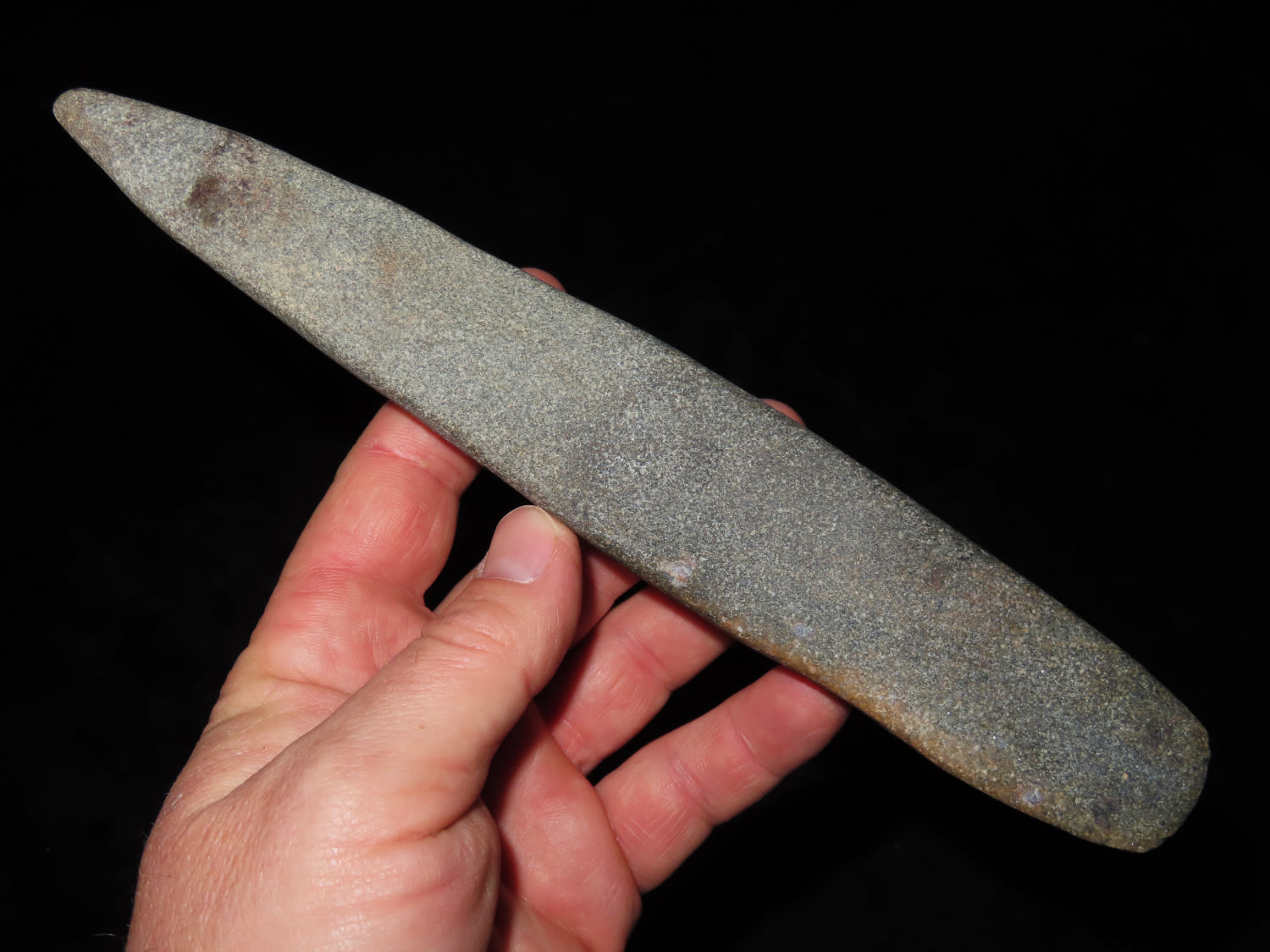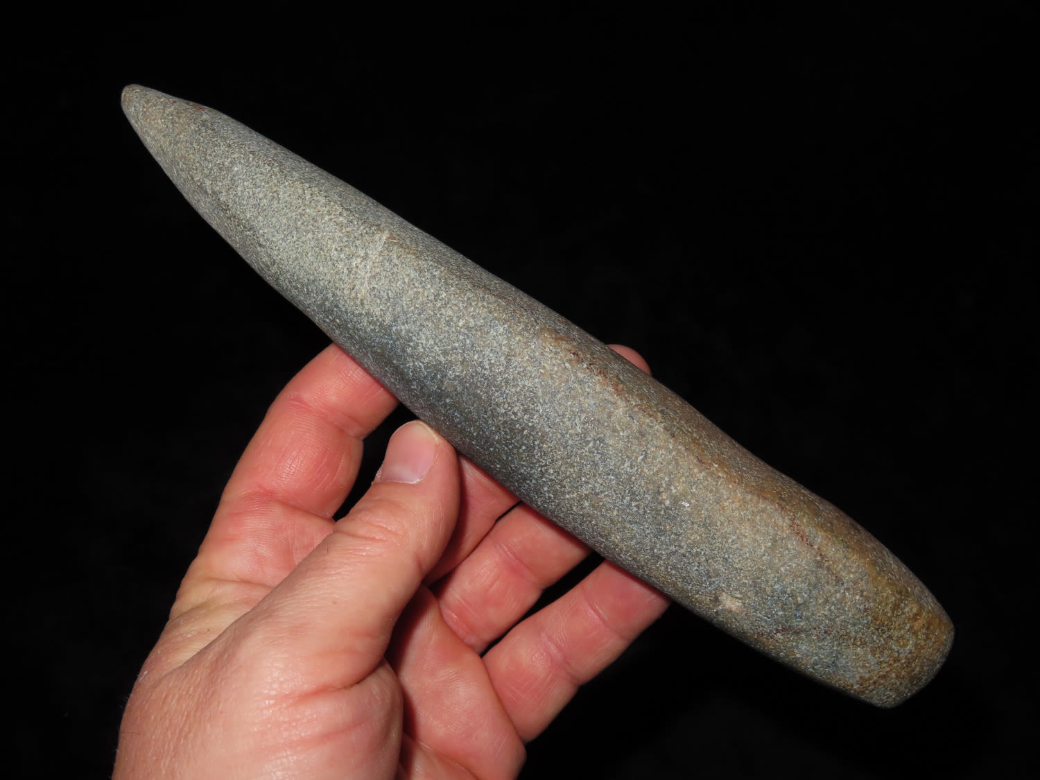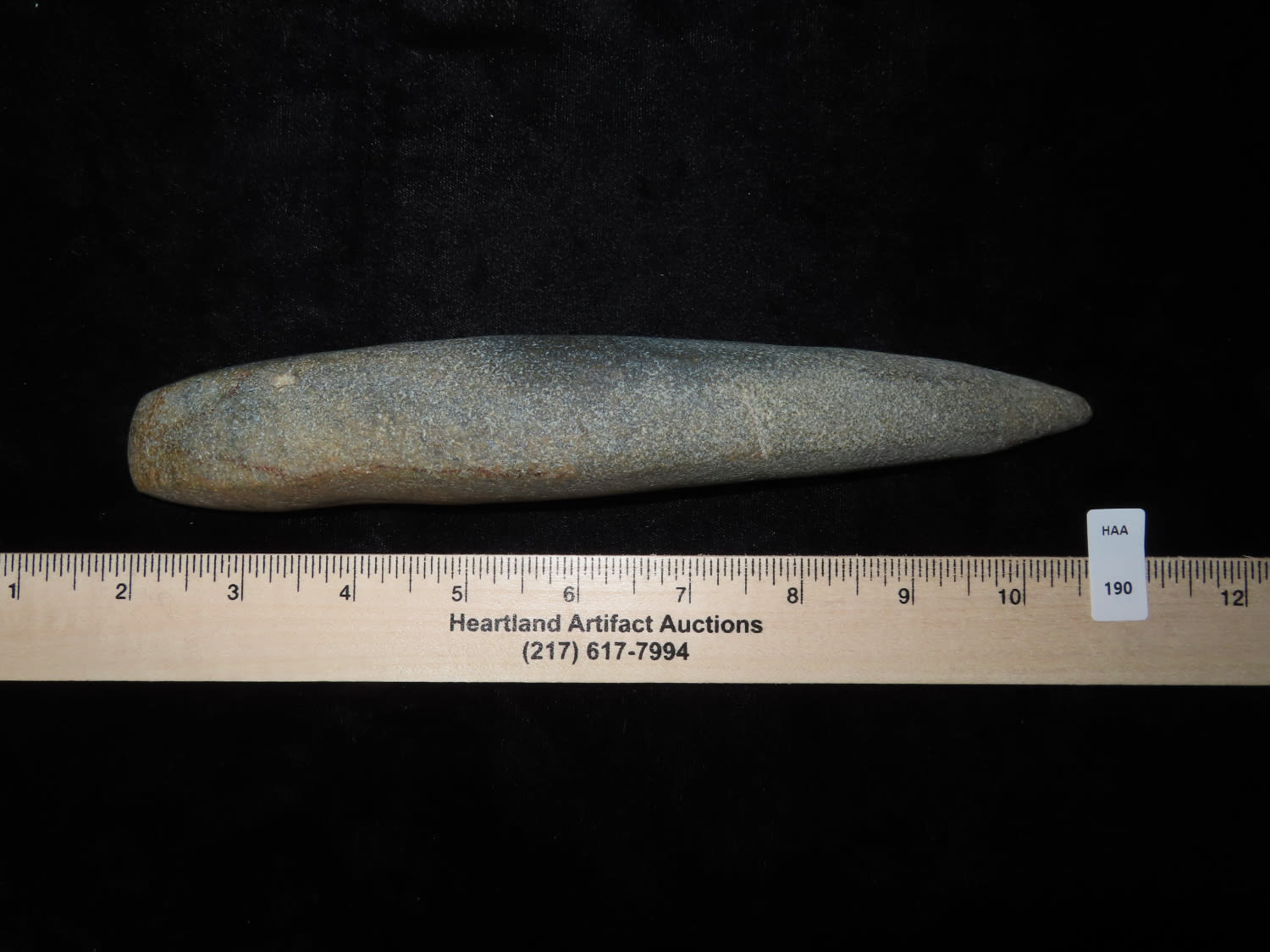 8 3/4″ LONG STONE PICK / CHISEL FOUND AT THE BULLSEYE SITE, GREENE COUNTY ILLINOIS BY LARRY FLAIT, EX JEFF HIPSKIND, NICE LARGE EXAMPLE