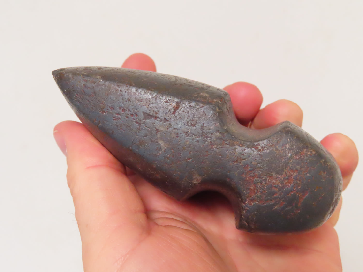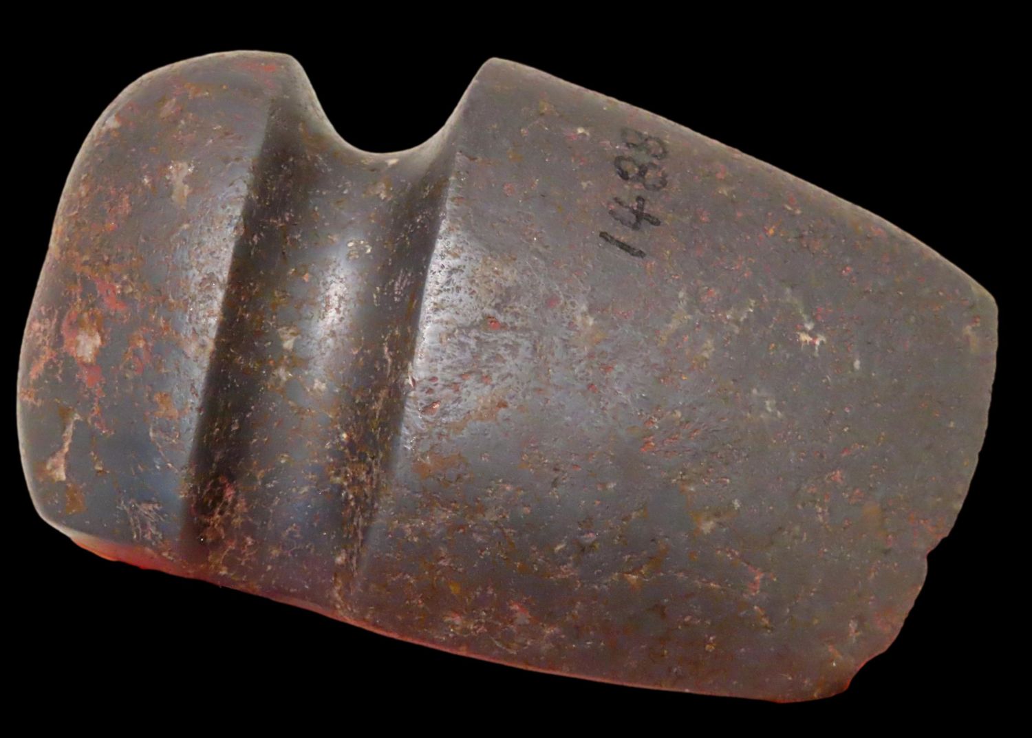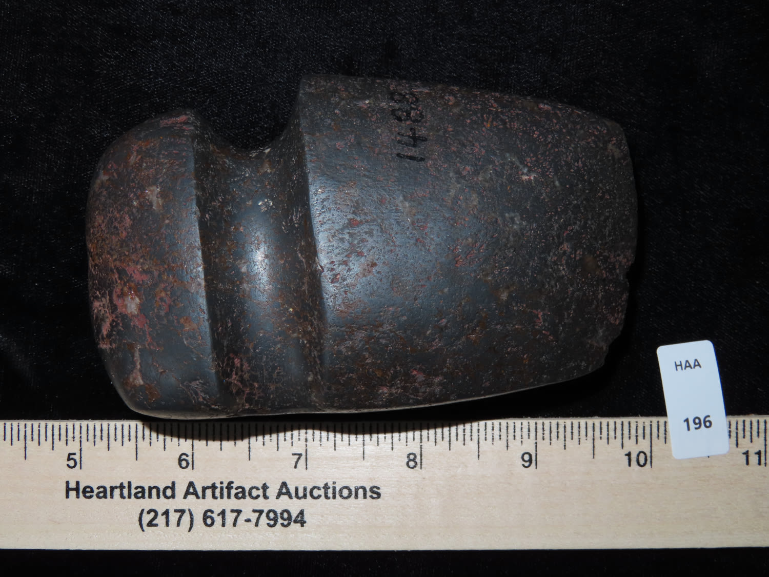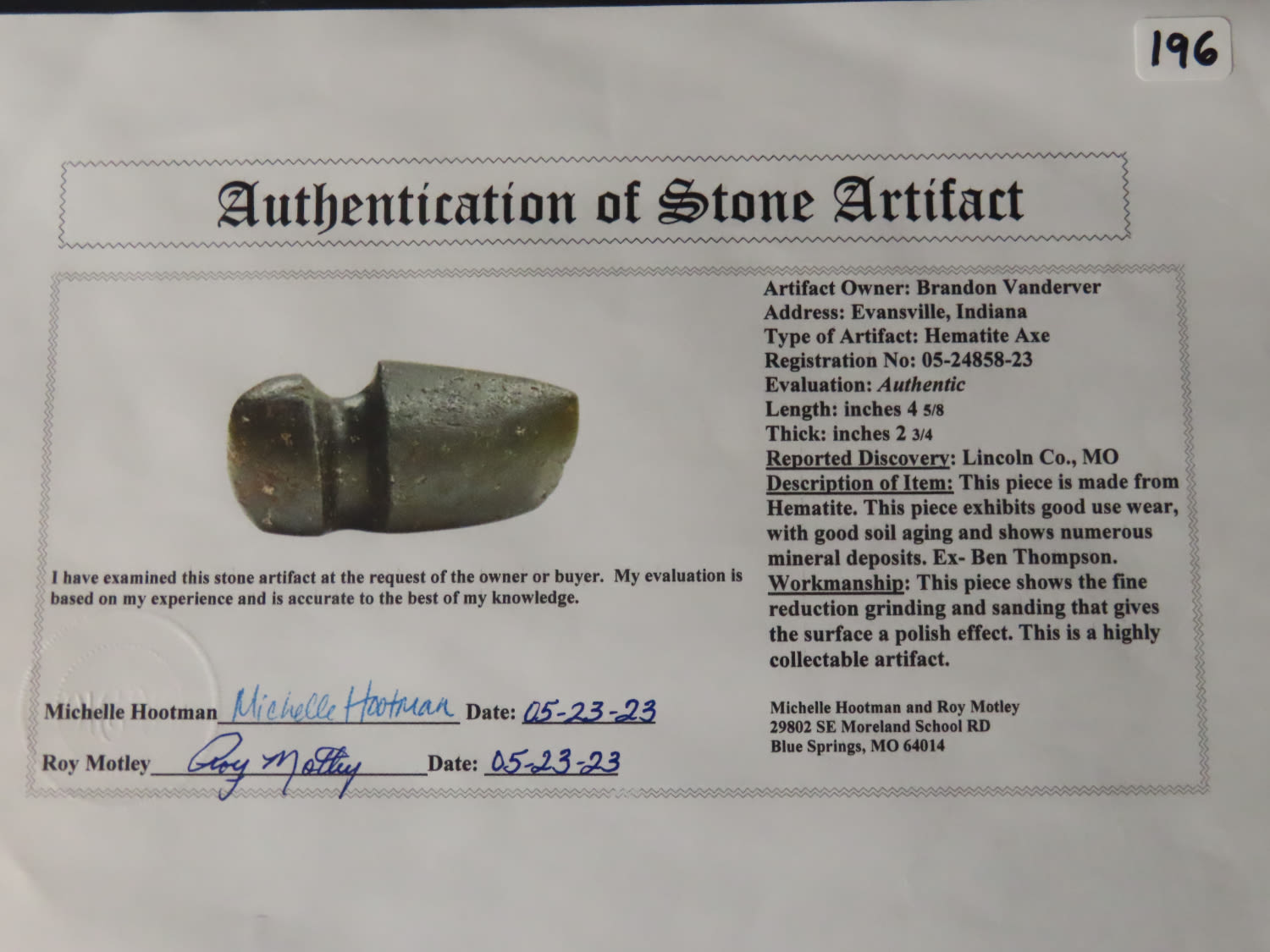 4 5/8″ PHENOMENAL HEMATITE 3/4 GROOVE AXE, MOTLEY COA, FOUND IN LINCOLN COUNTY MISSOURI, INCREDIBLE FORM, SUPER DEEP GROOVE & AMAZING POLISH, STANDS UP NICELY ON ITS EDGE, VERY HIGHLY DEVELOPED EXAMPLE.