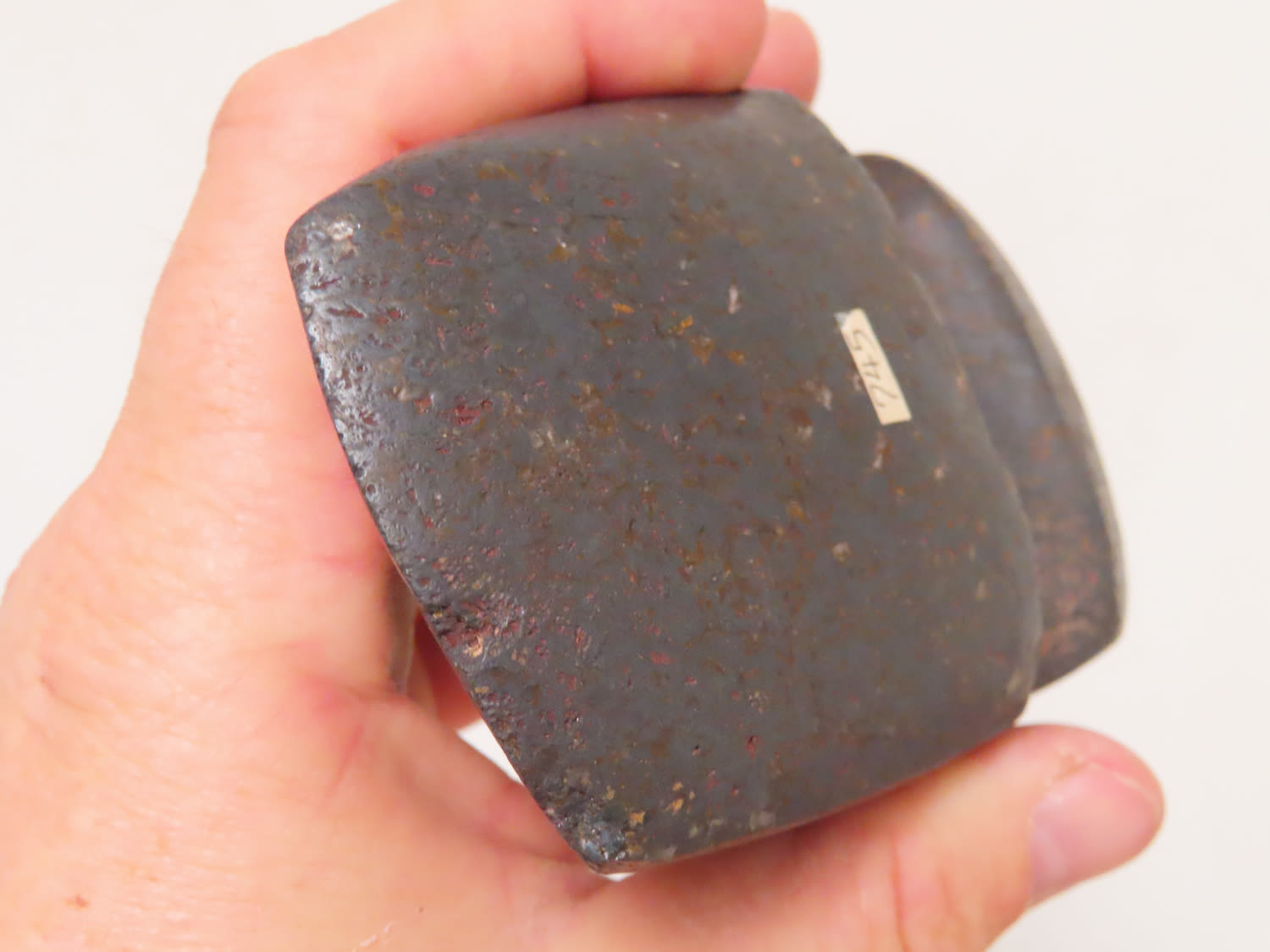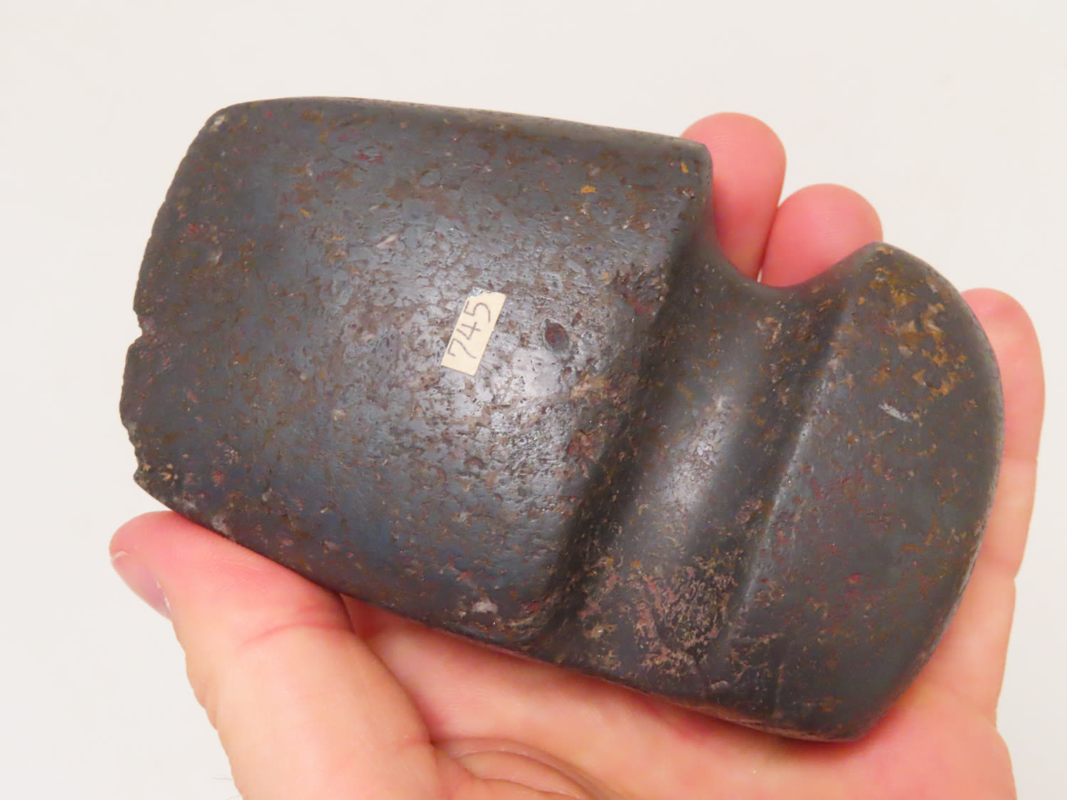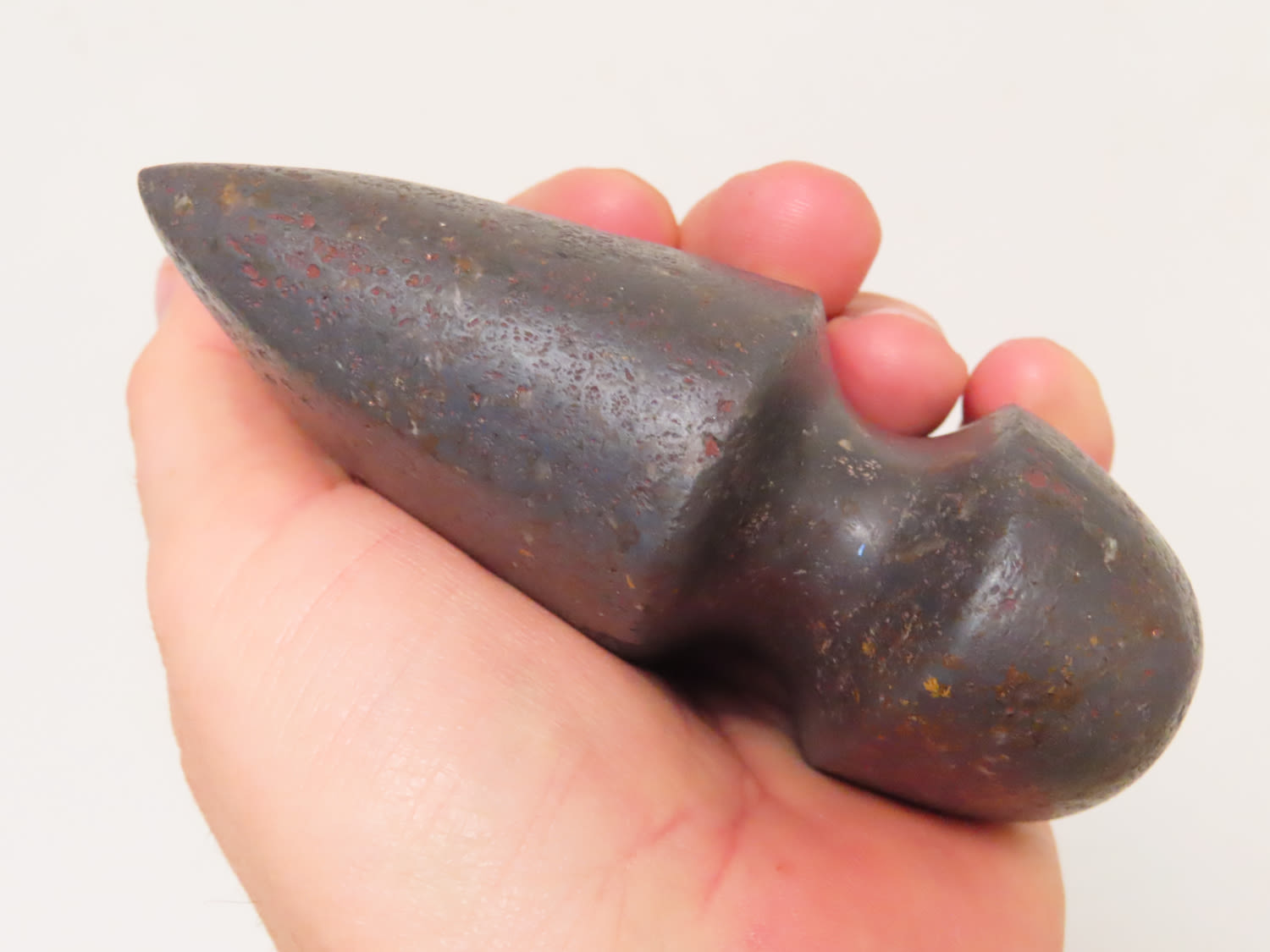 4 5/8″ PHENOMENAL HEMATITE 3/4 GROOVE AXE, MOTLEY COA, FOUND IN LINCOLN COUNTY MISSOURI, INCREDIBLE FORM, SUPER DEEP GROOVE & AMAZING POLISH, STANDS UP NICELY ON ITS EDGE, VERY HIGHLY DEVELOPED EXAMPLE.