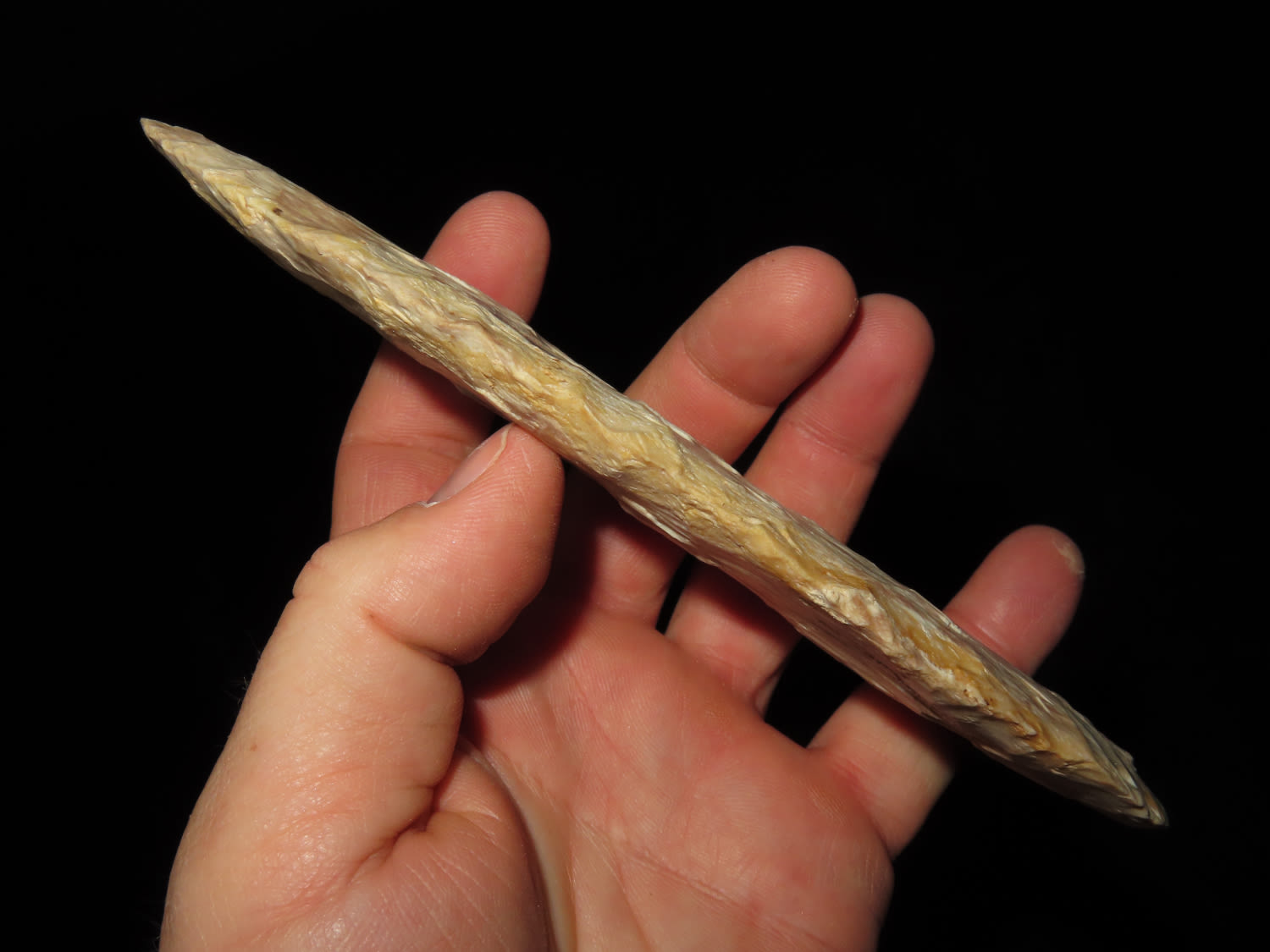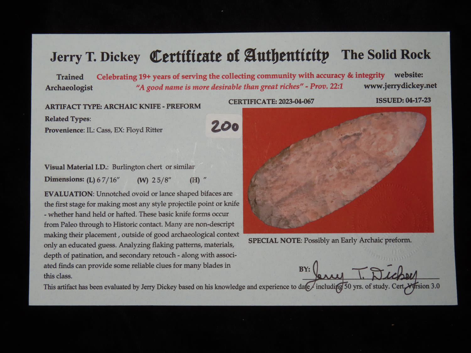 6 7/16″ OUTSTANDING ARCHAIC KNIFE, DICKEY COA, FOUND IN CASS COUNTY ILLINOIS, AMAZING COLOR & EXCEPTIONAL FLAKING