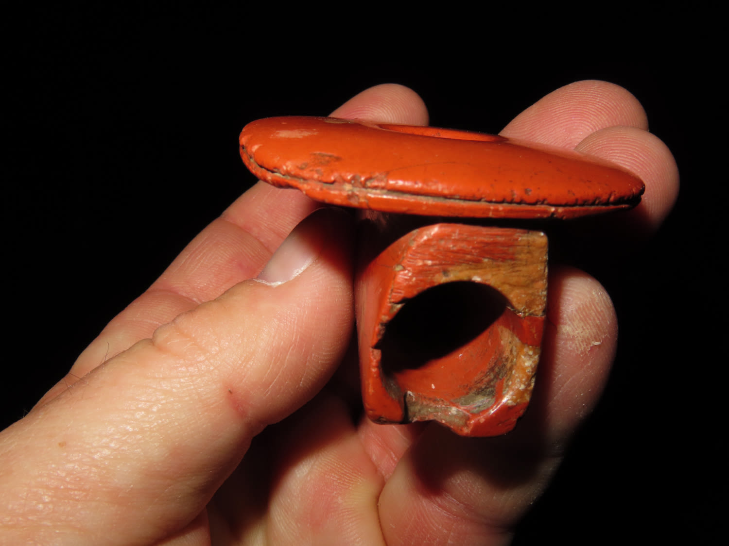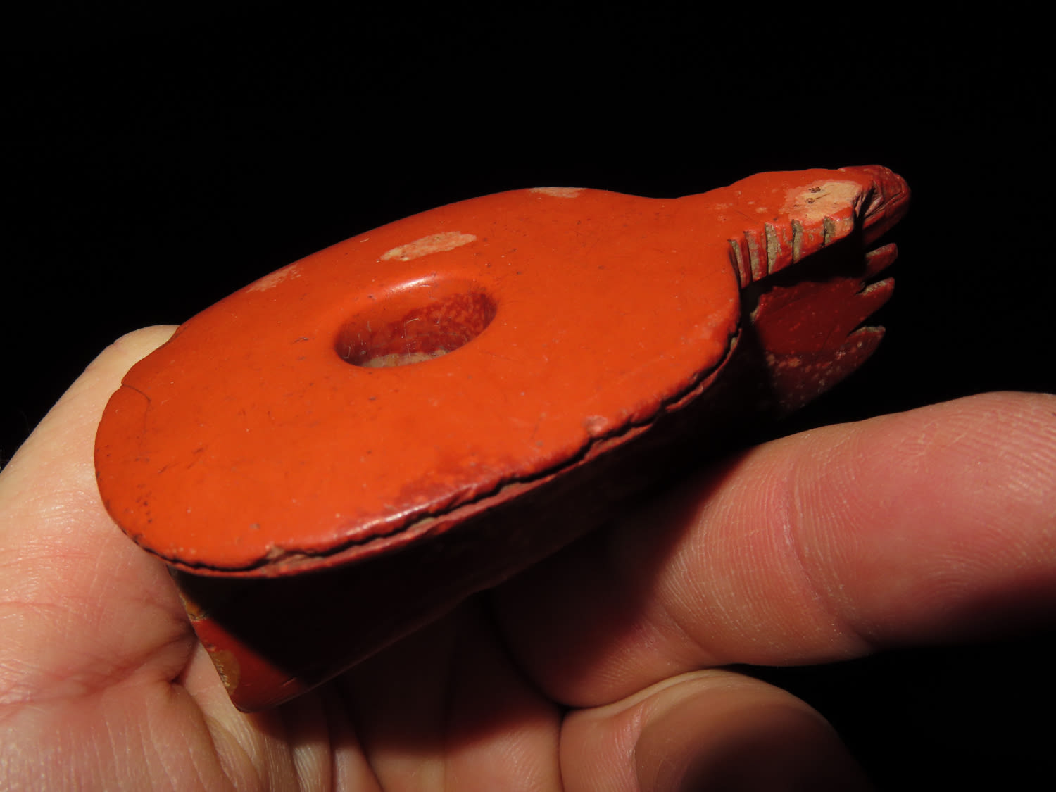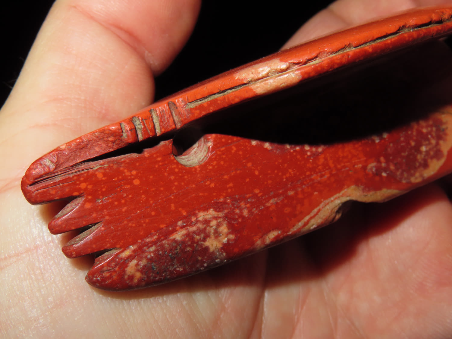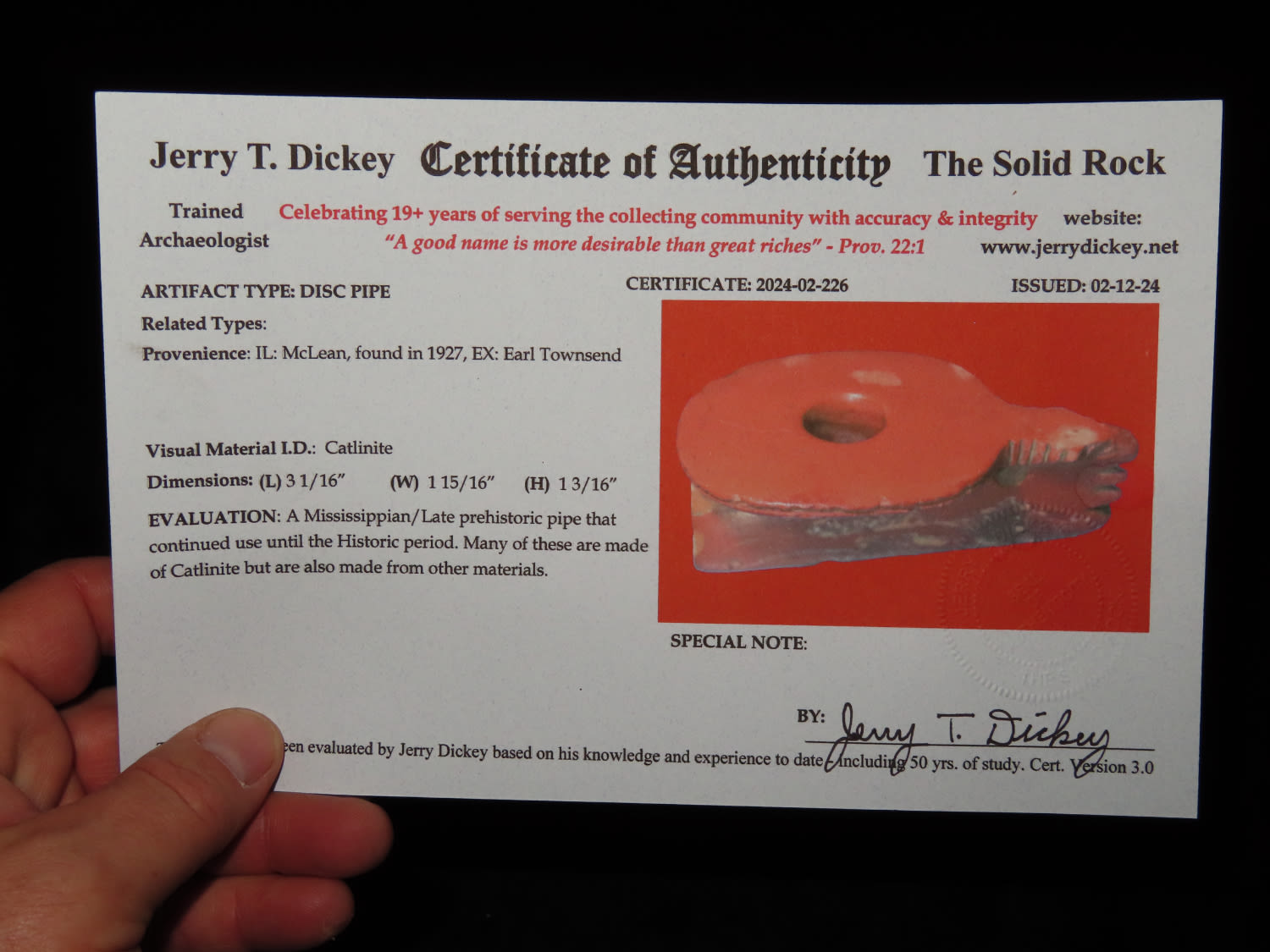EX TOWNSEND 3 1/16″ ENGRAVED CATLINITE DISC PIPE, DICKEY COA, FOUND IN MCCLEAN COUNTY ILLINOIS, EX LARRY FRANK, GREAT EXAMPLE WITH LOTS OF DESIGN