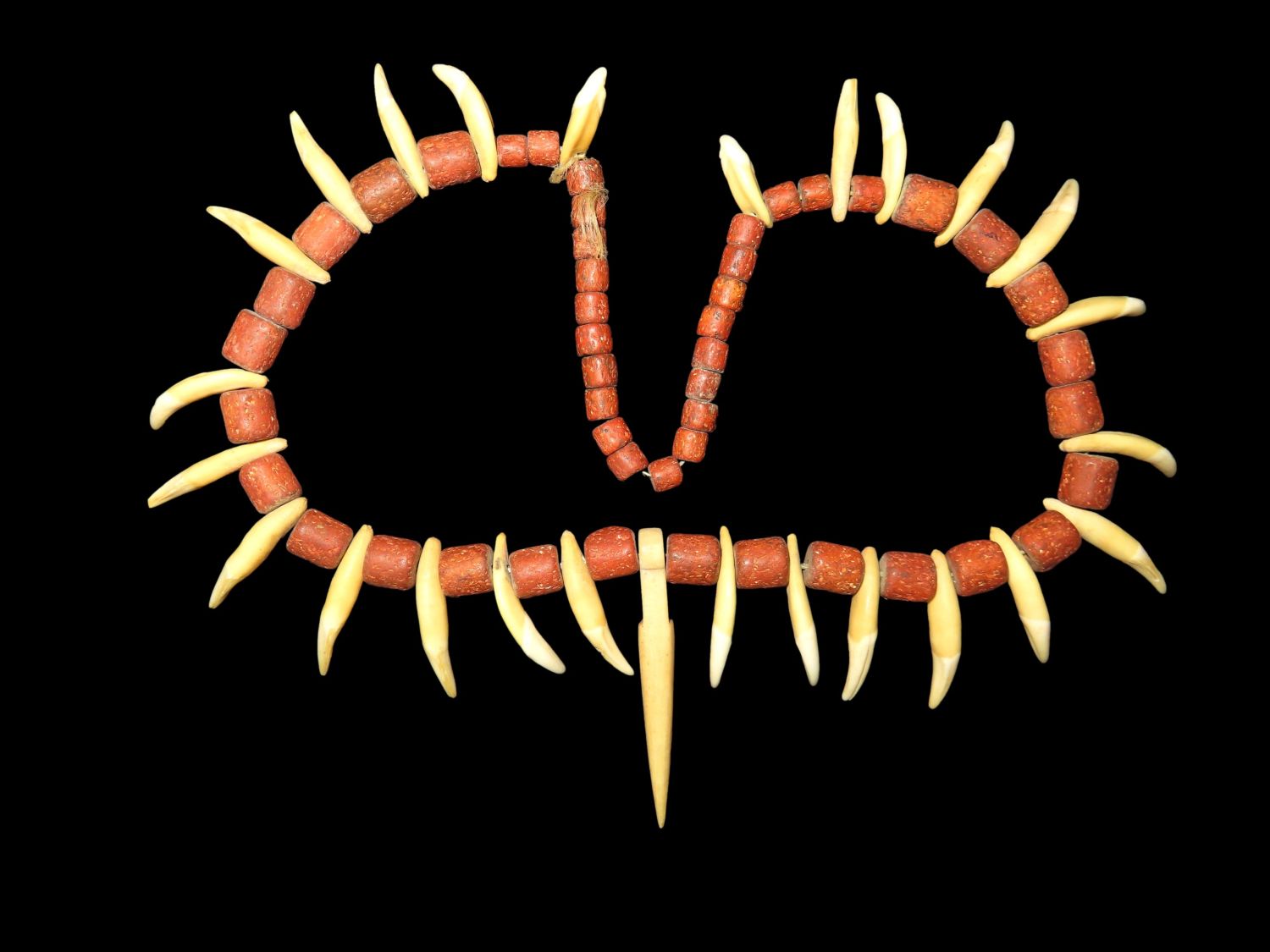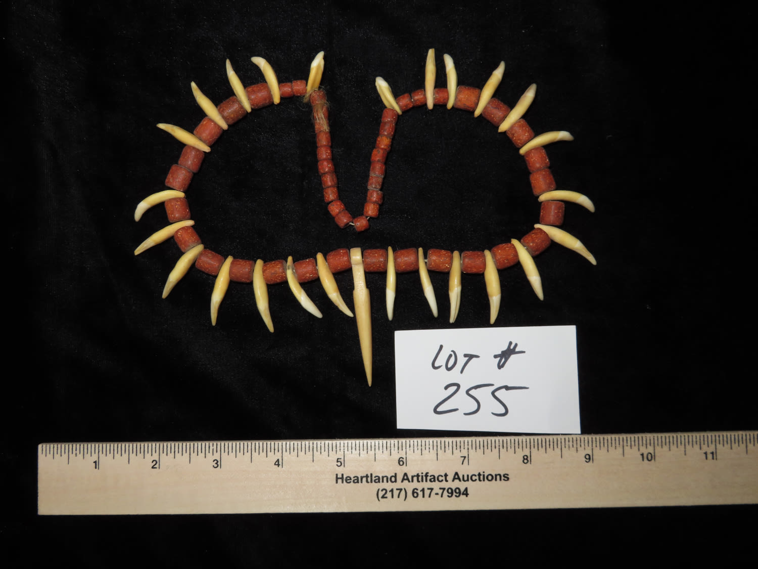 17″ LONG HISTORIC PLAINS INDIAN CANINE TOOTH & TRADE BEAD NECKLACE FROM NORTH DAKOTA, CIRCA 19TH CENTURY ERA
