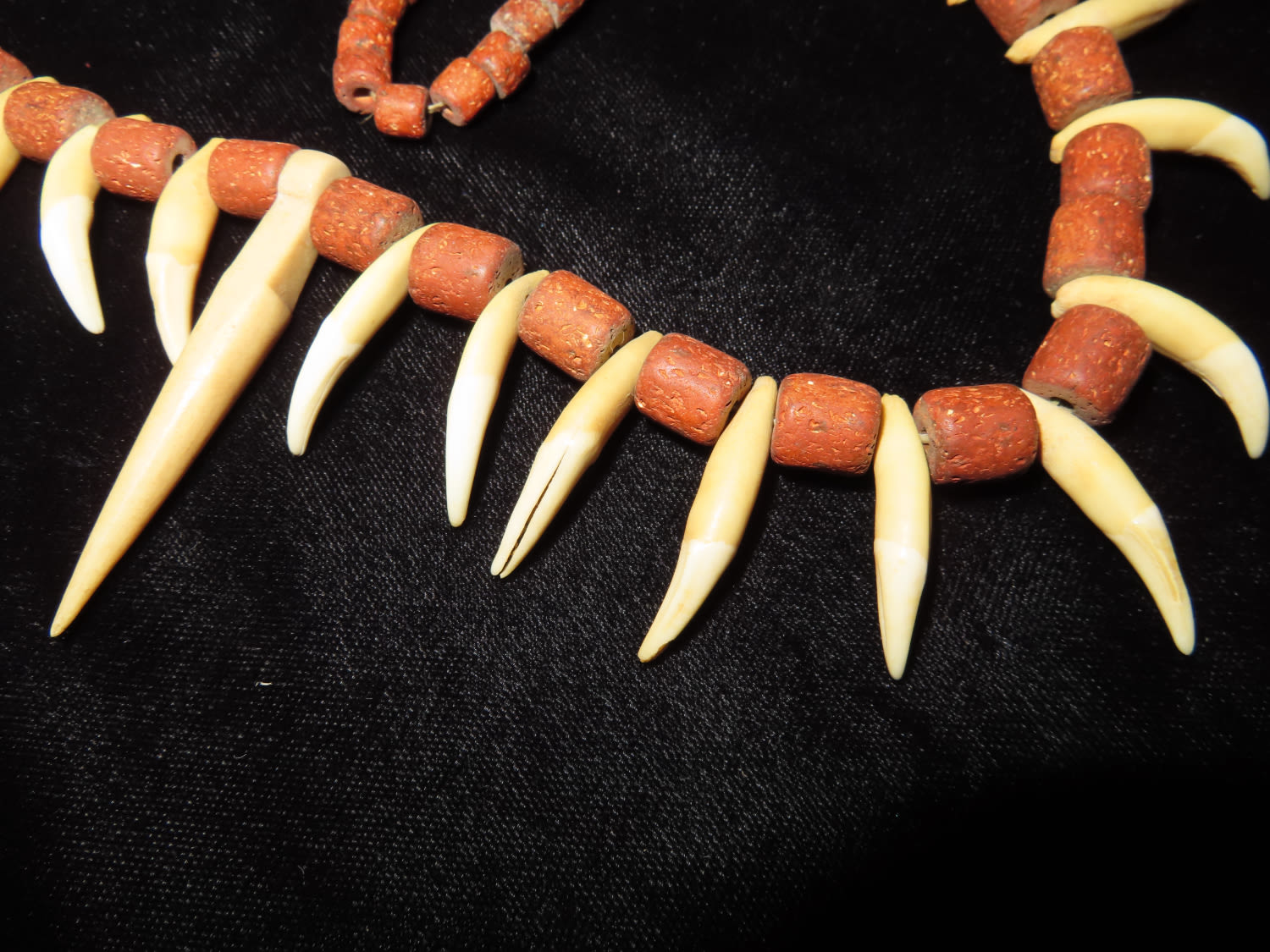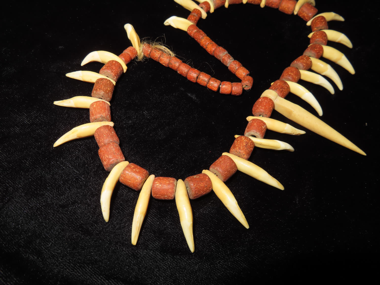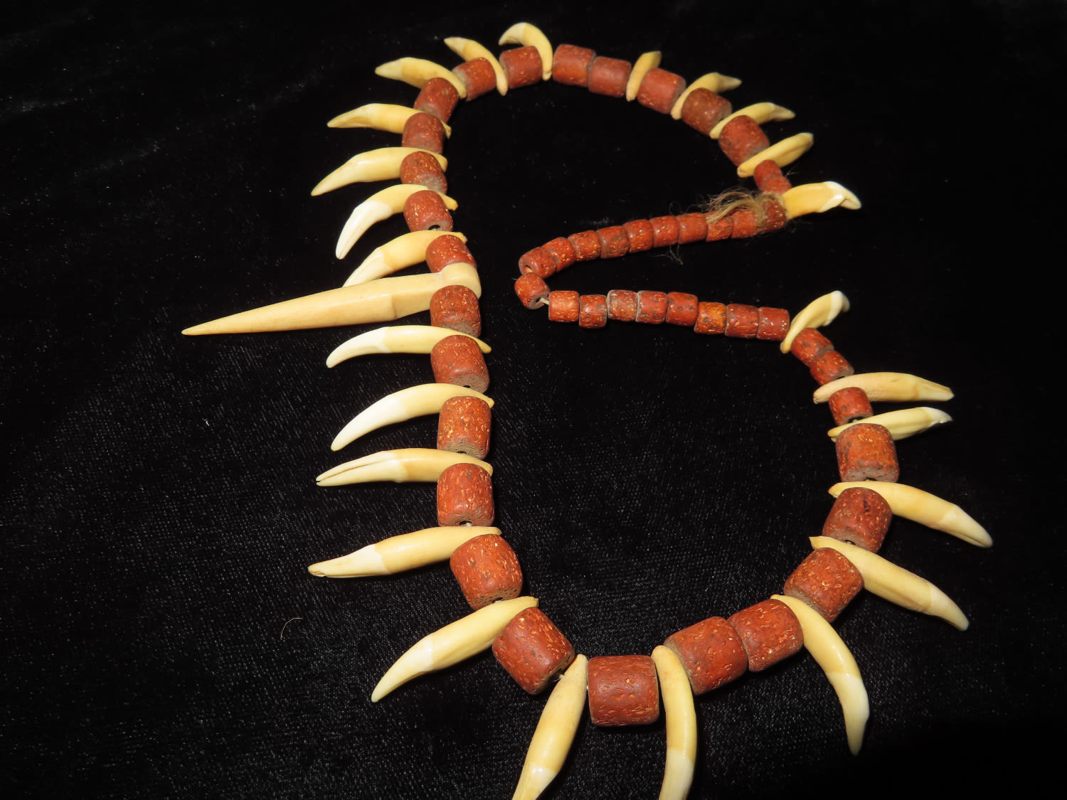 17" LONG HISTORIC PLAINS INDIAN CANINE TOOTH & TRADE BEAD NECKLACE FROM NORTH DAKOTA, CIRCA 19TH CENTURY ERA