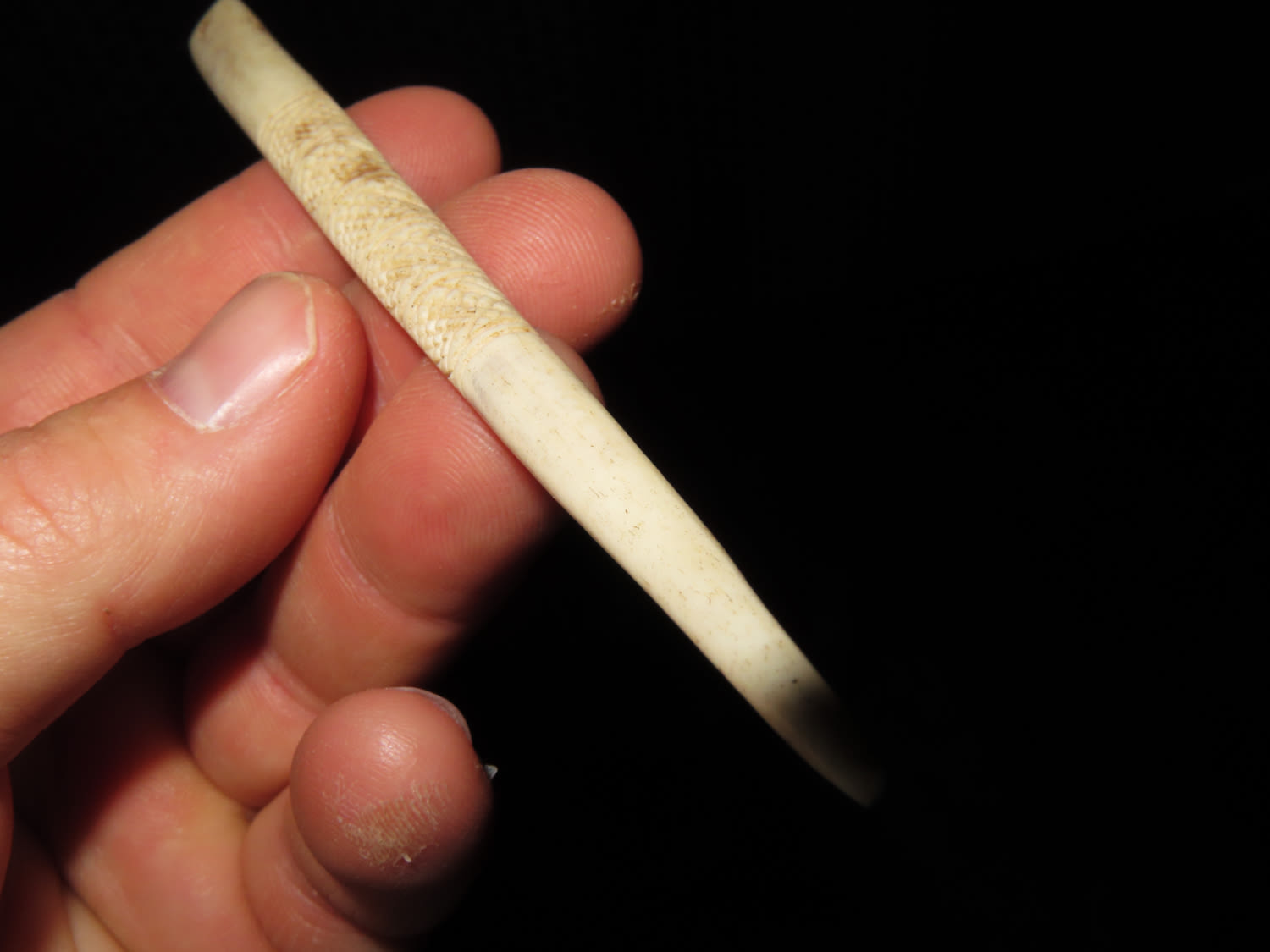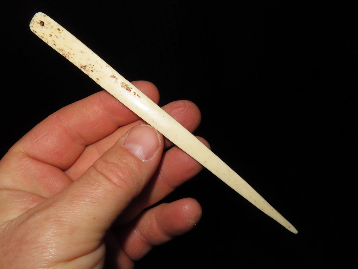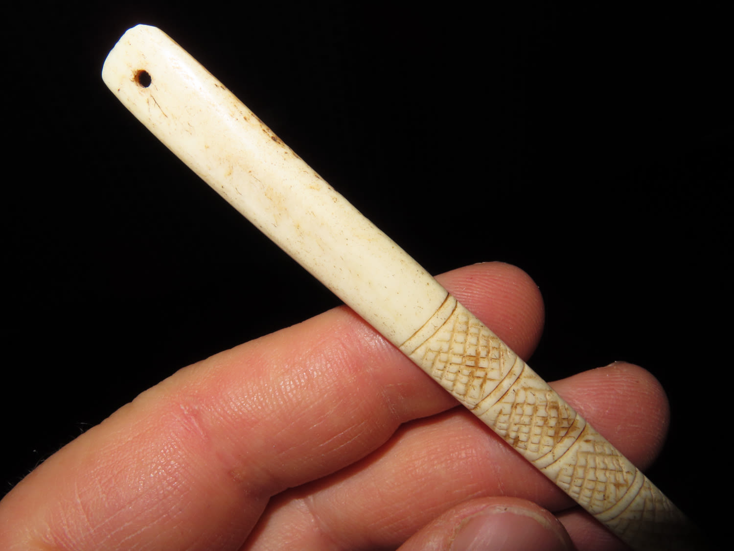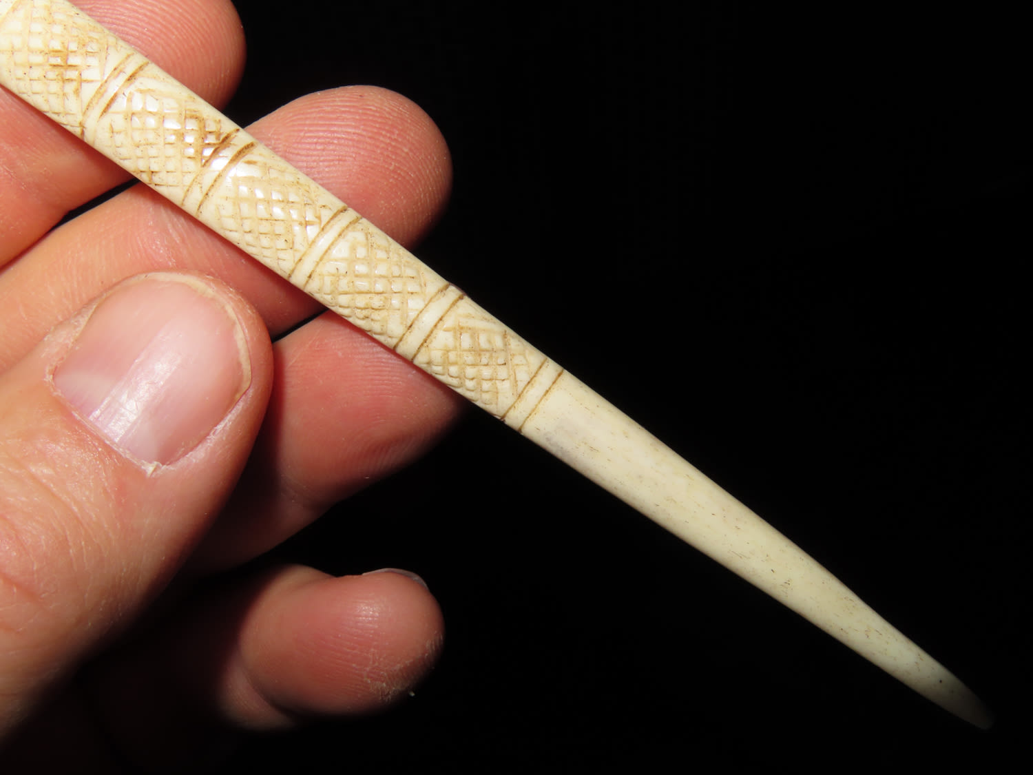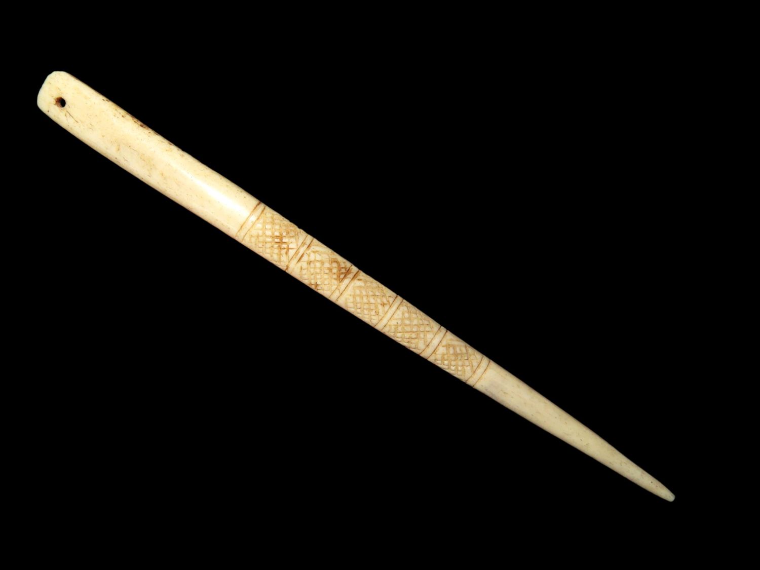 6″ LONG NORTHWEST COAST ENGRAVED BONE HAIRPIN, NICE SLICK POLISH & VERY INTRICATE DESIGN, DRILLED AT TOP LIKELY TO ATACH OTHER ADORNMENT