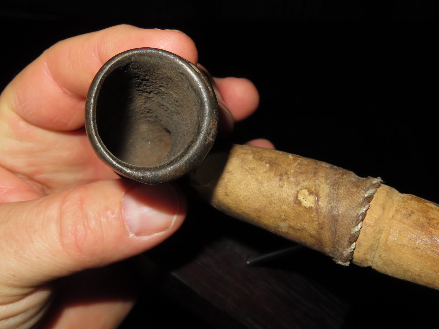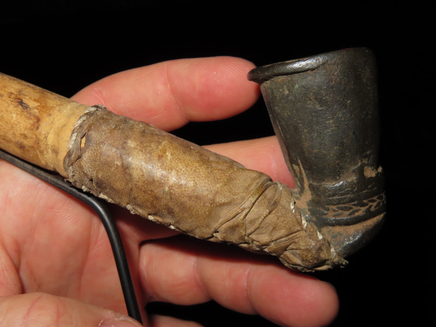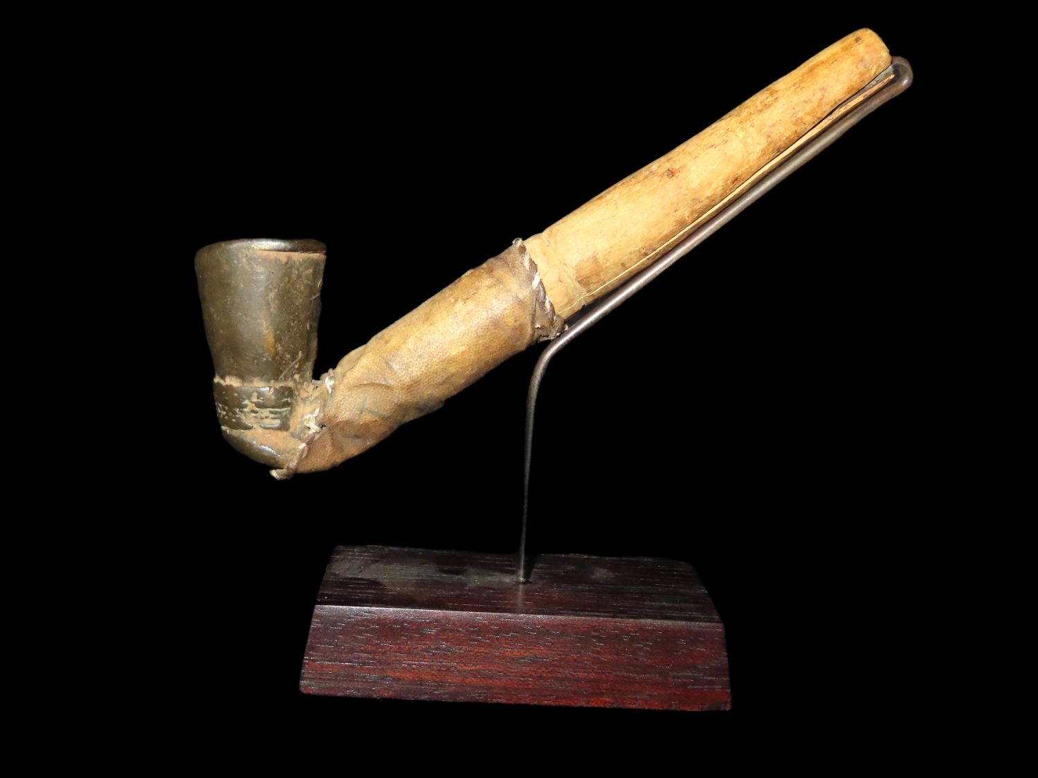 6 1/2″ HISTORIC ERA METAL PIPE WITH WOODEN LEATHER WRAPPED STEM, COMES WITH A VERY NICE MUSEUM DISPLAY STAND, NICE PLAINS INDIAN RELIC