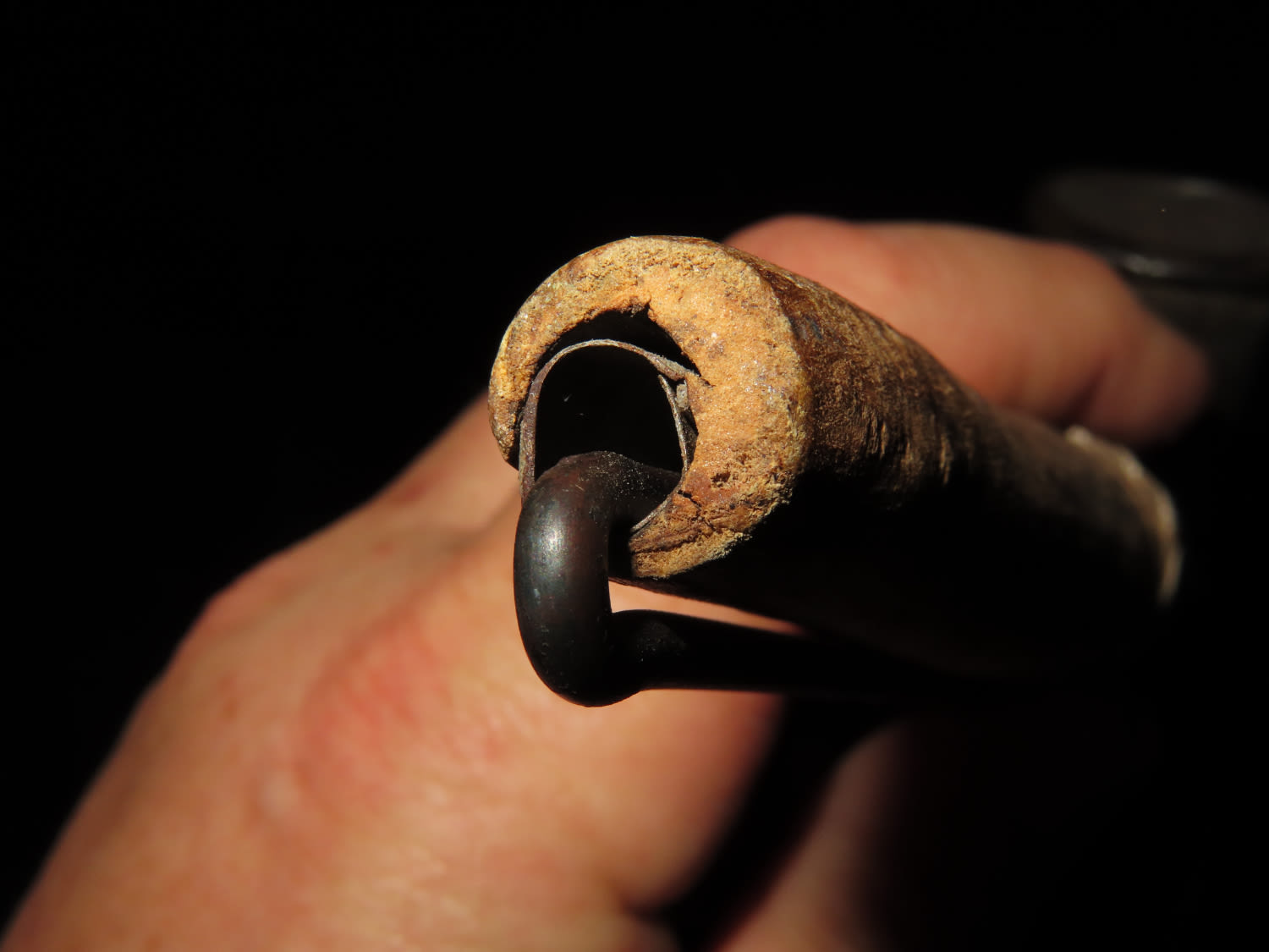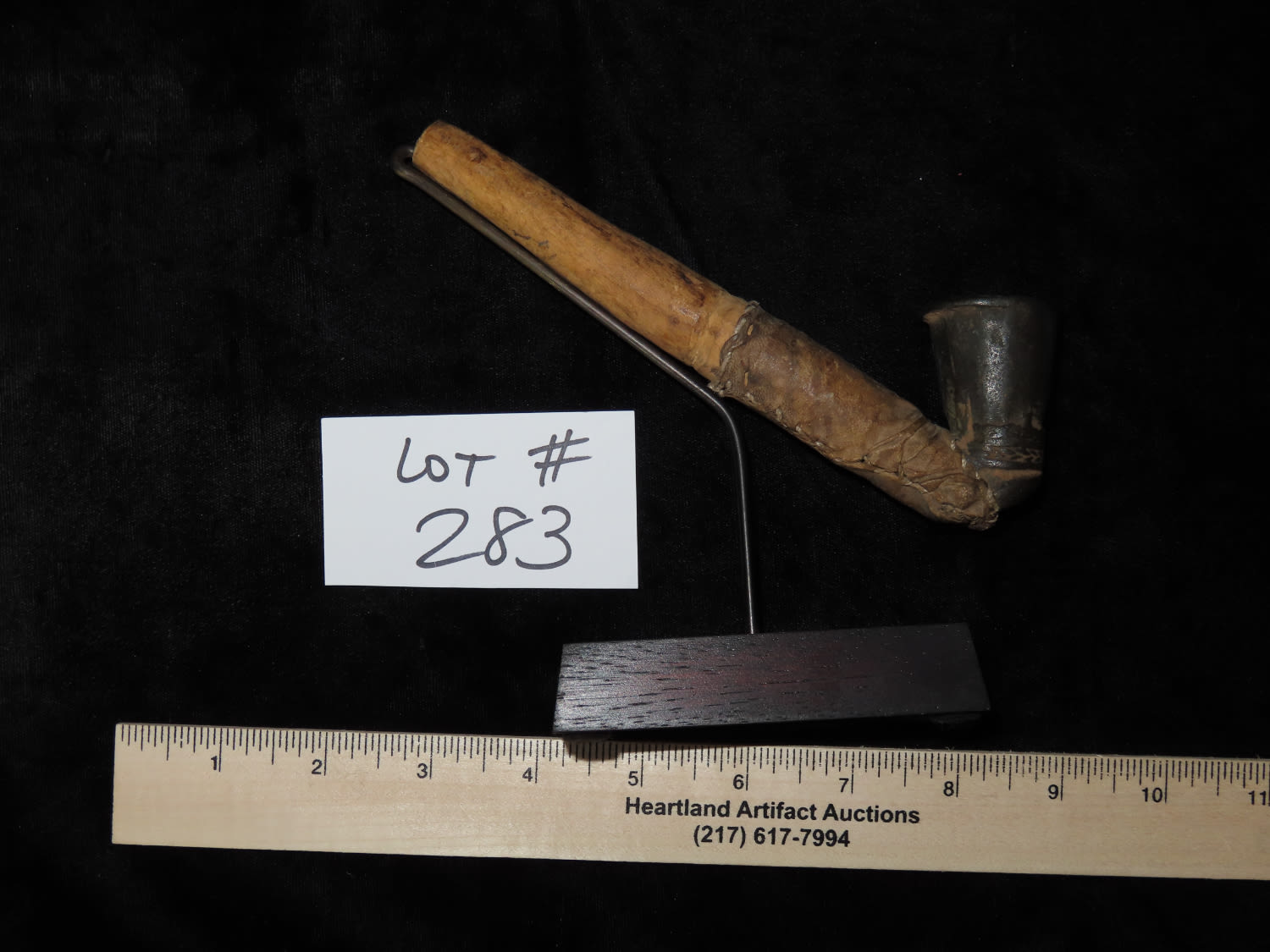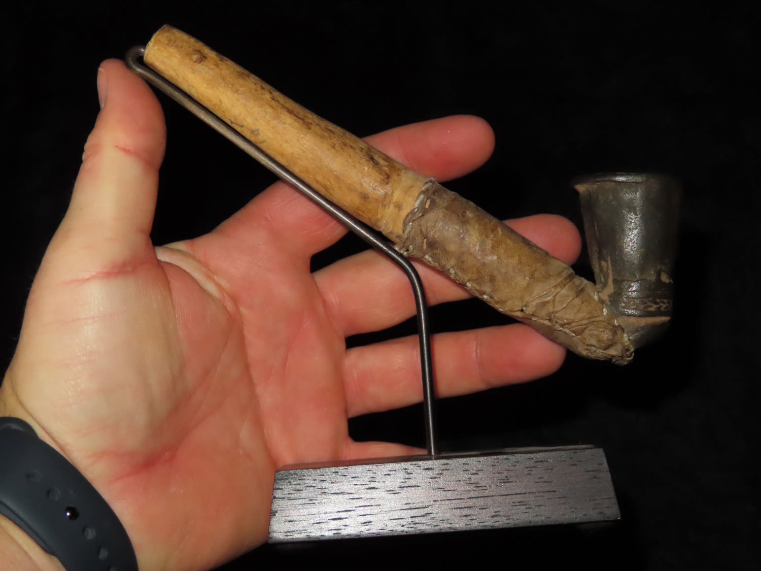 6 1/2″ HISTORIC ERA METAL PIPE WITH WOODEN LEATHER WRAPPED STEM, COMES WITH A VERY NICE MUSEUM DISPLAY STAND, NICE PLAINS INDIAN RELIC