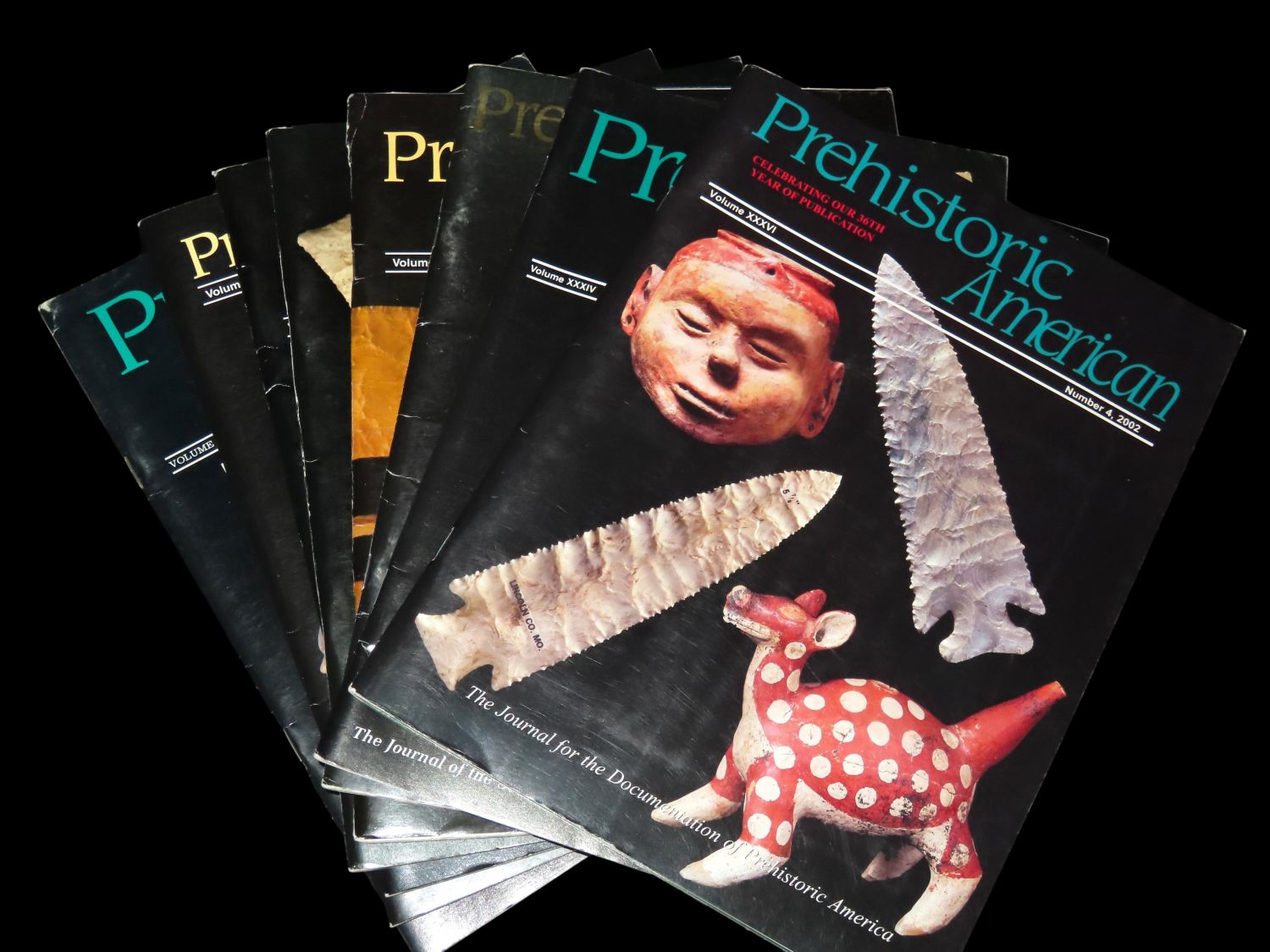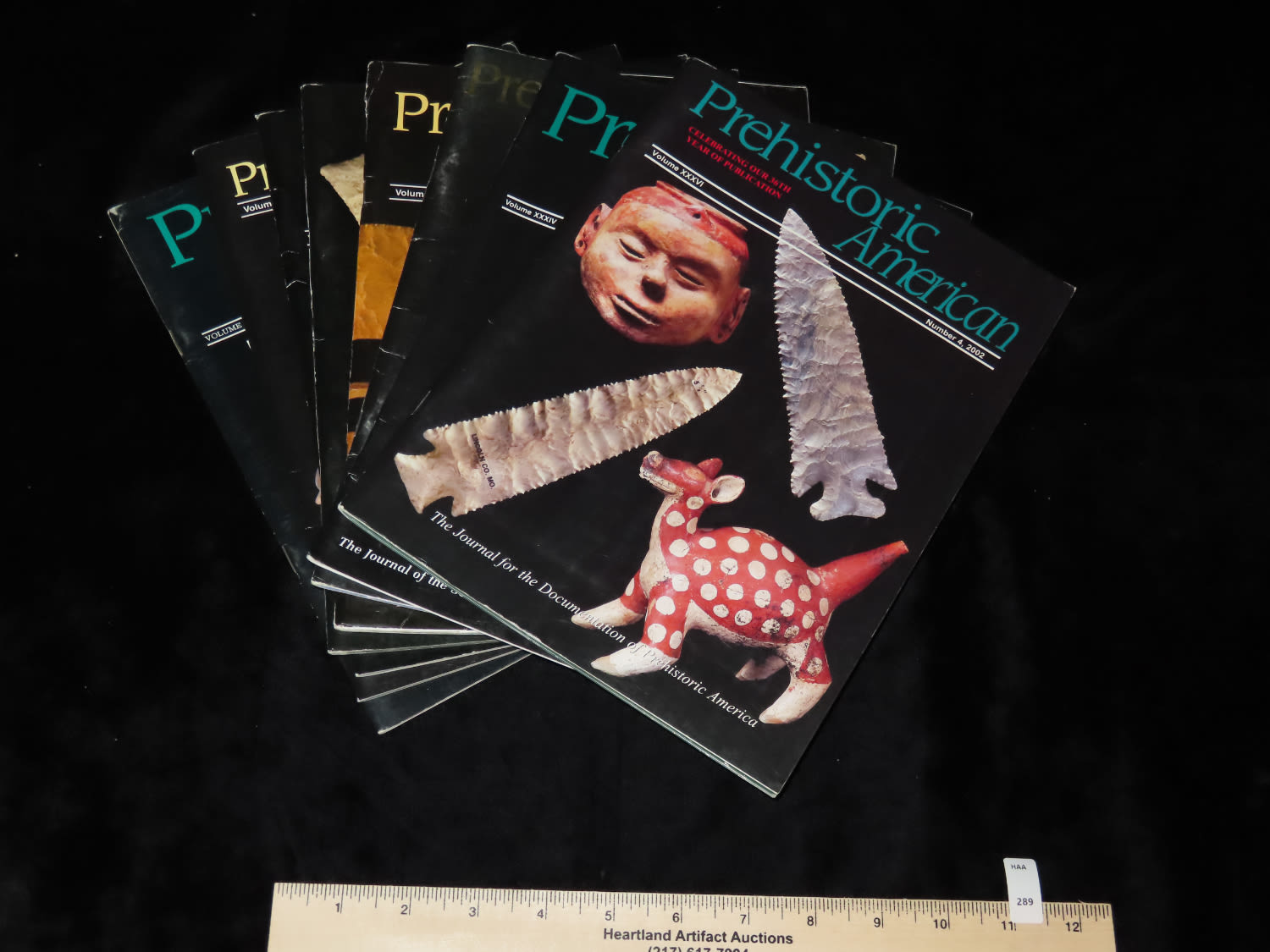 LOT OF 8 “PREHISTORIC AMERICAN” INDIAN ARTIFACT MAGAZINES FULL OF BANNERSTONES, AXES, CLOVIS, POTTERY, PIPES, DISCOIDALS, ETC