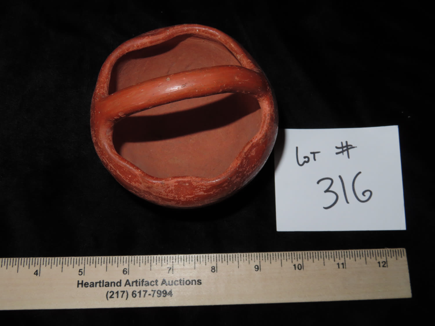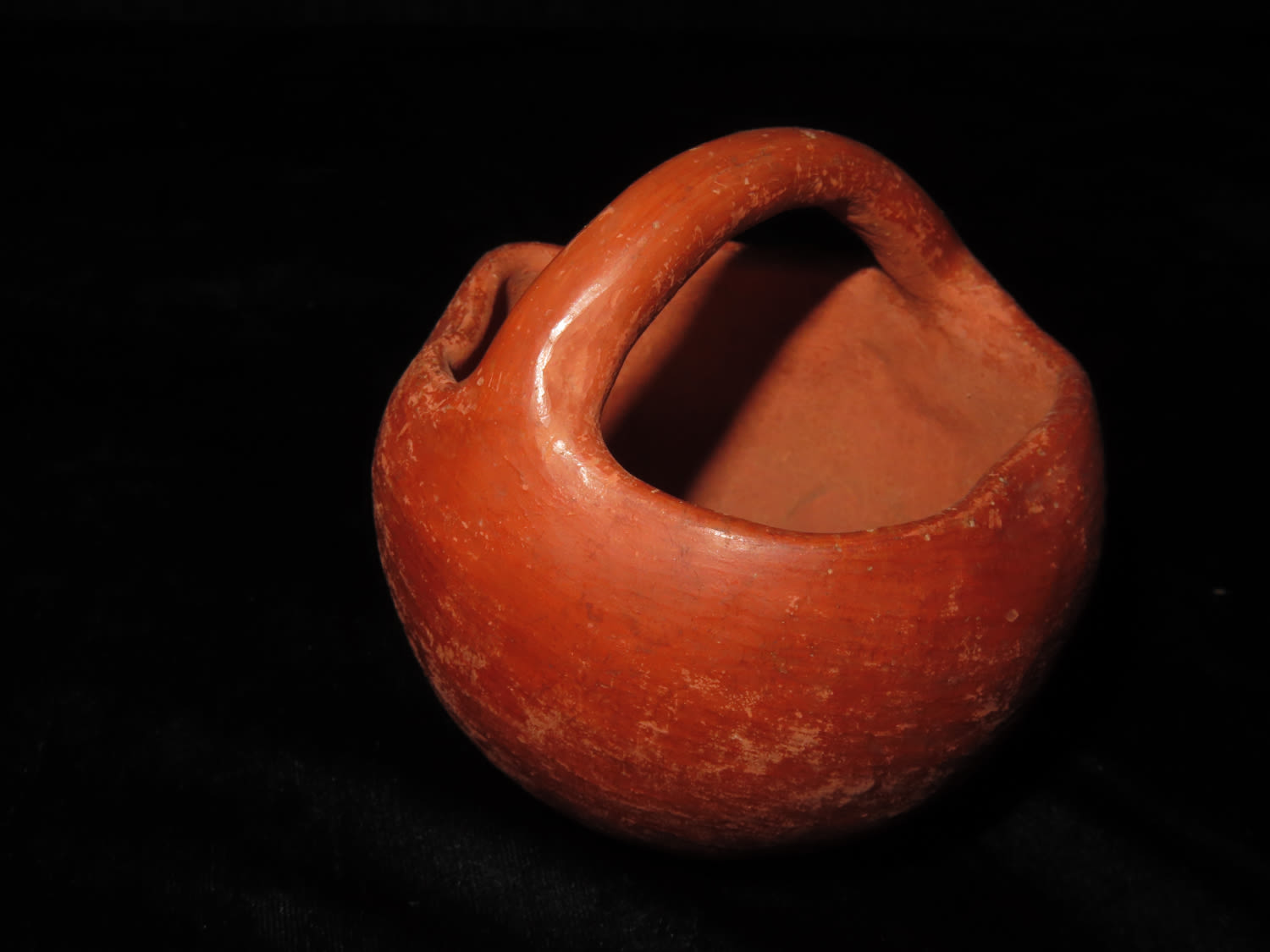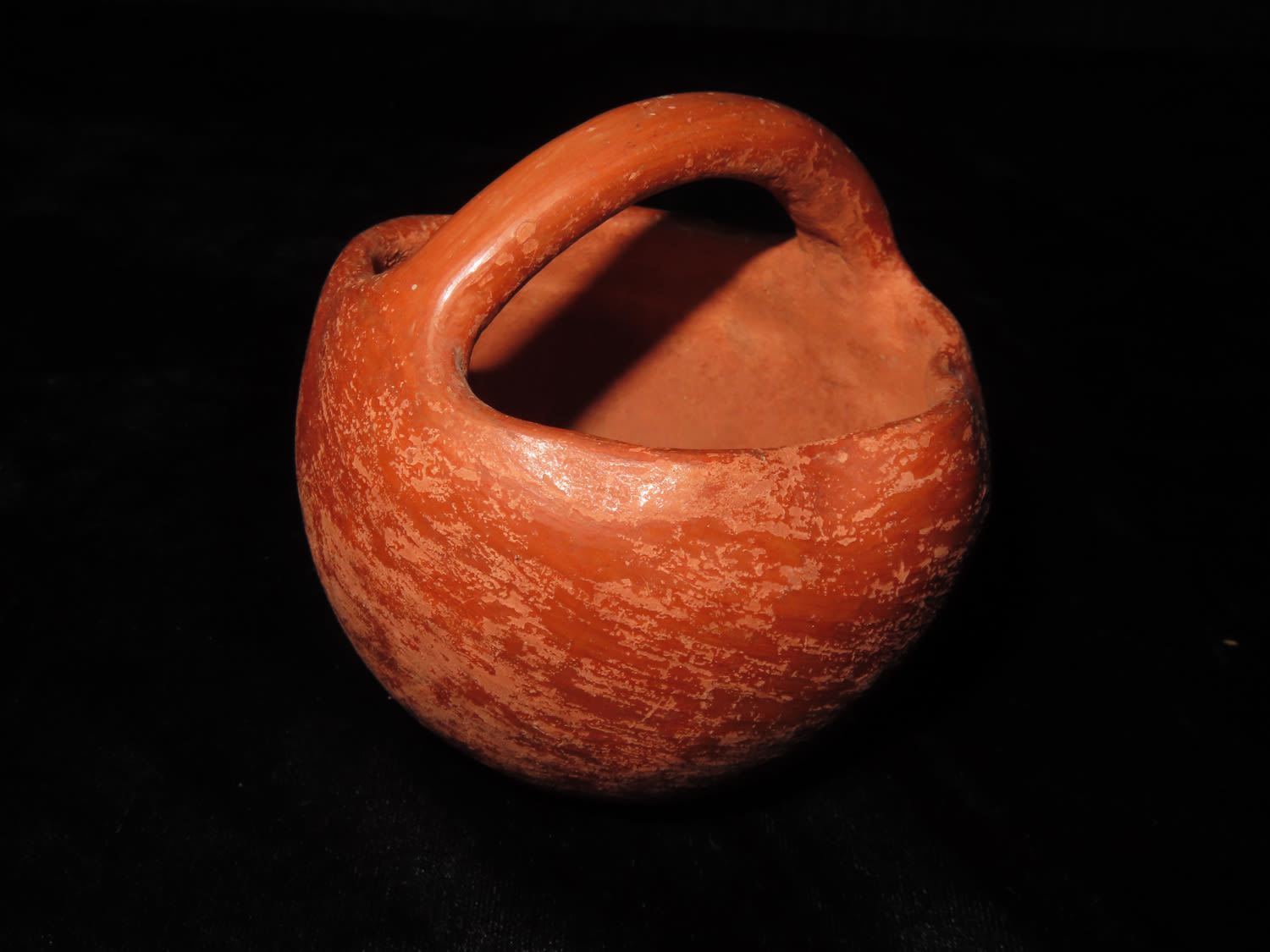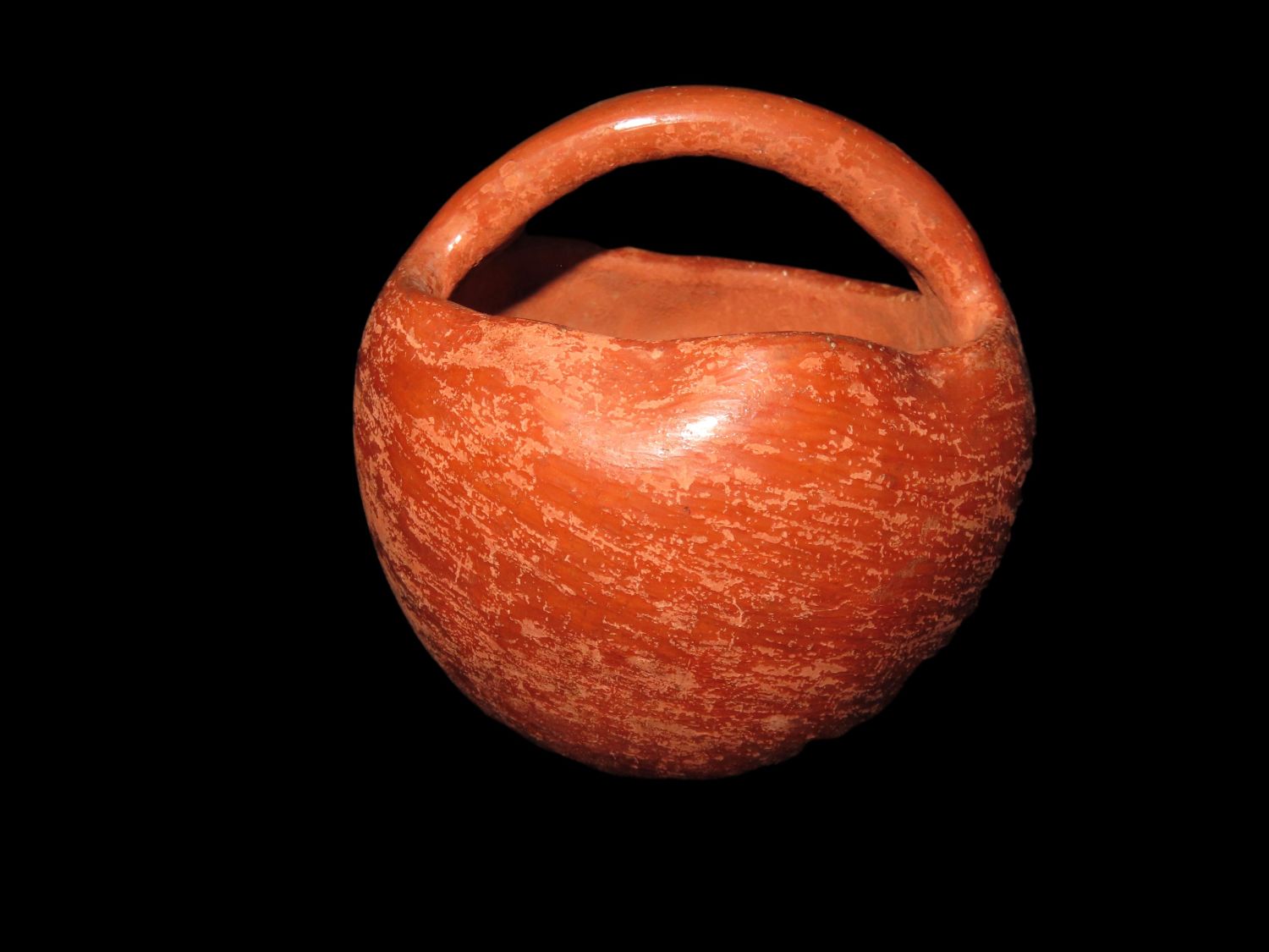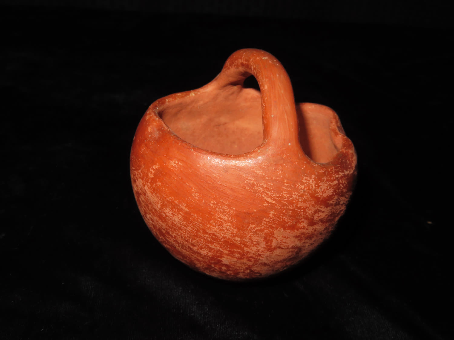 EARLY ACOMA / PUEBLO INDIANS POTTERY HANDLED BOWL / BASKET, 4′ X 3 3/4″, HAND MADE MY BY EARLY 20TH NATIVE AMERICAN INDIAN