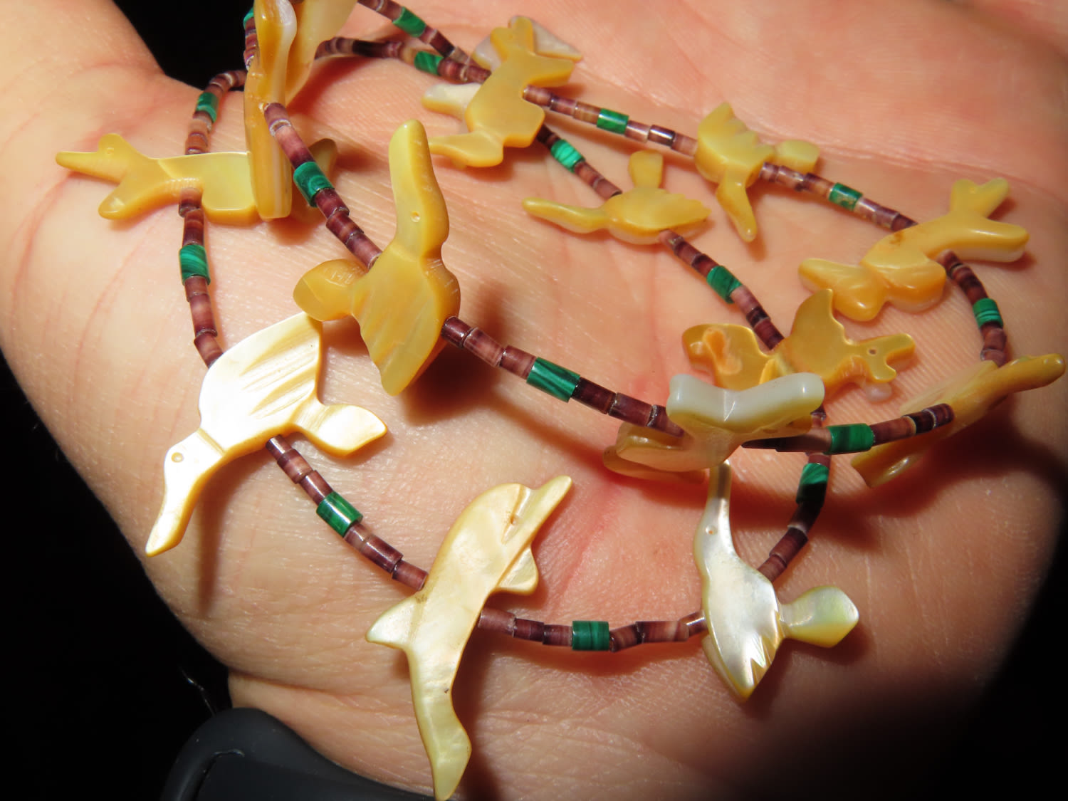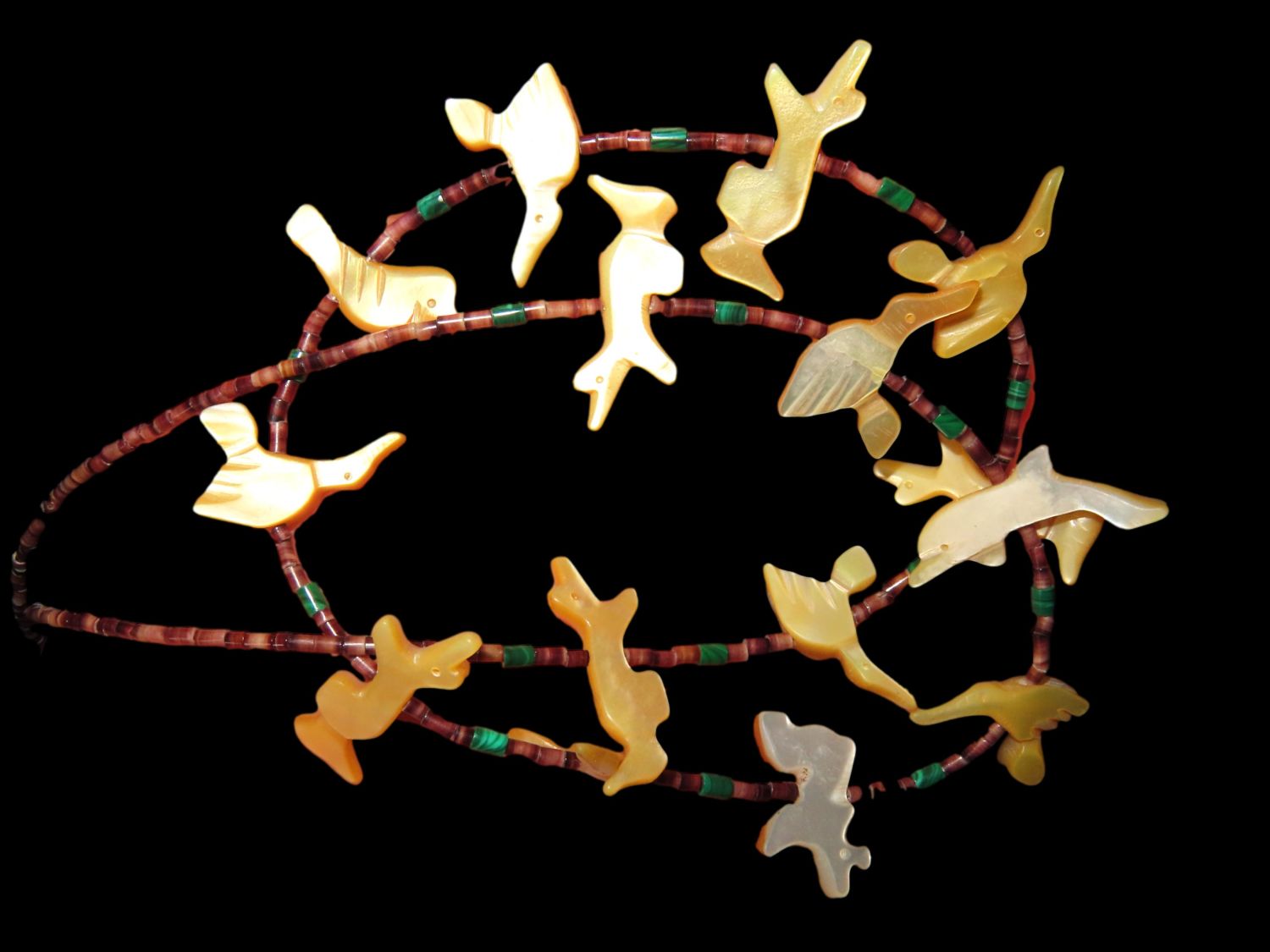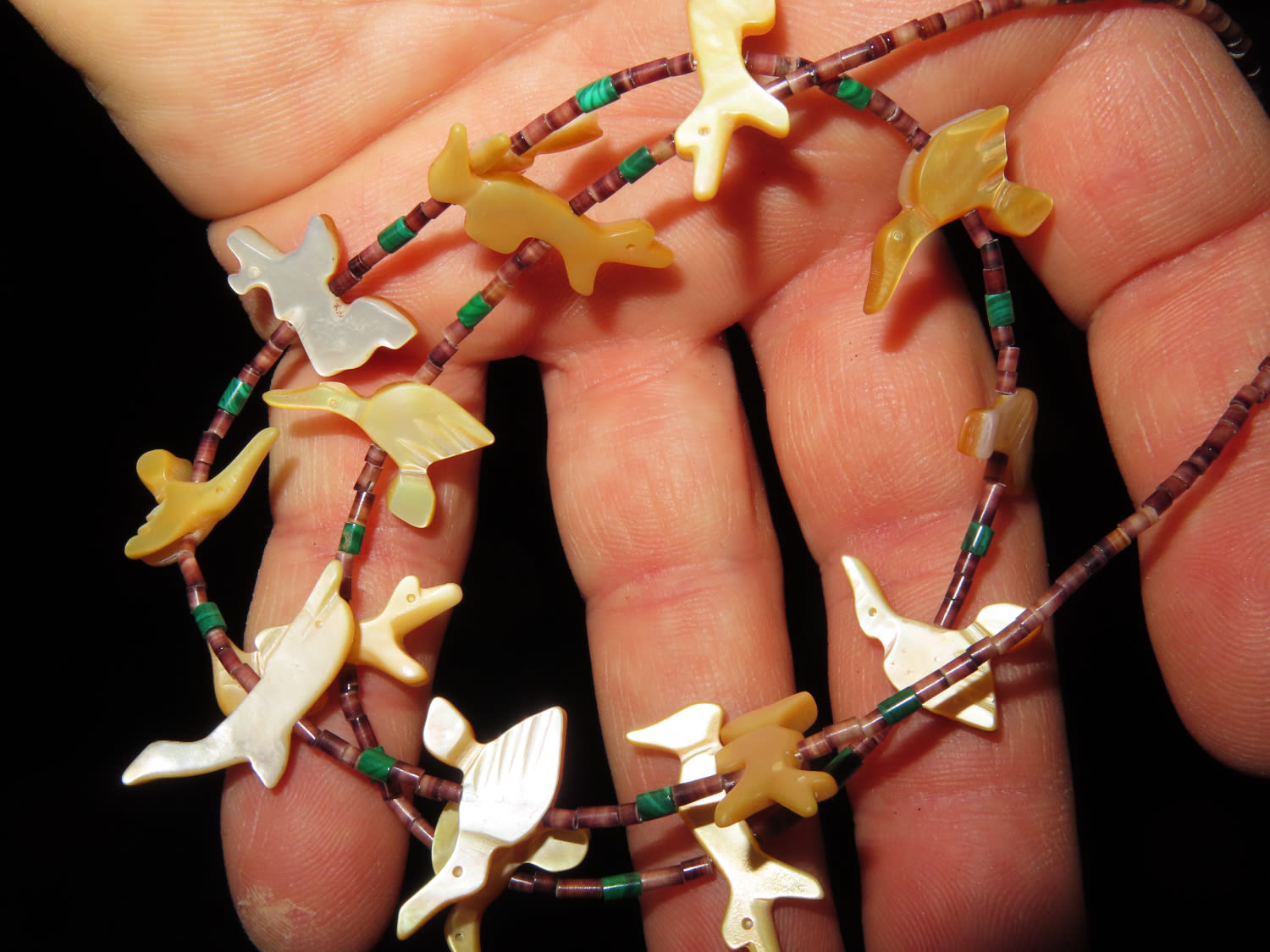 22″ ZUNI ANIMAL EFFIGY FETISH BEADED NECKLACE, CARVED SHELL BIRDS, BEAR, FOX, DUCK, ECT WITH TRADE BEADS & BEAUTIFUL GREEN MALACHITE BEADS
