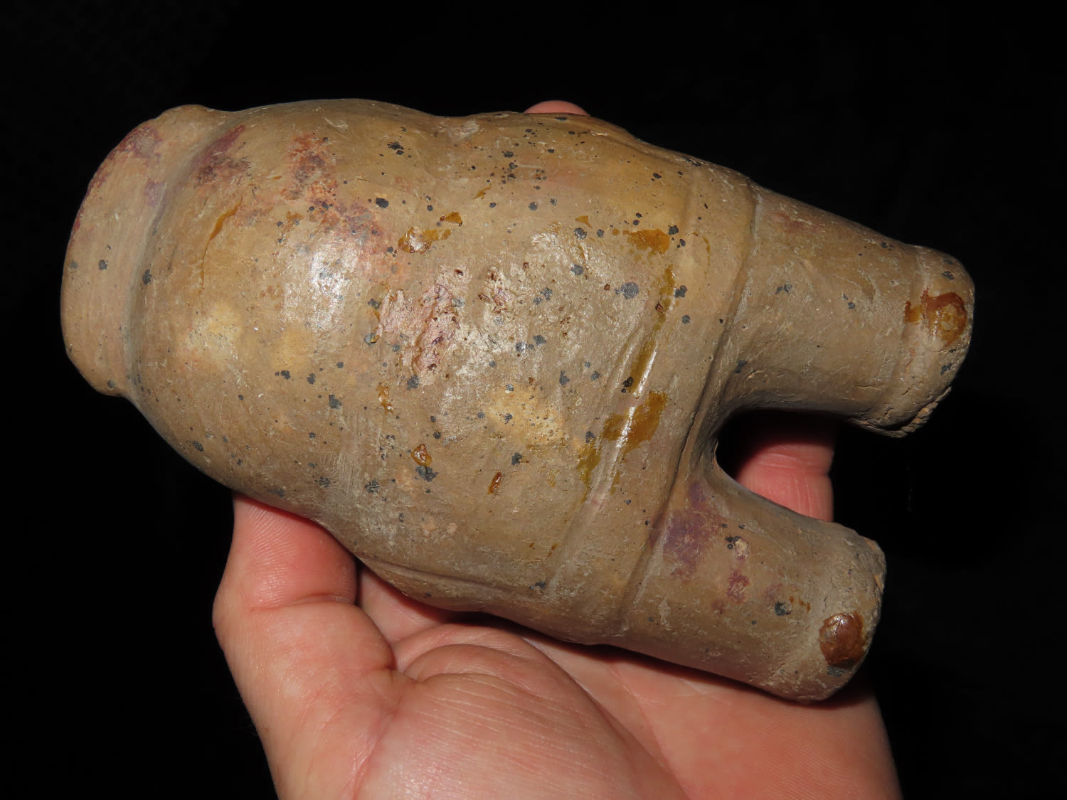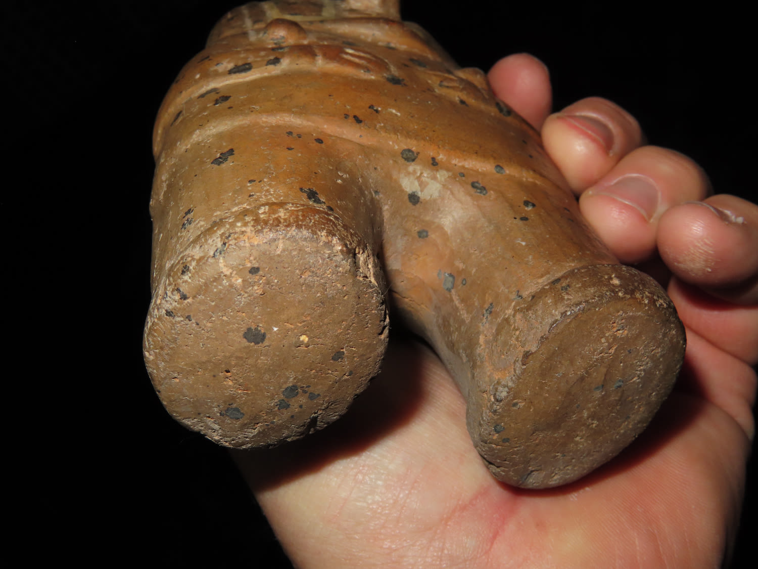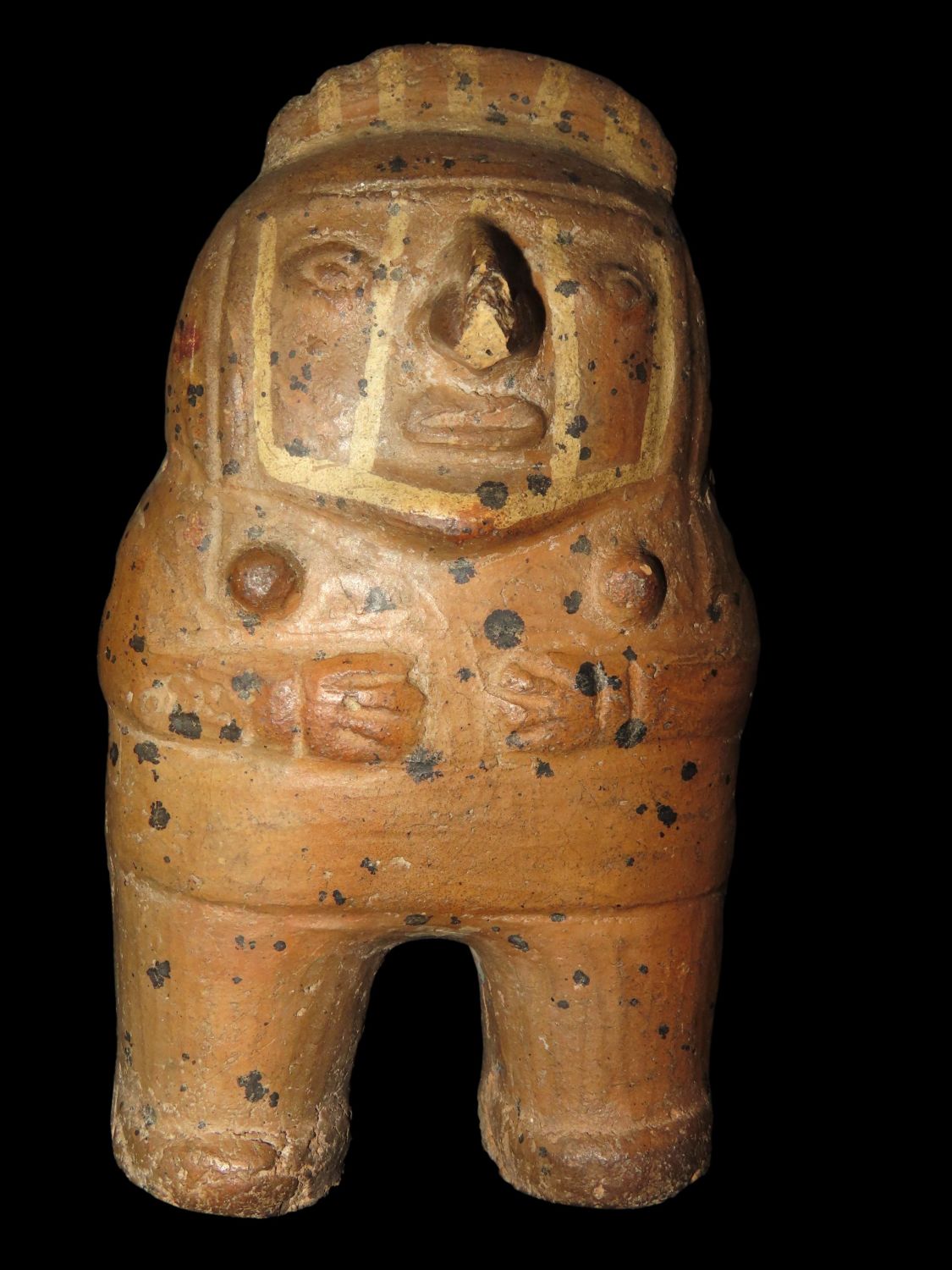 5 3/4″ POTTERY HUMAN EFFIGY RATTLE FROM MEXICO, PRECOLUMBIAN PAINTED FIGURE, STATUE, SOLID WITH NO REPAIR, ORIGINAL PAINT, GREAT EXAMPLE