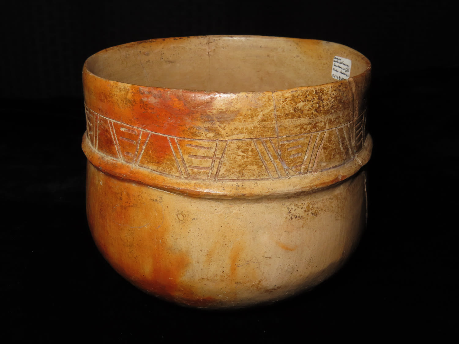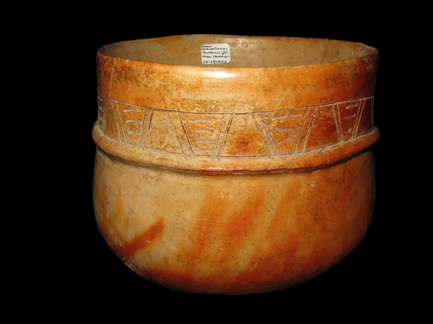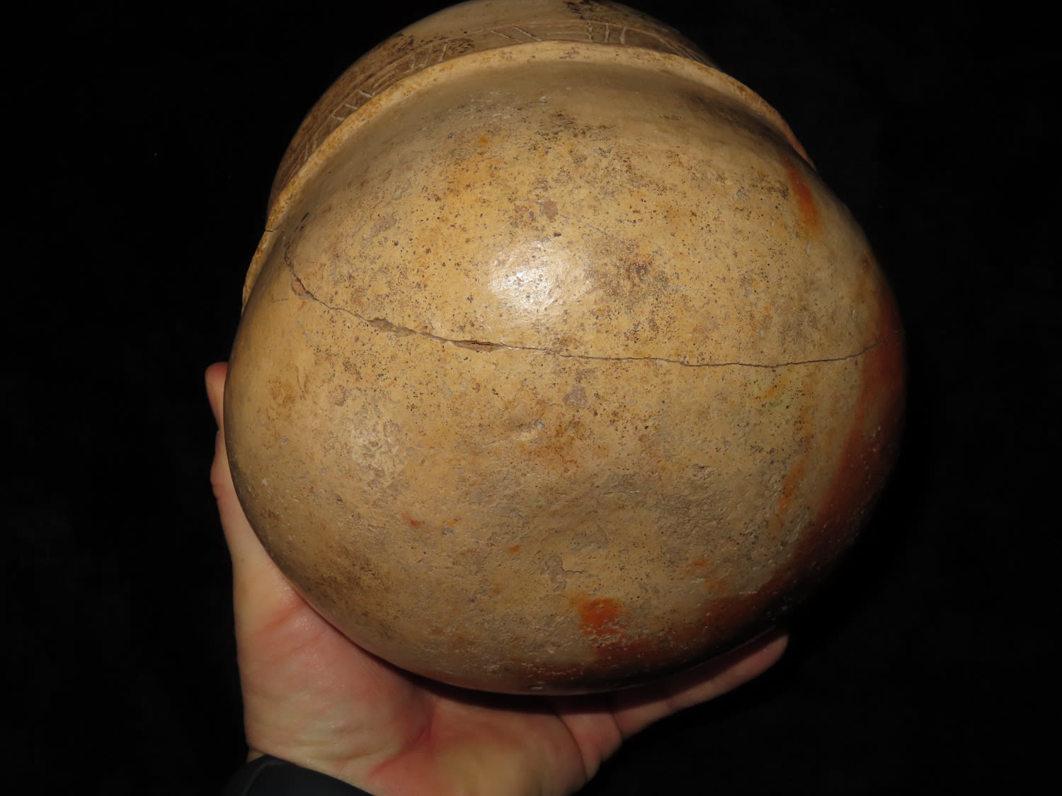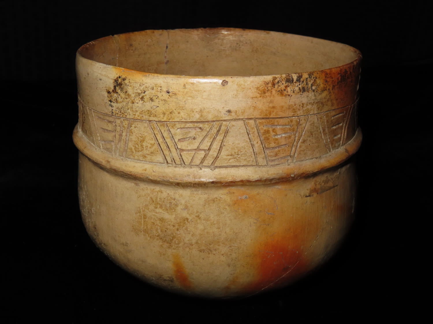 6″ ENGRAVED MAYAN POTTERY BOWL FROM GUATEMALA, EX HERB MANGOLD, DENNIS DEROSEAR, BEAUTIFUL COLOR, PRESSURE CRACKED & GLUED