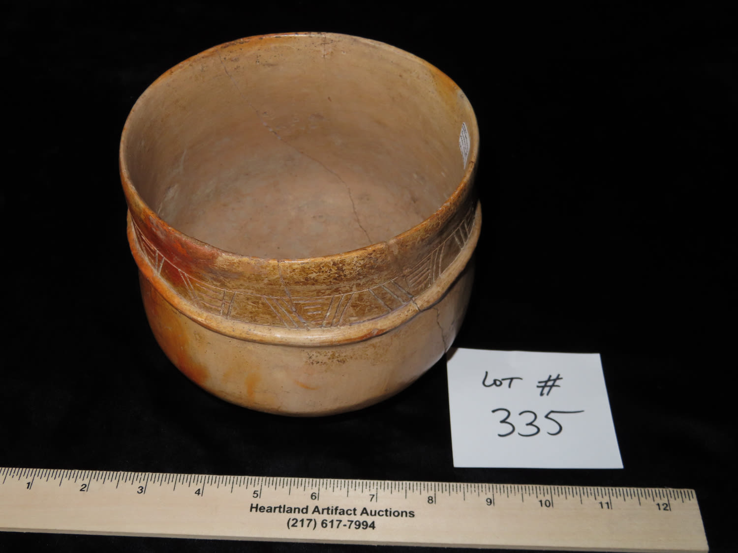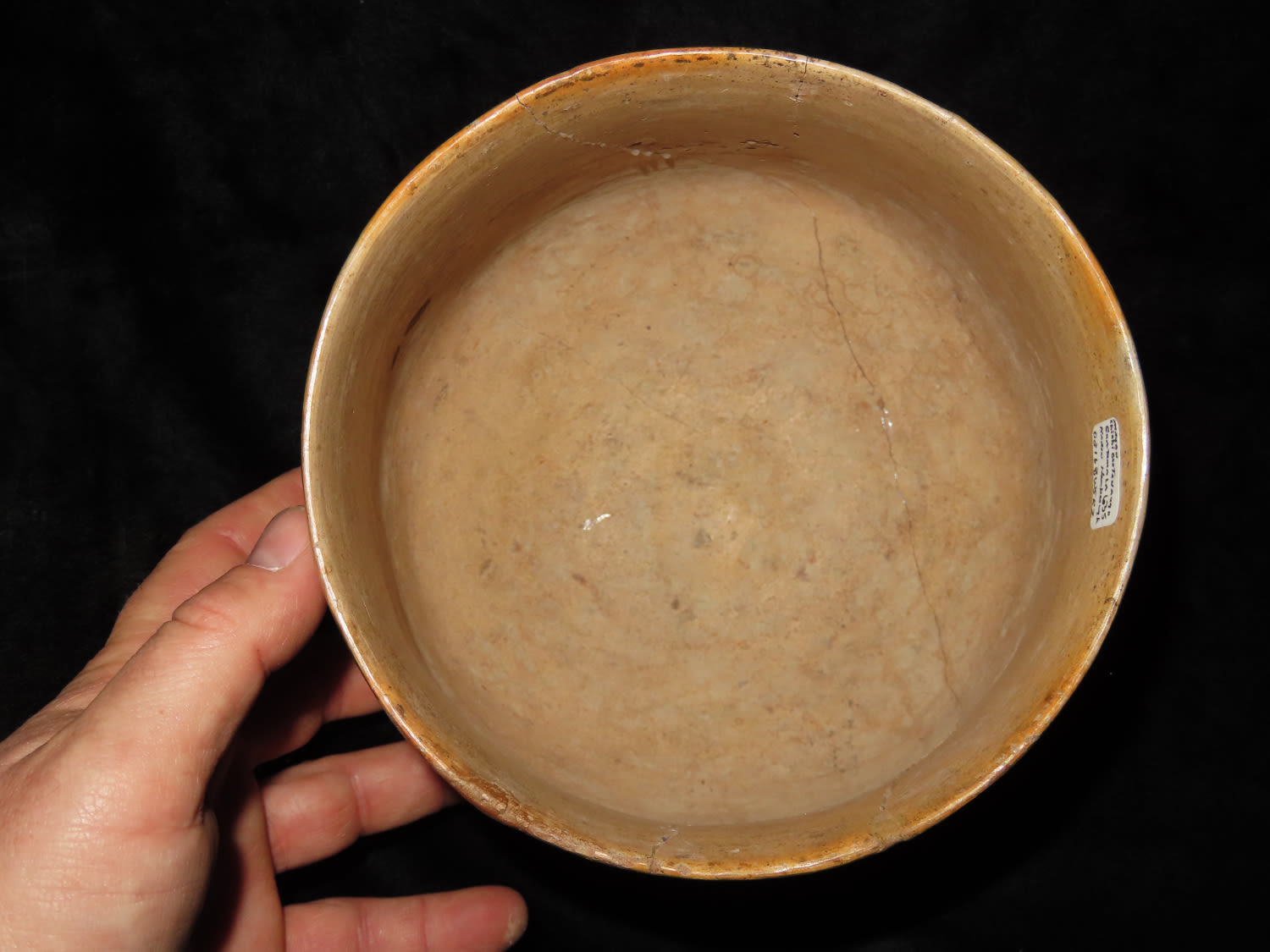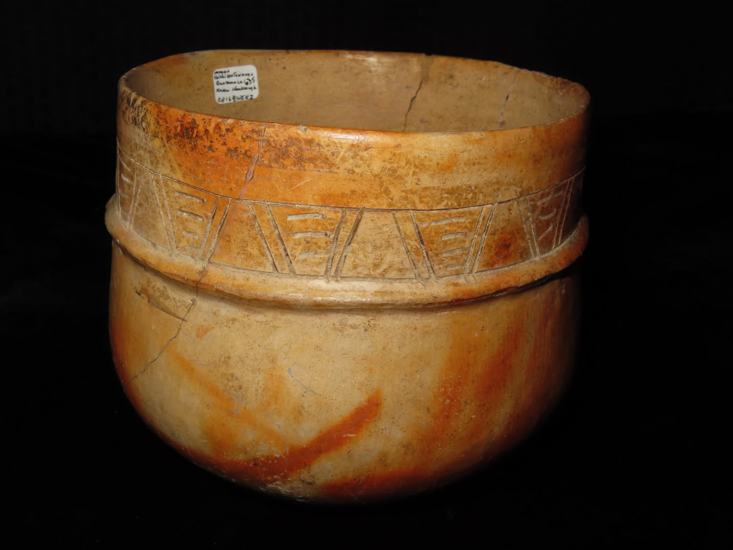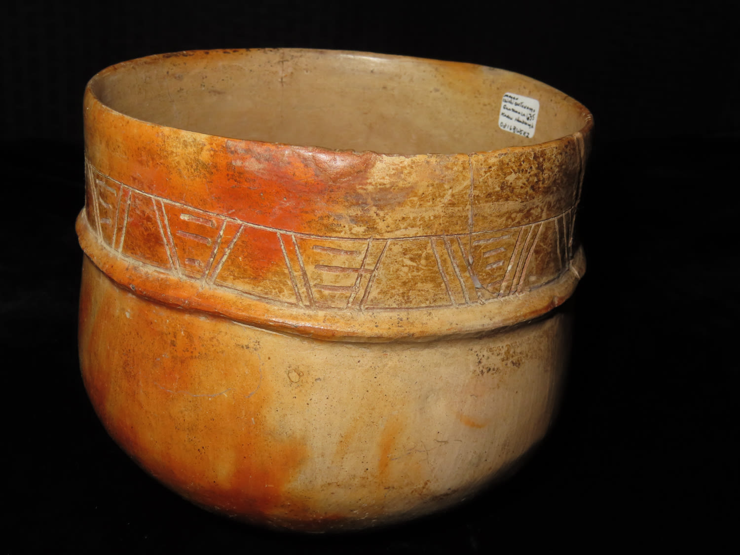 6″ ENGRAVED MAYAN POTTERY BOWL FROM GUATEMALA, EX HERB MANGOLD, DENNIS DEROSEAR, BEAUTIFUL COLOR, PRESSURE CRACKED & GLUED