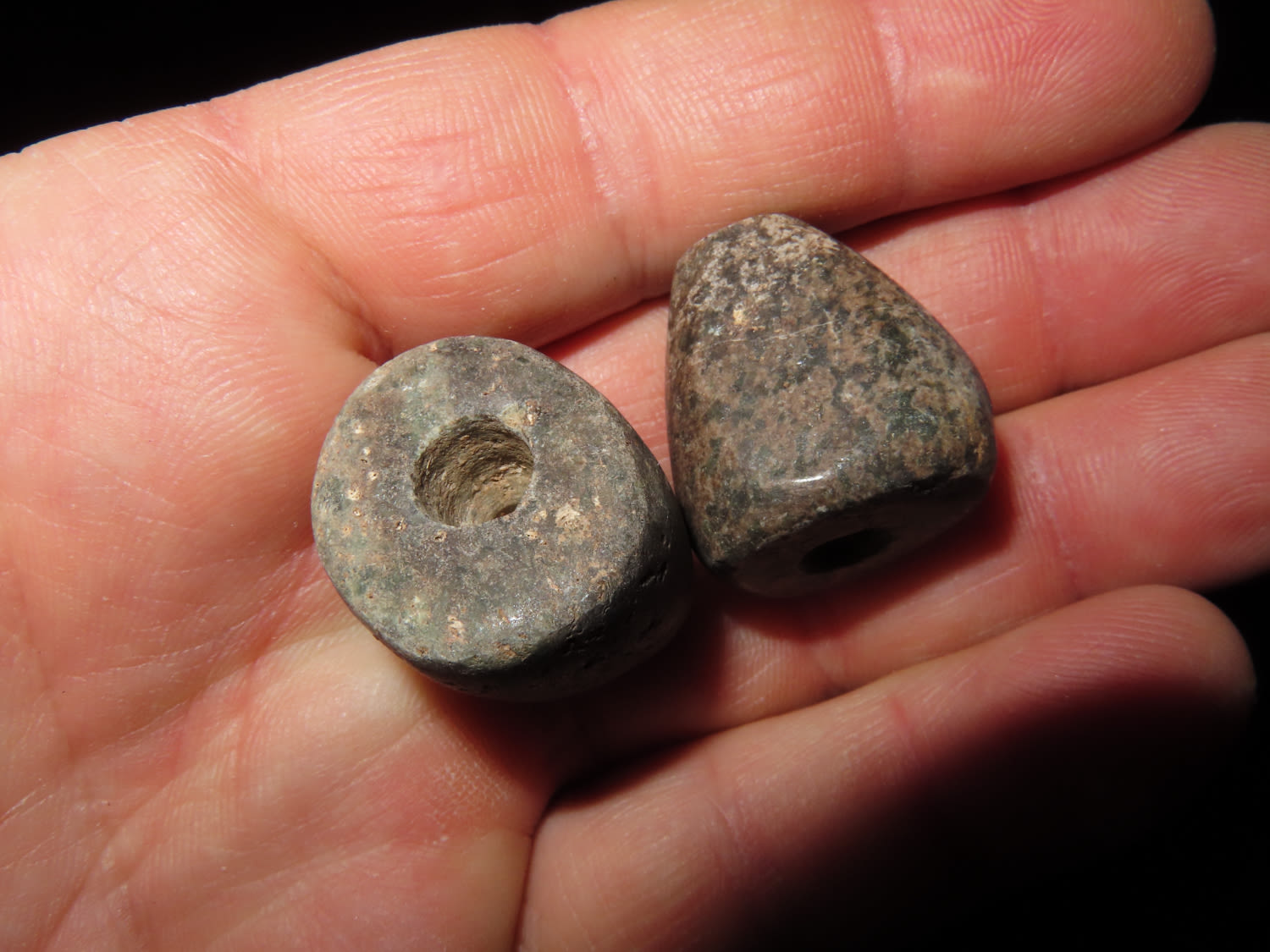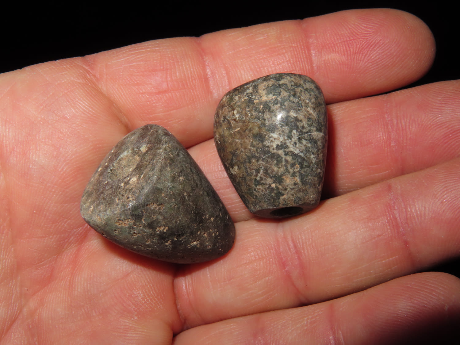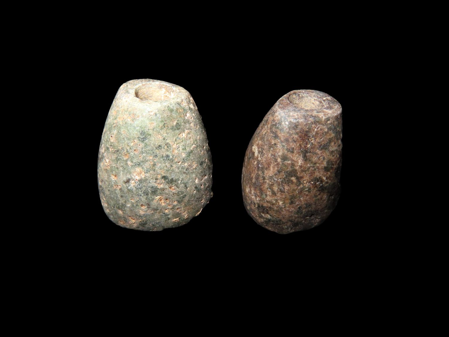 PAIR OF LARGE PRECOLUMBIAN MEZCALA DRILLED STONE BEADS, EX DR HARNER COLLECTION