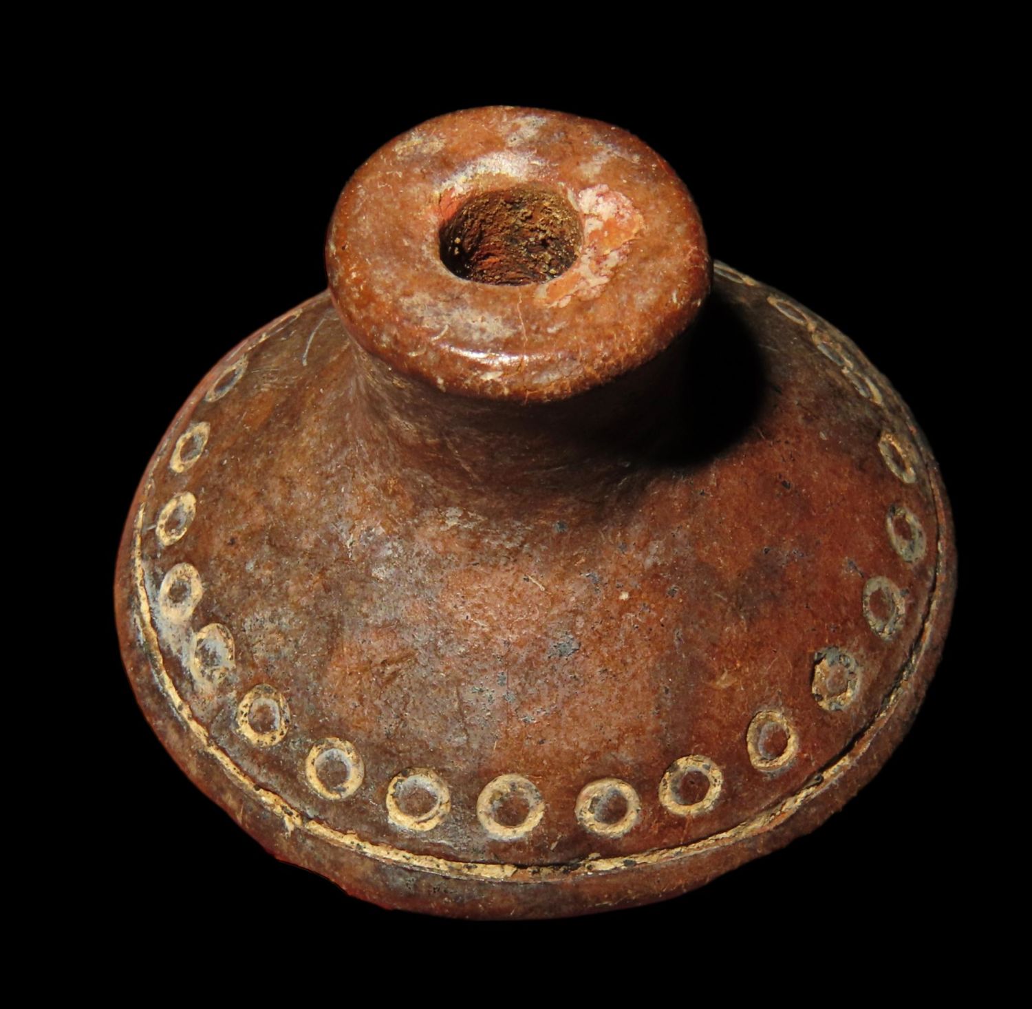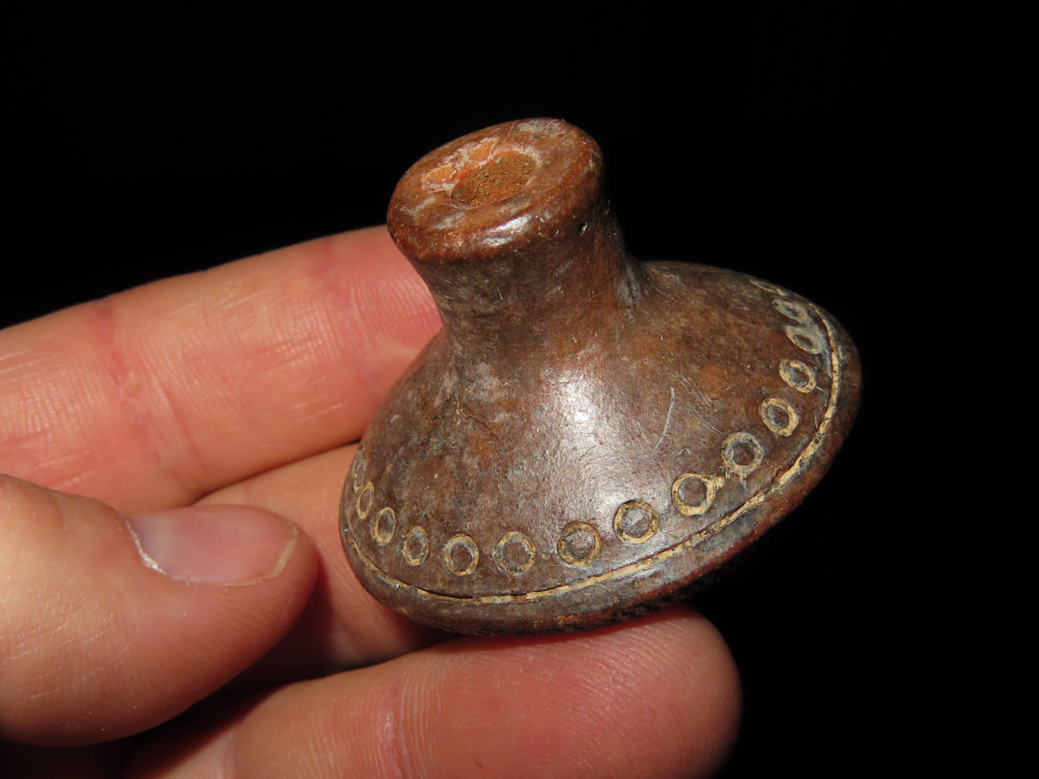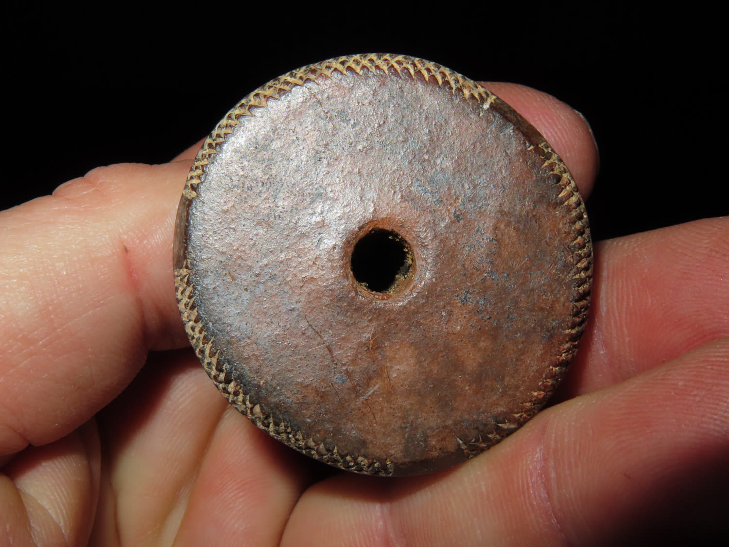 LARGE HEAVILY ENGRAVED SPINDLE WHORL BEAD, PRECOLUMBIAN POTTERY/CLAY FROM SOUTH AMERICA, CIRCA 800-1200 AD