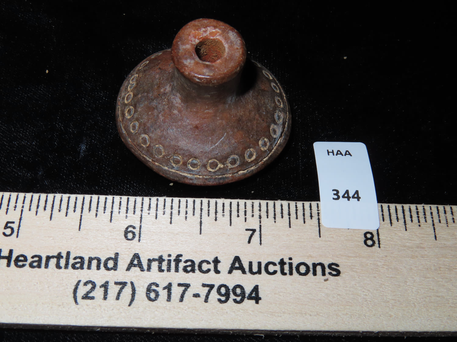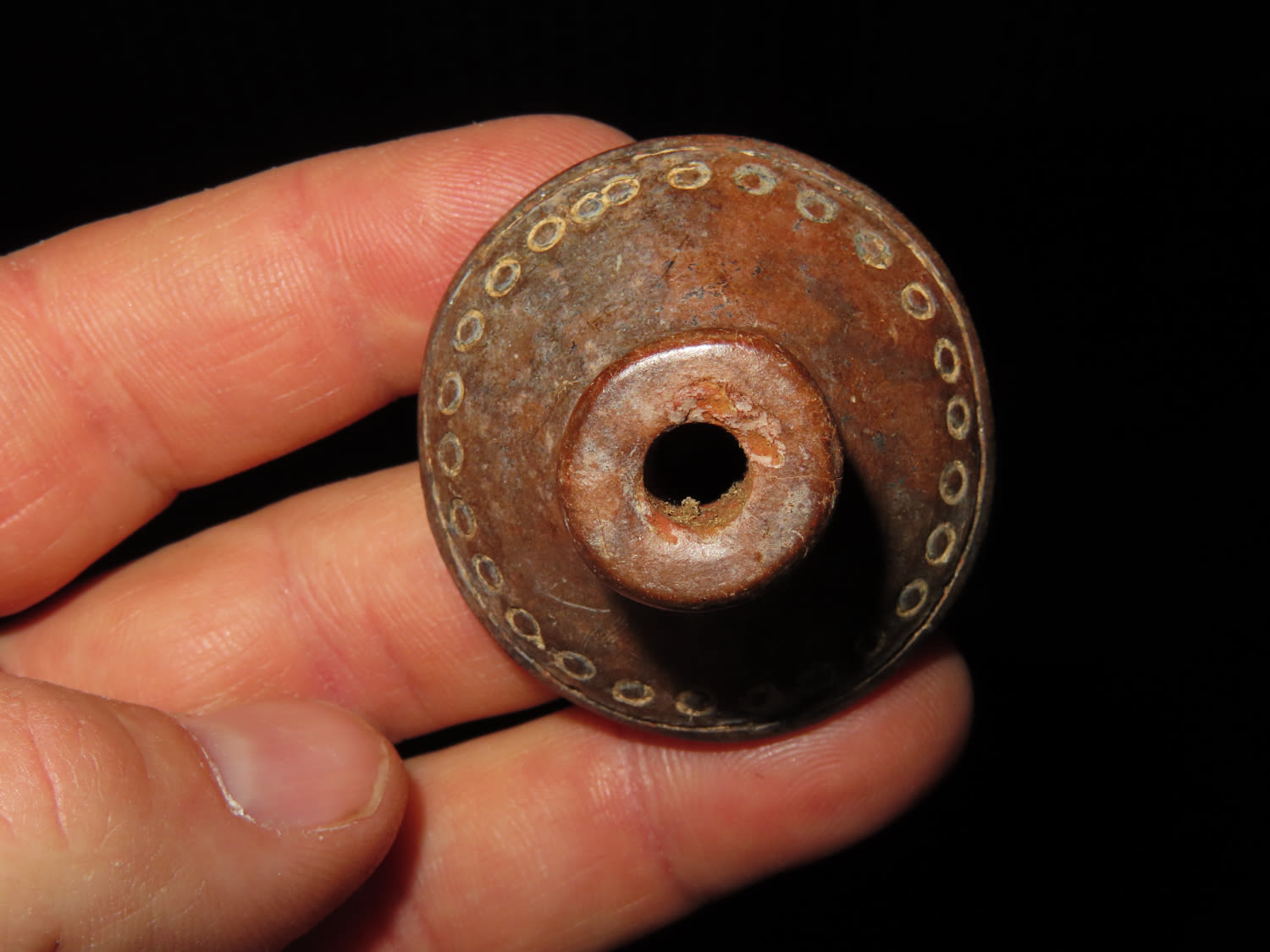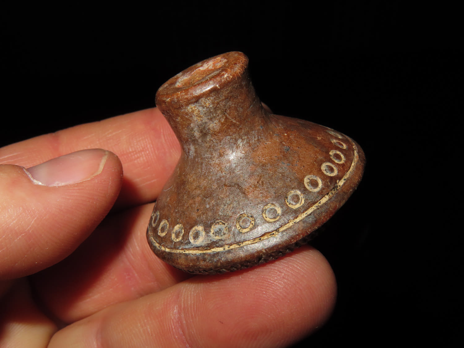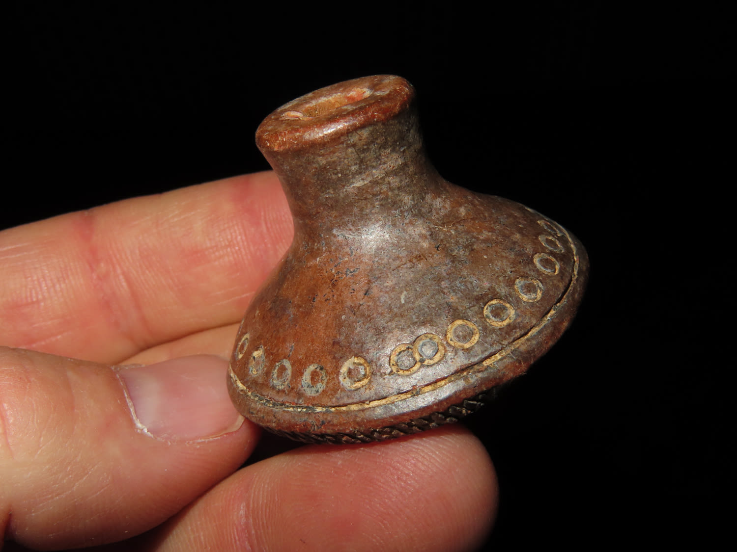 LARGE HEAVILY ENGRAVED SPINDLE WHORL BEAD, PRECOLUMBIAN POTTERY/CLAY FROM SOUTH AMERICA, CIRCA 800-1200 AD