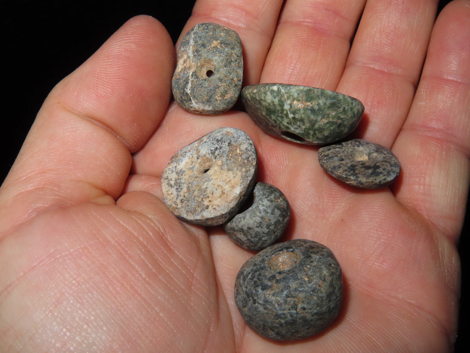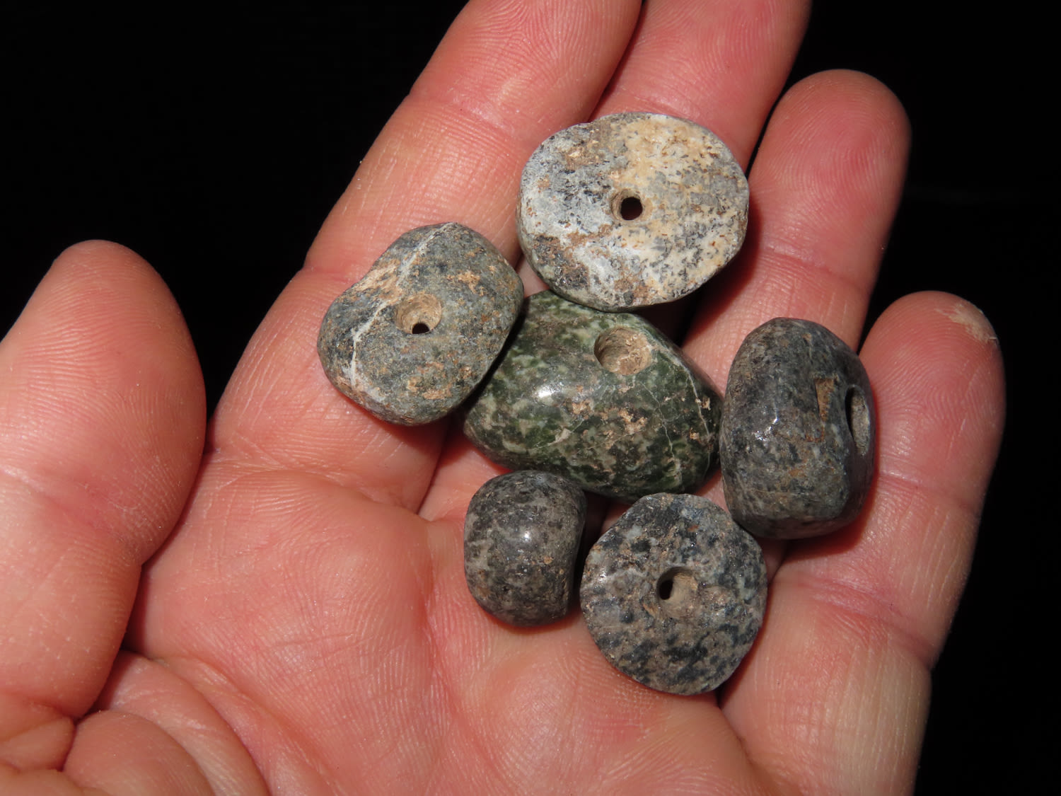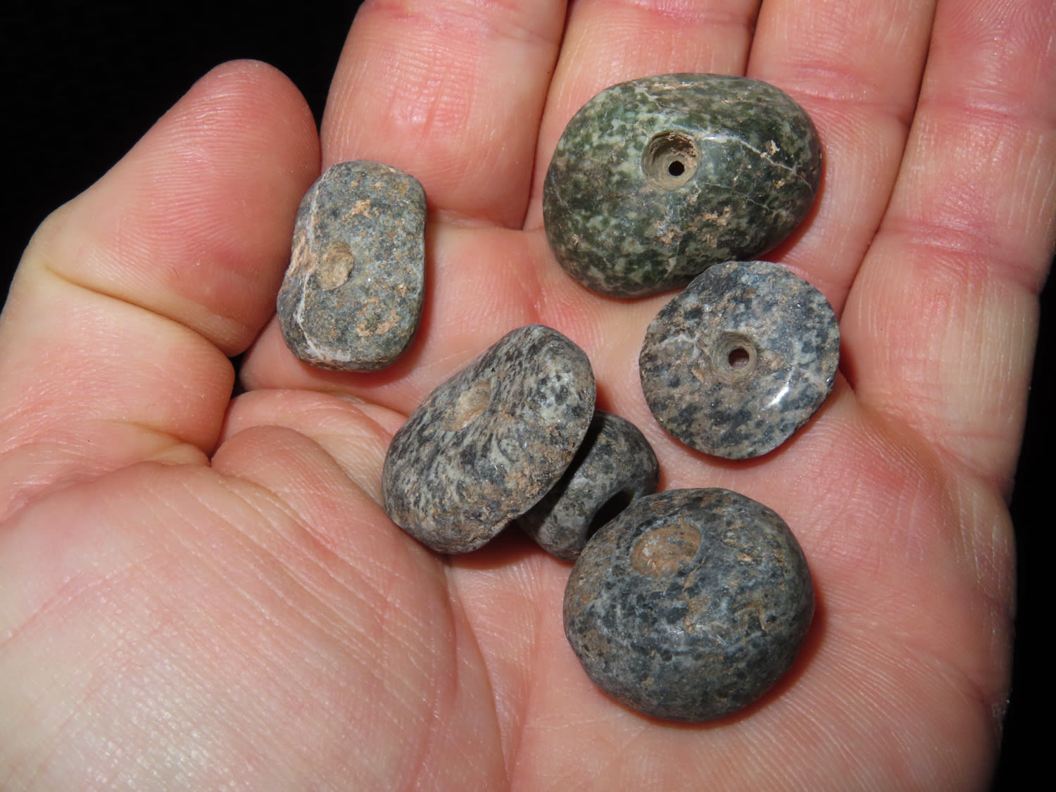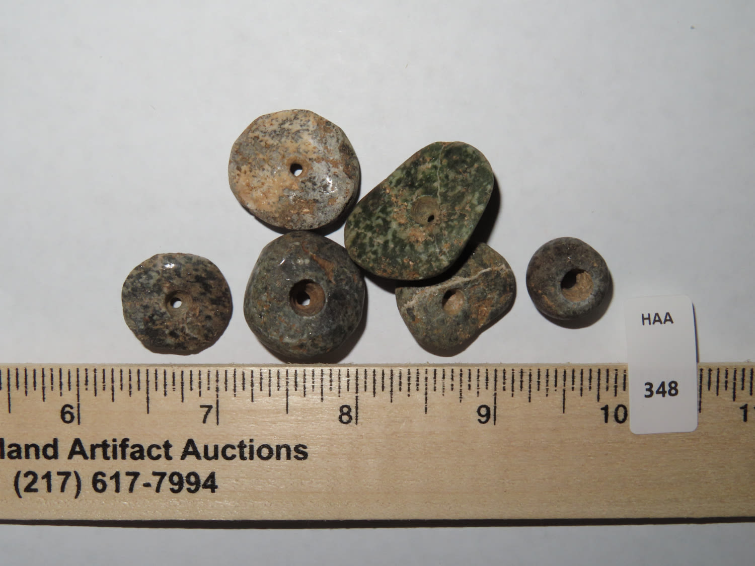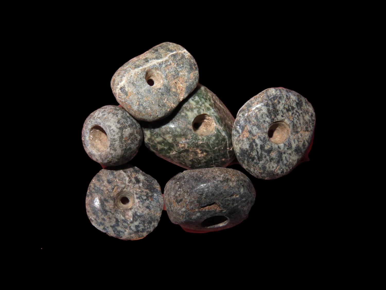 LOT OF 6 MEZCALA JADEITE BEADS FROM MEXICO, PRE-COLUMBIAN DRILLED STONE PENDANT, EX DR HARNER COLLECTION