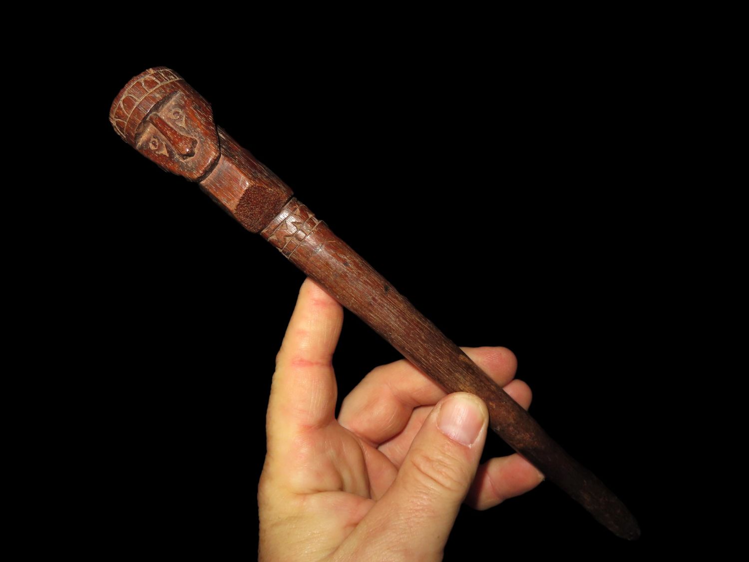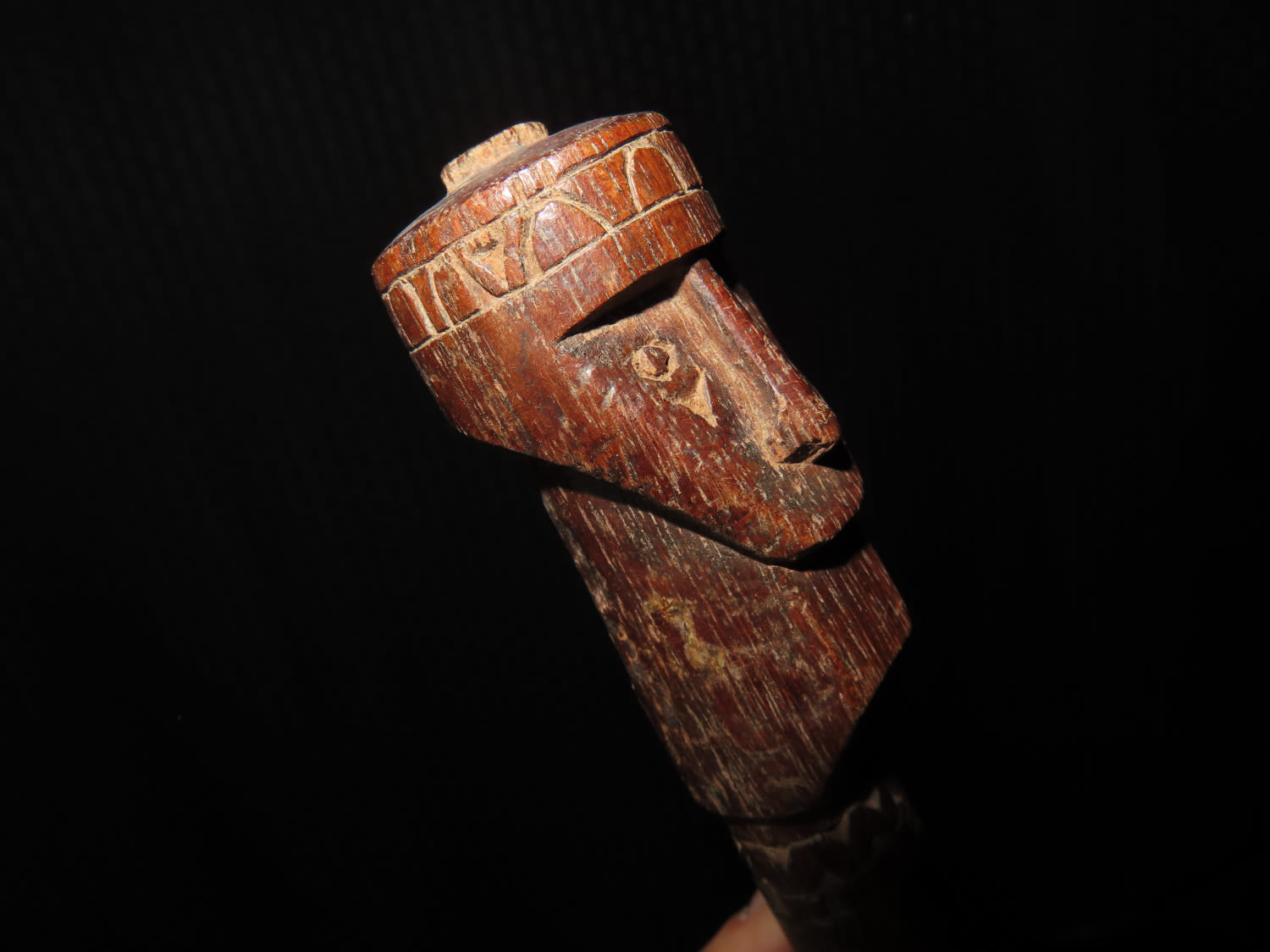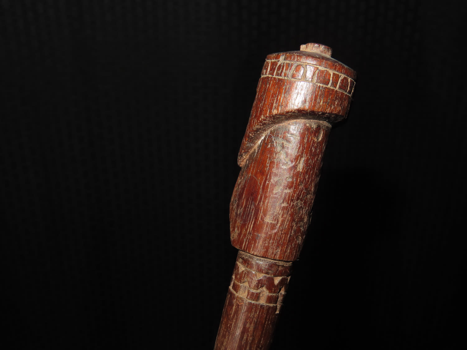 9 3/4″ INCA HUMAN EFFIGY FINIAL, ANCIENT PRECOLUMBIAN CARVED WOODEN ARTIFACT WITH GREAT DETAIL AND PATINA